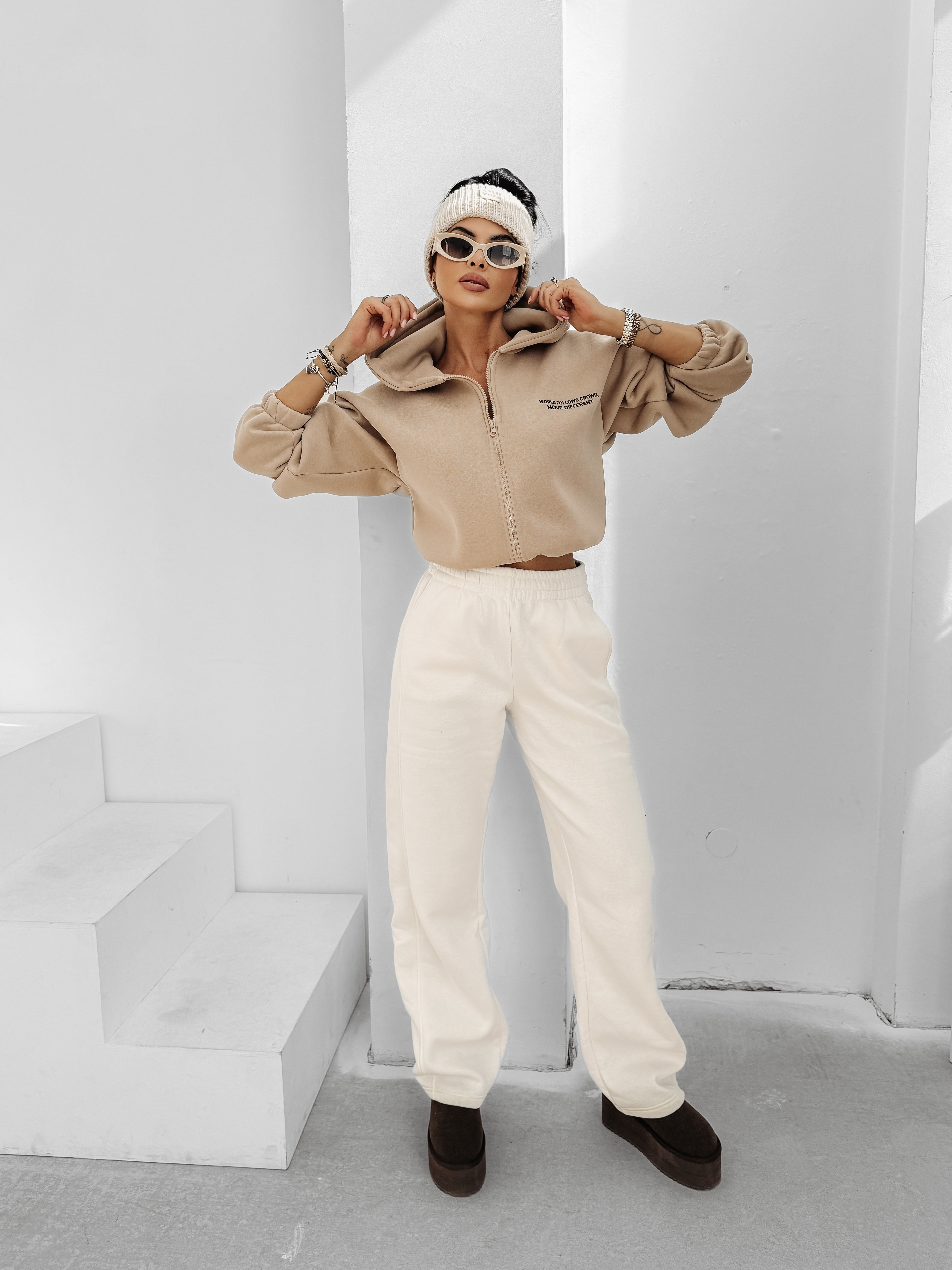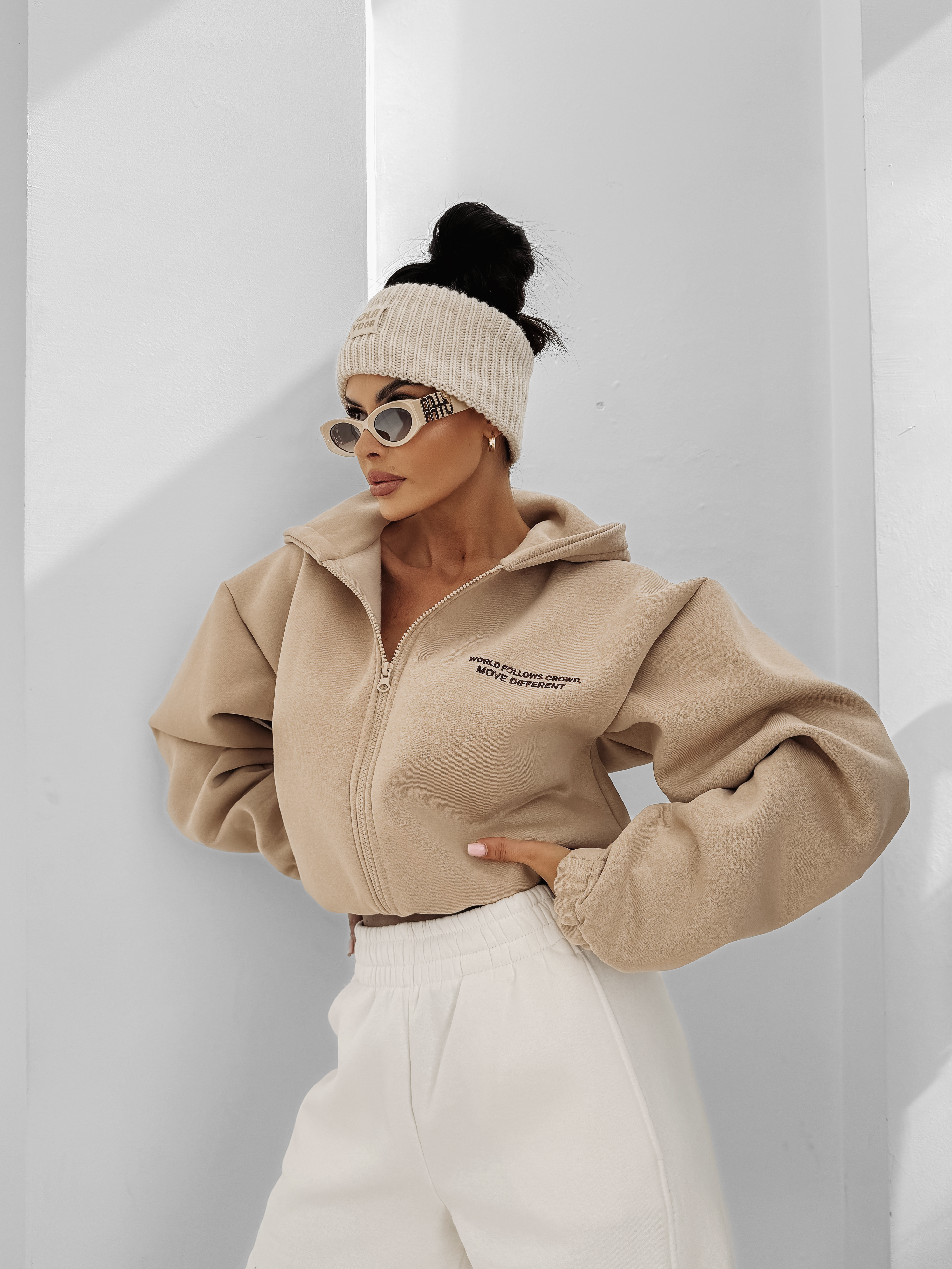 Casualowa bluza damska o kroju crop, zapinana na suwak. Wykonana z wysokiej jakości bawełny. Posiada obszerny kaptur i delikatne ściągacze przy rękawach oraz na dole. Z przodu minimalistyczny napis WORLD IS YOURS z logo marki OLAVOGA. Na tyle obszerne logo brandu.