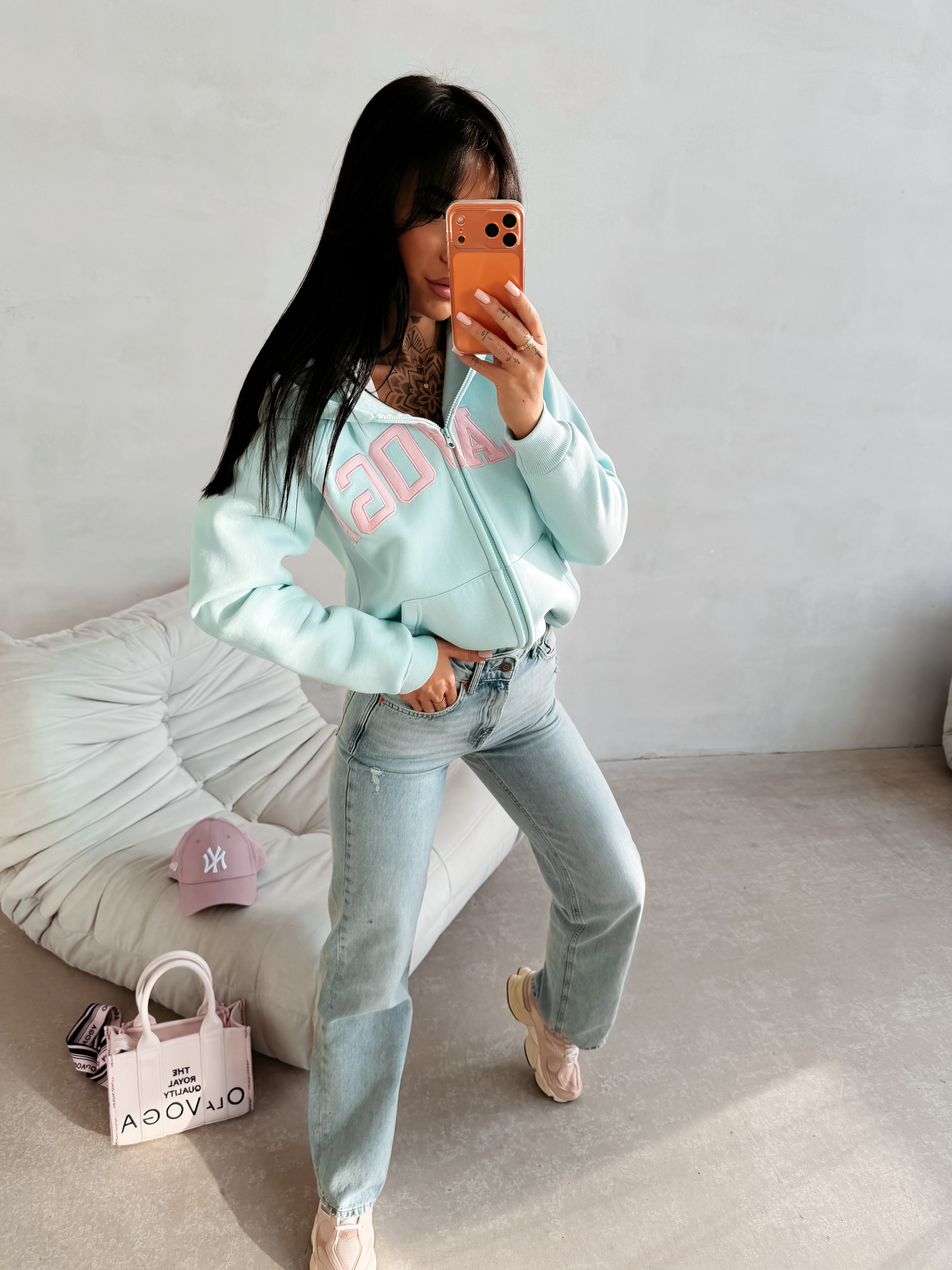 Casualowa bluza z kapturem o swobodnym, nowoczesnym kroju. Wykonana z wysokiej jakości, miękkiej w dotyku dzianiny bawełnianej. Na brzegach zastosowano elastyczne, prążkowane ściągacze. Funkcjonalne kieszenie po bokach. Na przodzie obszerny, starannie wykonany haft z logo marki OLAVOGA. Idealna propozycja dla Niej i dla Niego