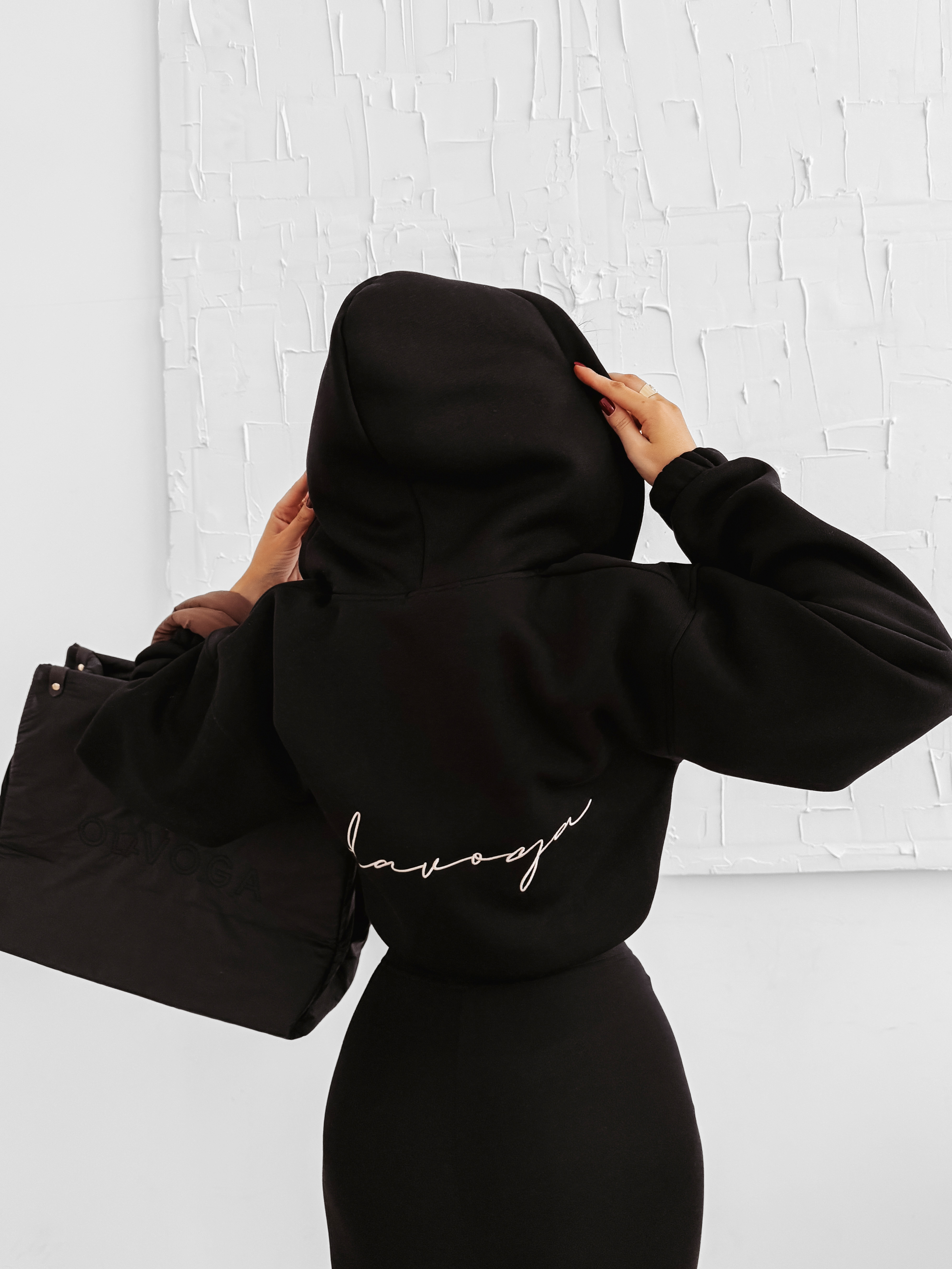 Sportowa, rozpinana bluza o krótszym kroju. Wykonana z miękkiej, przyjemnej w dotyku bawełny. Posiada kaptur, suwak na całej długości i ściągany troczek w pasie. Zarówno z przodu, jak i z tyłu zdobi haftowane logo marki OLAVOGA w eleganckim, pisanym stylu. Tworzy idealny komplet z legginsami SOLIN.
