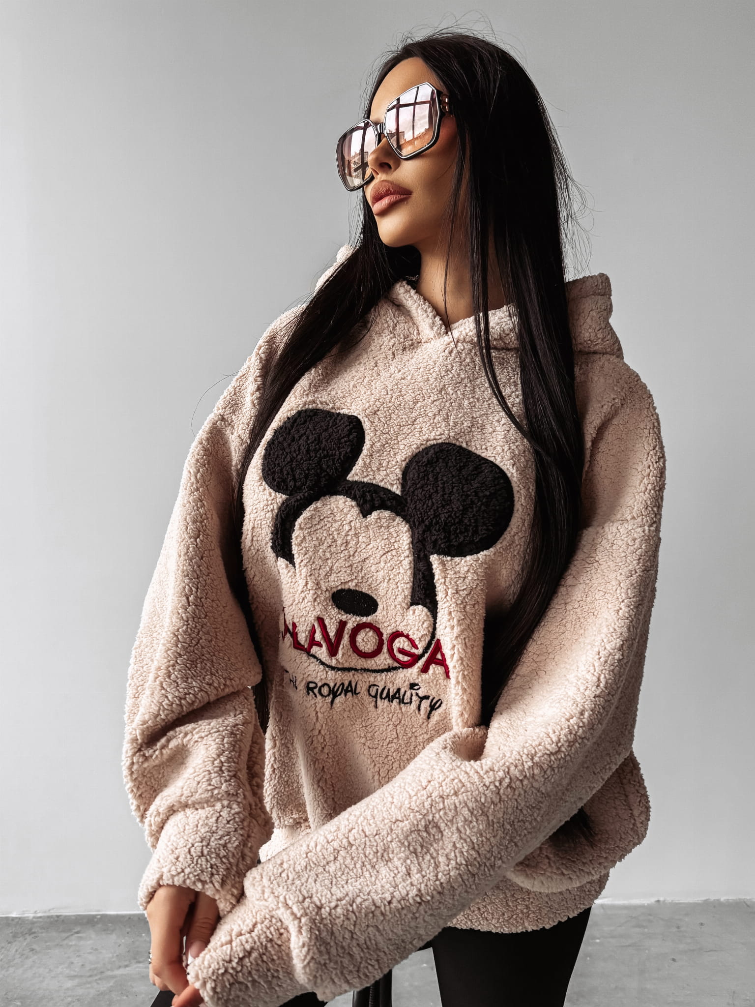 Delikatnie oversiz’owa bluza z kapturem. Wykonana z wysokiej jakości miękkiego w dotyku materiału, typu baranek. Na przodzie ciekawa kompozycja z kultową Myszką Miki oraz logo marki OLAVOGA z napisem THE ROYAL QUALITY.