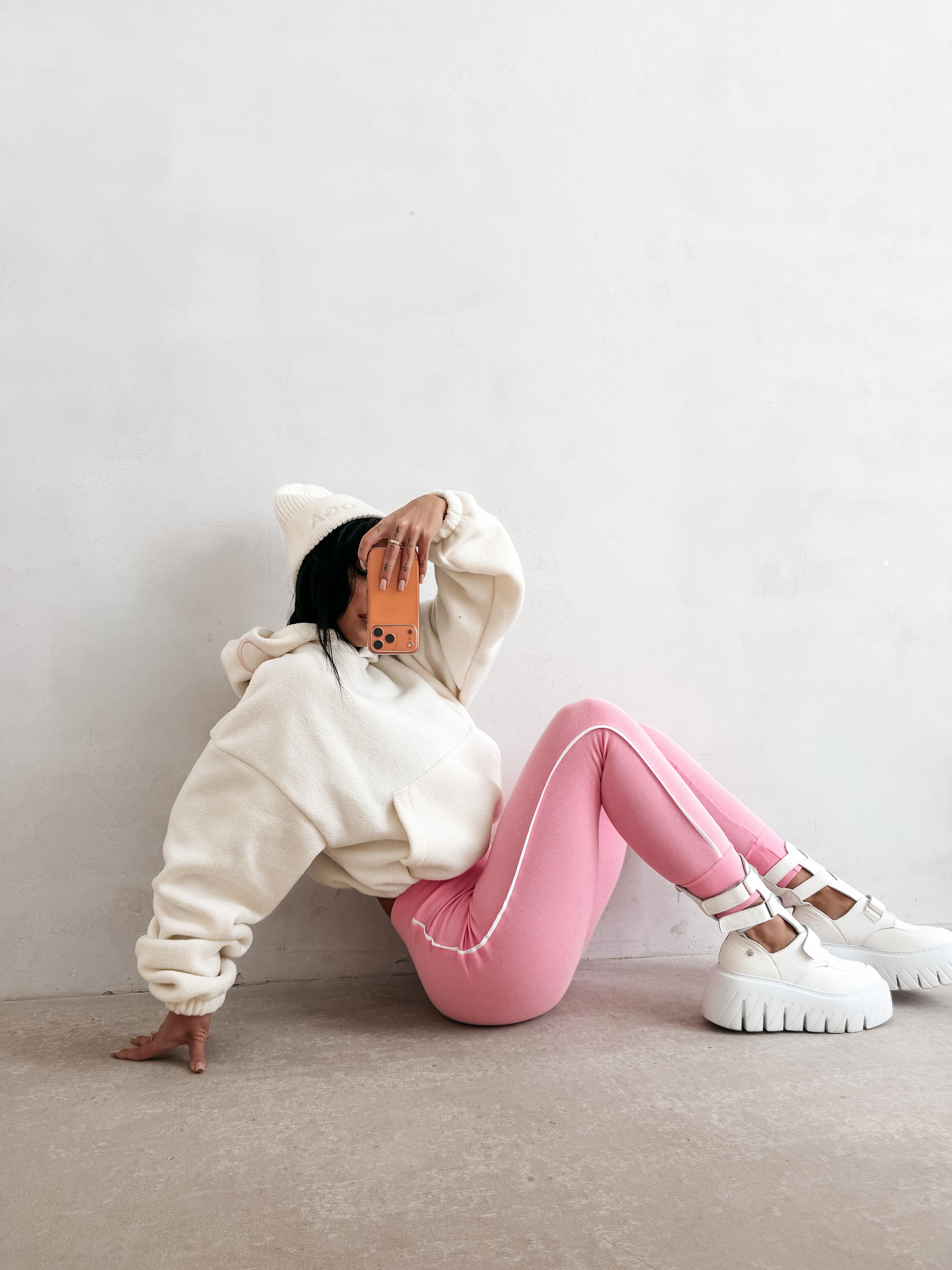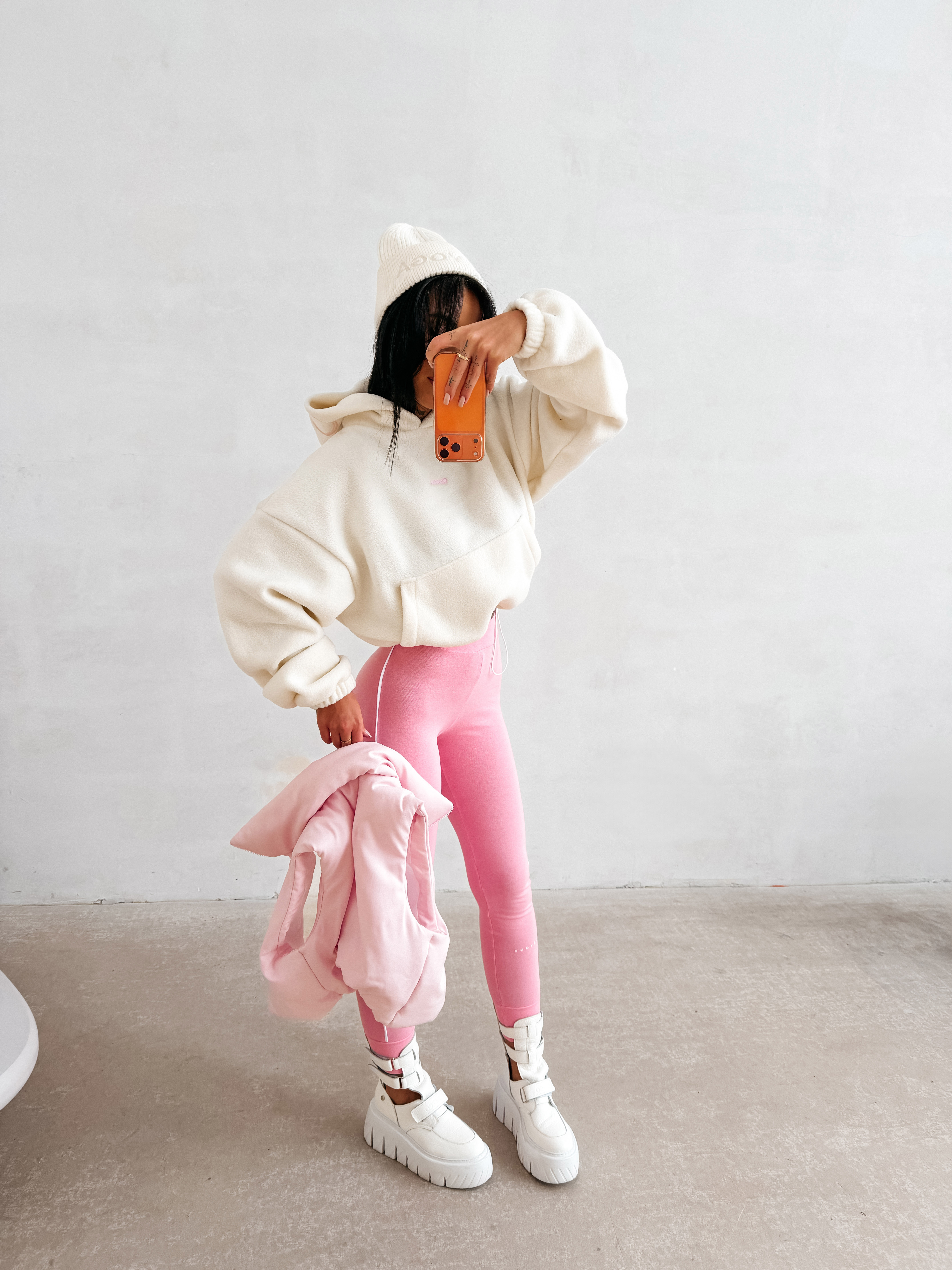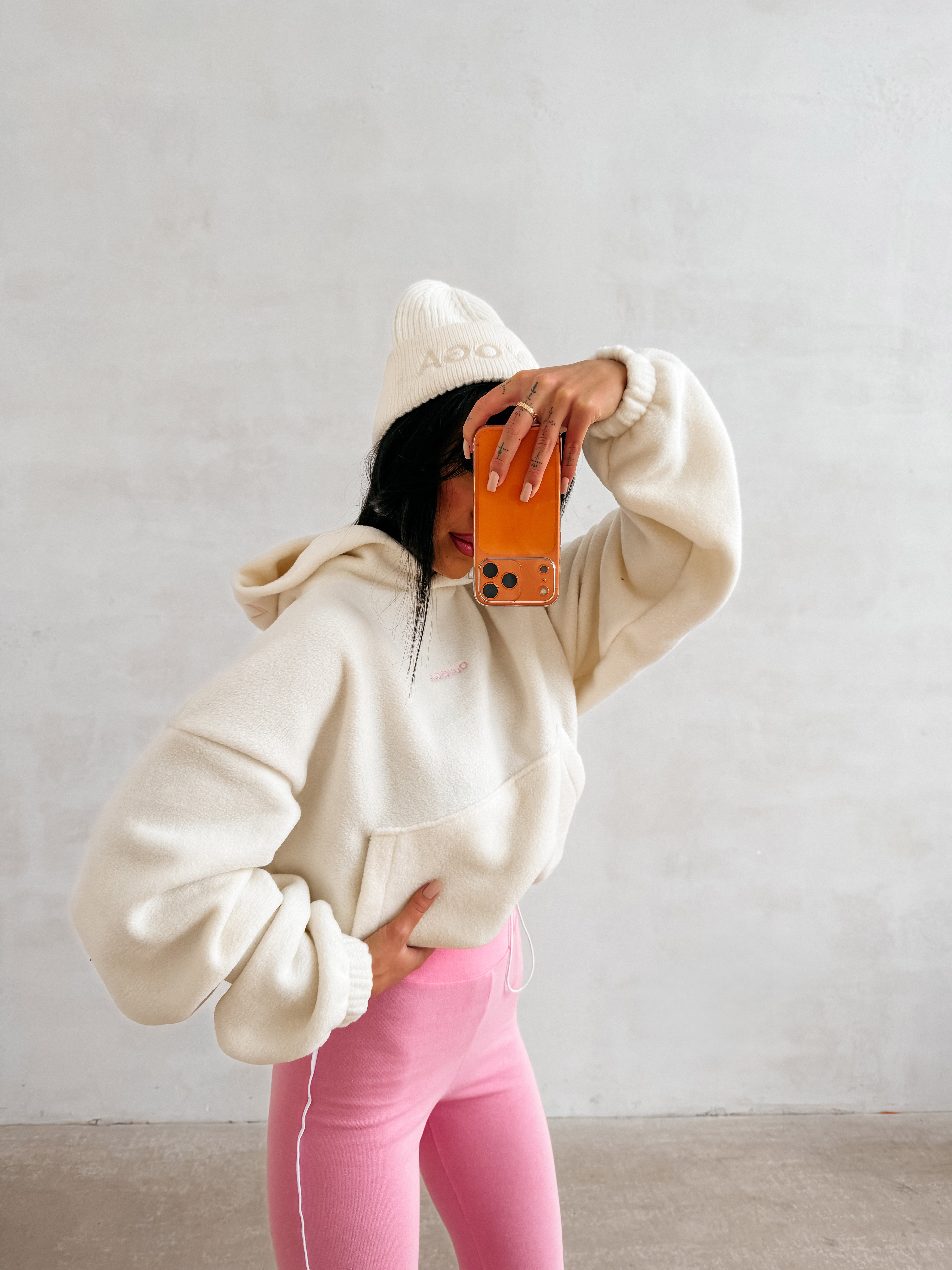 Casualowa bluza z kapturem. Model wykonany z miękkiego i przyjemnego w dotyku materiału, typu fleece. Krótszy, lekko oversize’owy krój. Bluza posiada obszerny kaptur, wykończony kontrastowym haftem z logo marki OLAVOGA. Na przodzie subtelne, haftowane logo brandu w minimalistycznej formie. Klasyczna kieszeń typu kangurka. Ściągacze na brzegach.