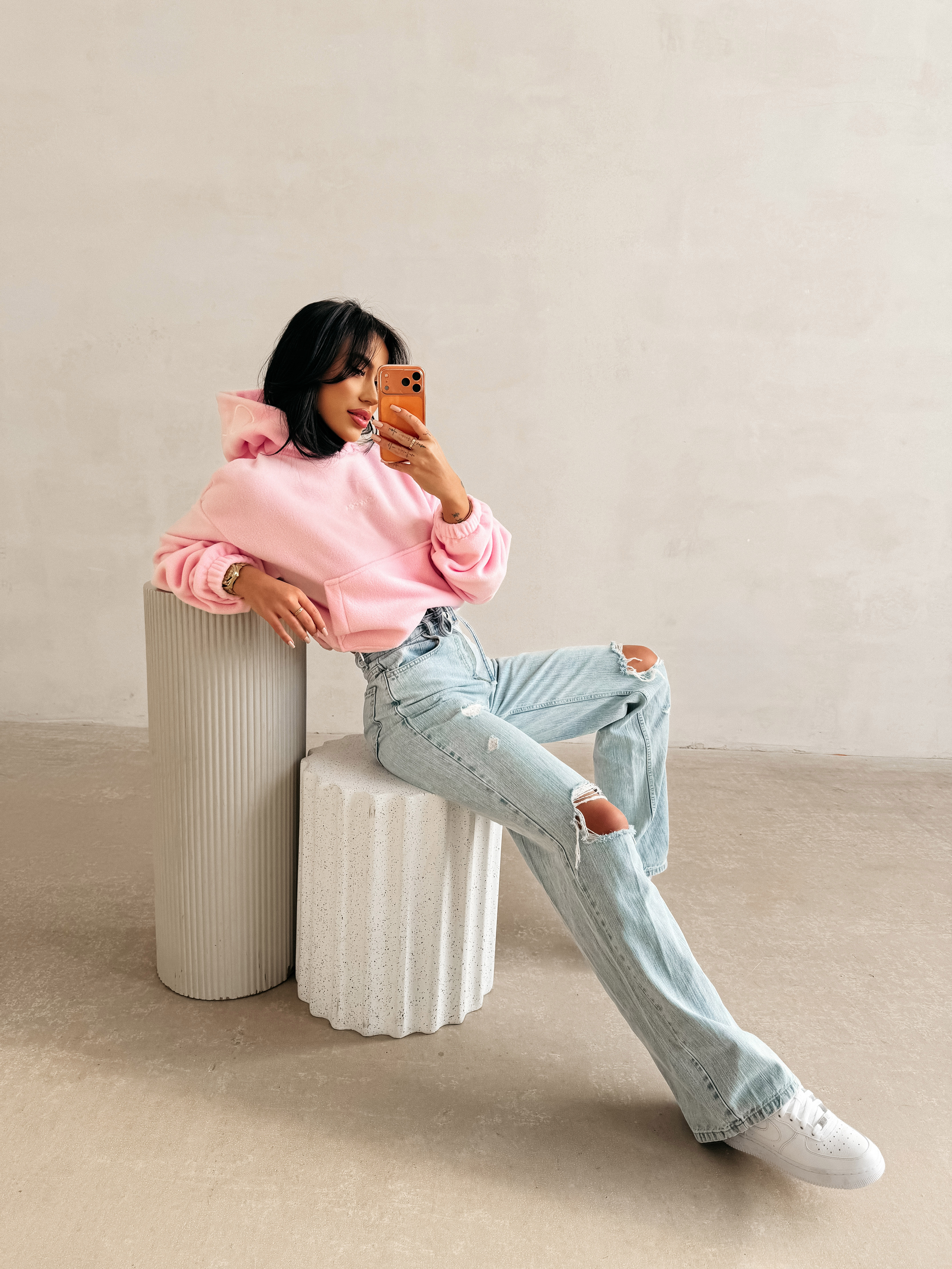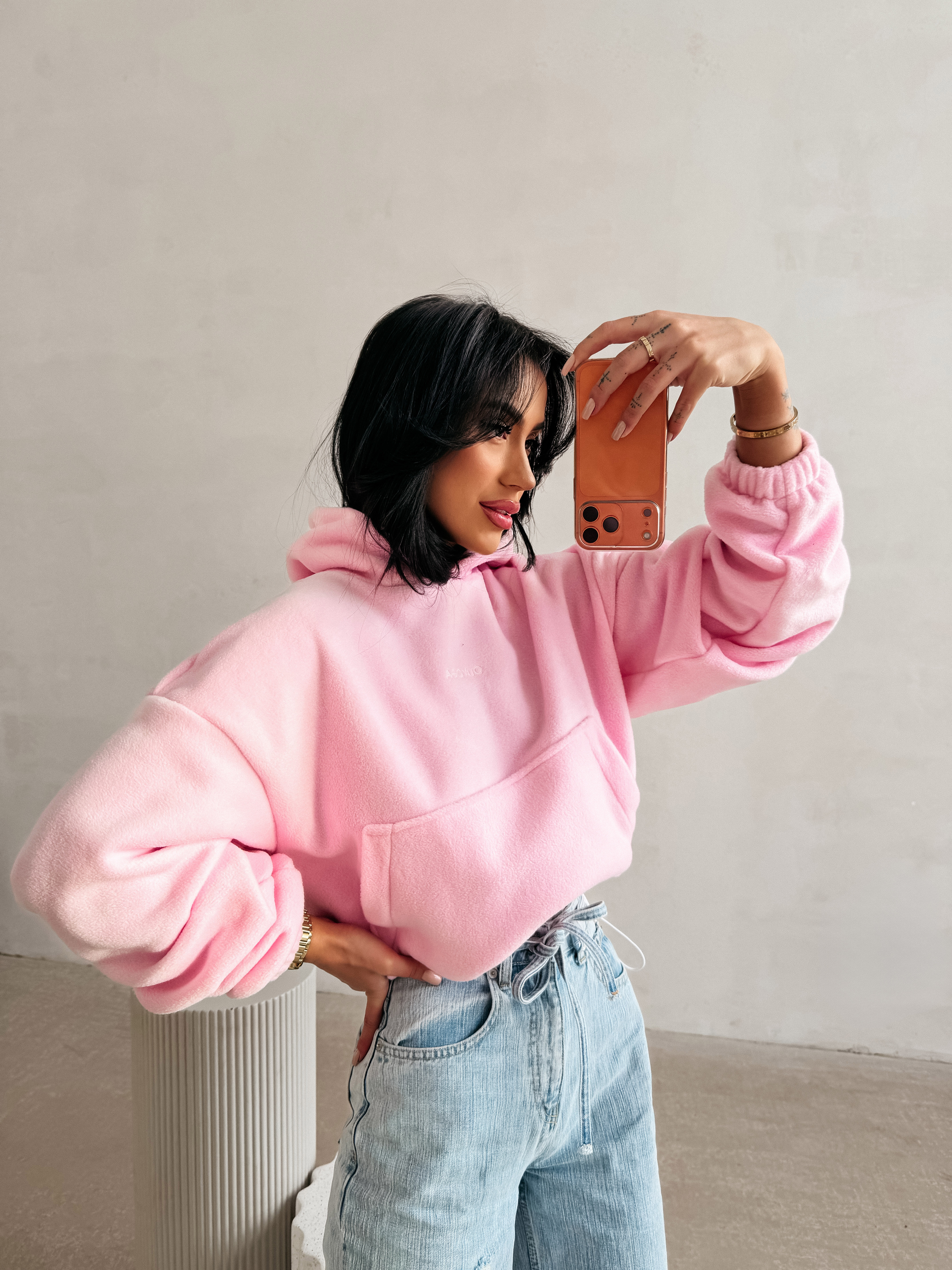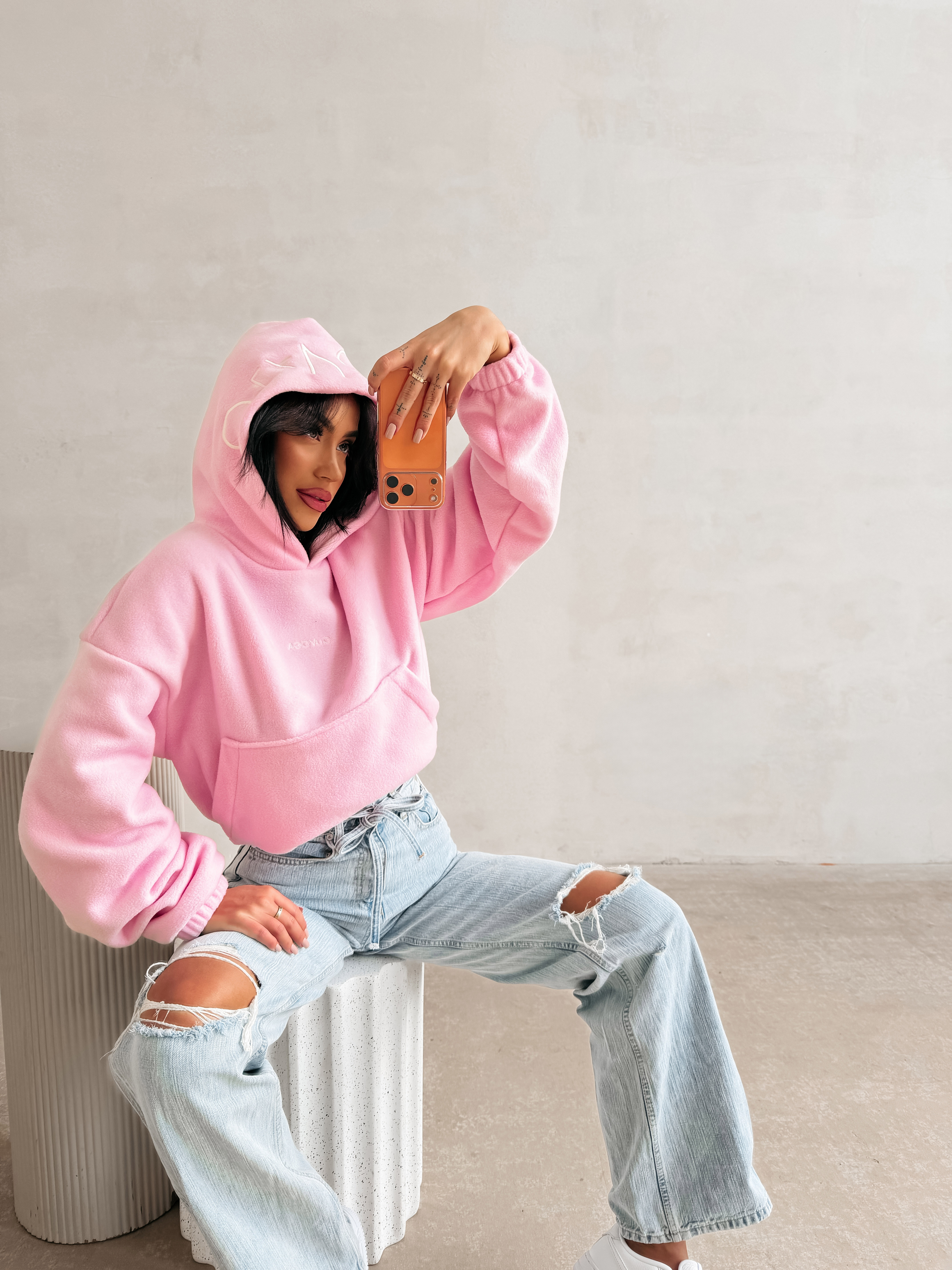 Casualowa bluza z kapturem. Model wykonany z miękkiego i przyjemnego w dotyku materiału, typu fleece. Krótszy, lekko oversize’owy krój. Bluza posiada obszerny kaptur, wykończony kontrastowym haftem z logo marki OLAVOGA. Na przodzie subtelne, haftowane logo brandu w minimalistycznej formie. Klasyczna kieszeń typu kangurka. Ściągacze na brzegach.