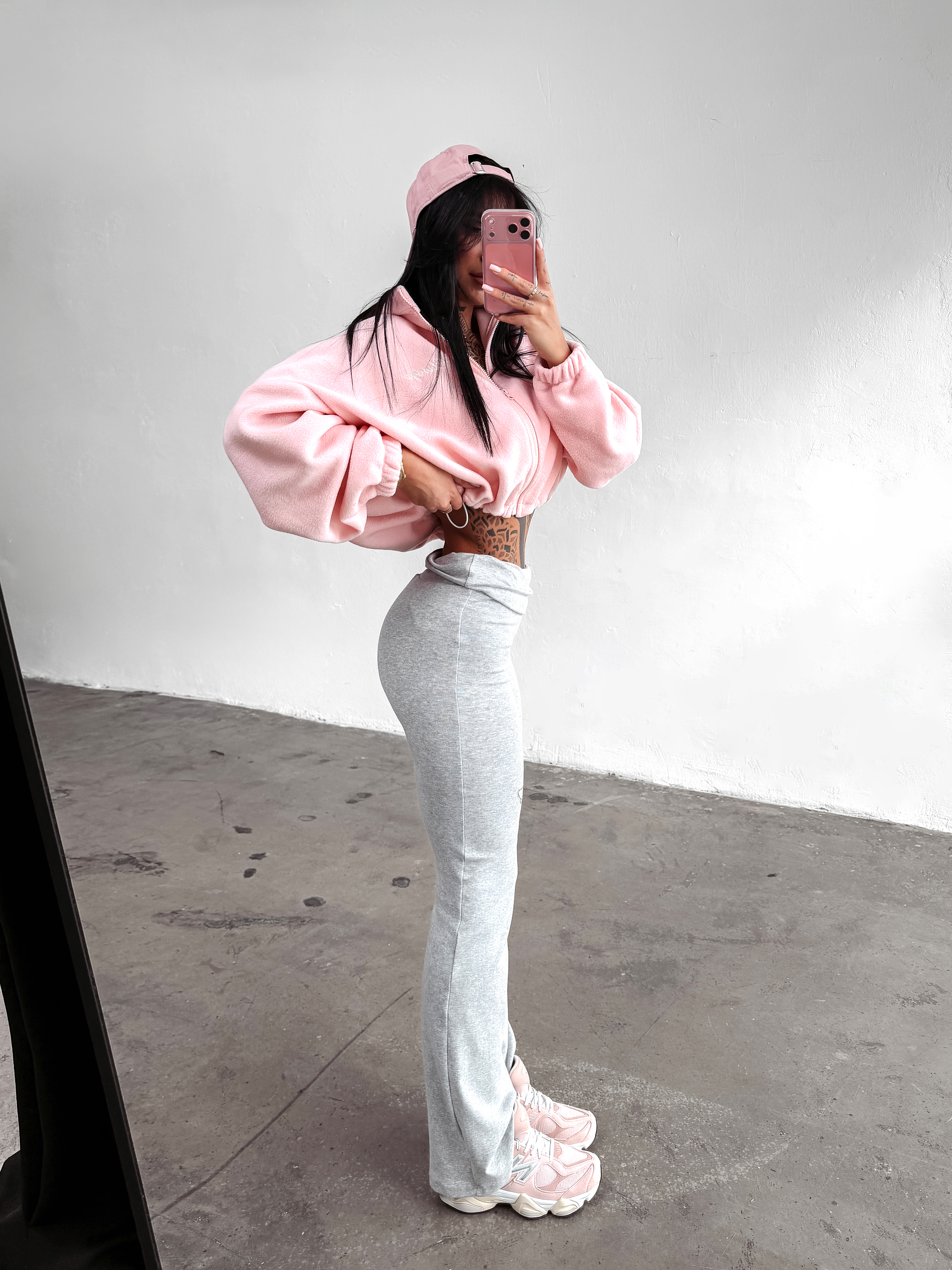 Casualowa, rozpinana bluza o krótszym kroju. Wykonana z wysokiej jakości, miękkiego i przyjemnego w dotyku materiału. Model z podwyższonym kołnierzem. Długie rękawy zakończone elastycznymi ściągaczami oraz subtelnie marszczony dół. Na przodzie minimalistyczny haft z logo marki OLAVOGA, a na plecach efektowny, duży haft z logo brandu.