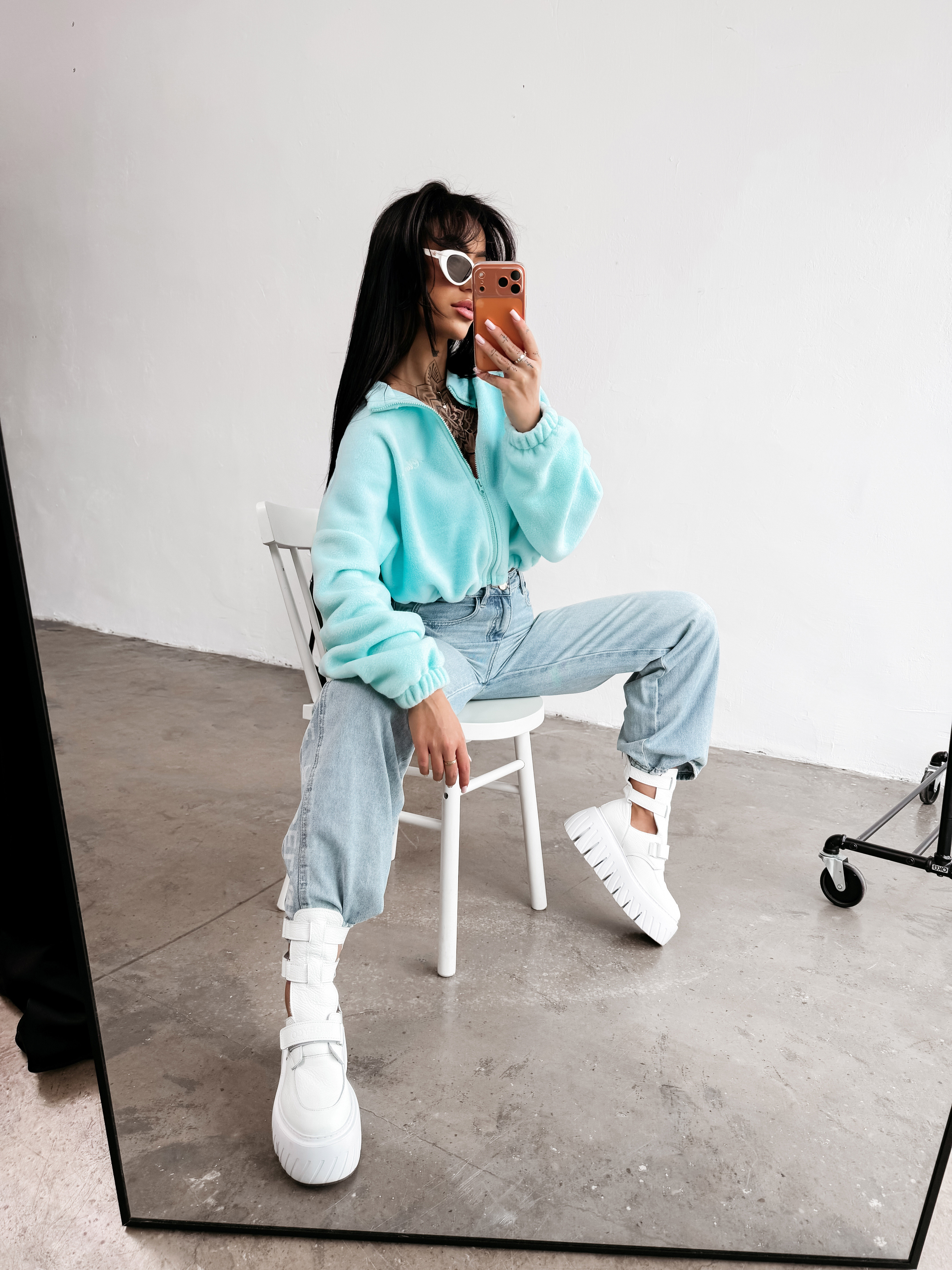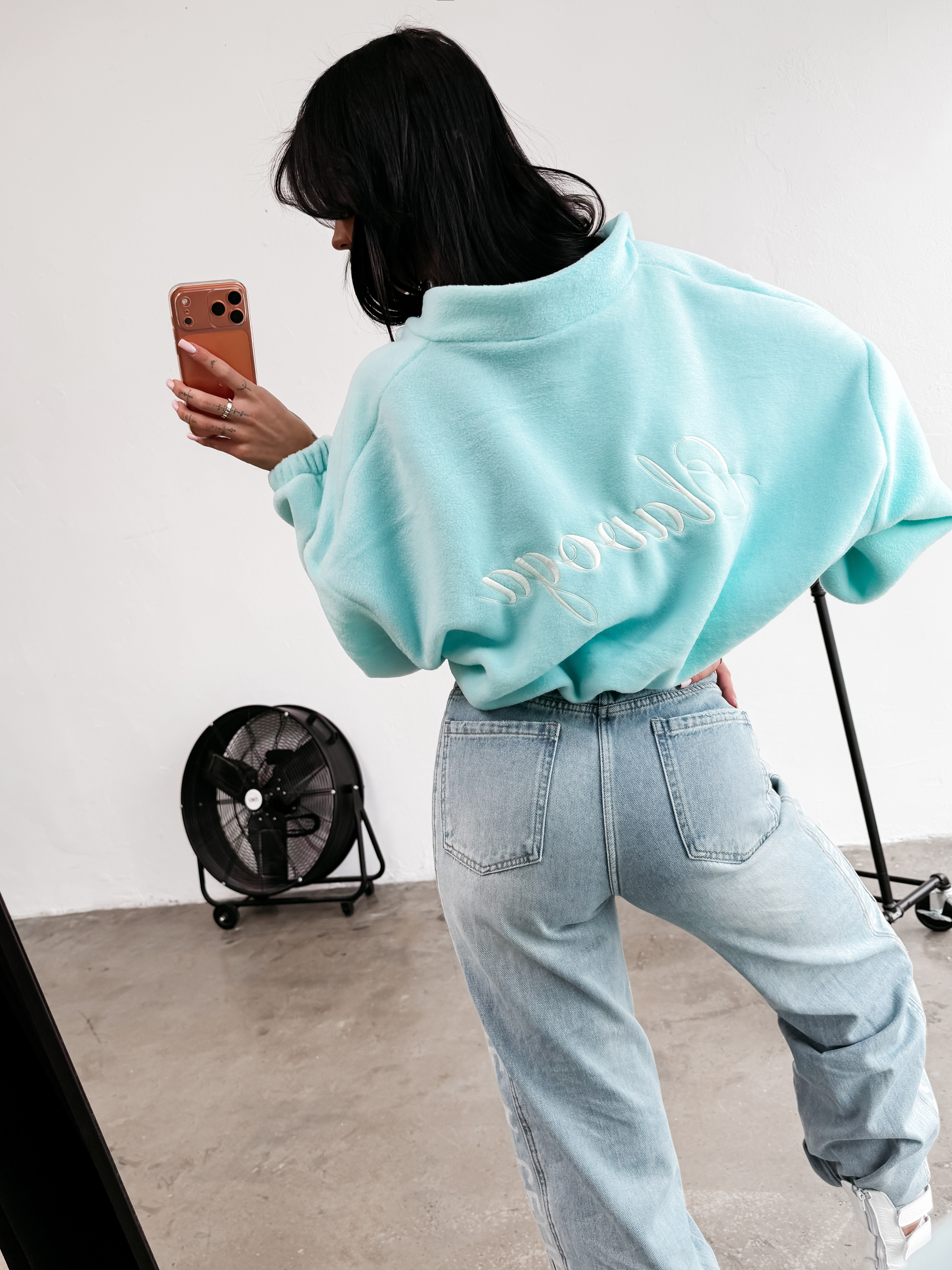 Casualowa, rozpinana bluza o krótszym kroju. Wykonana z wysokiej jakości, miękkiego i przyjemnego w dotyku materiału. Model z podwyższonym kołnierzem. Długie rękawy zakończone elastycznymi ściągaczami oraz subtelnie marszczony dół. Na przodzie minimalistyczny haft z logo marki OLAVOGA, a na plecach efektowny, duży haft z logo brandu.