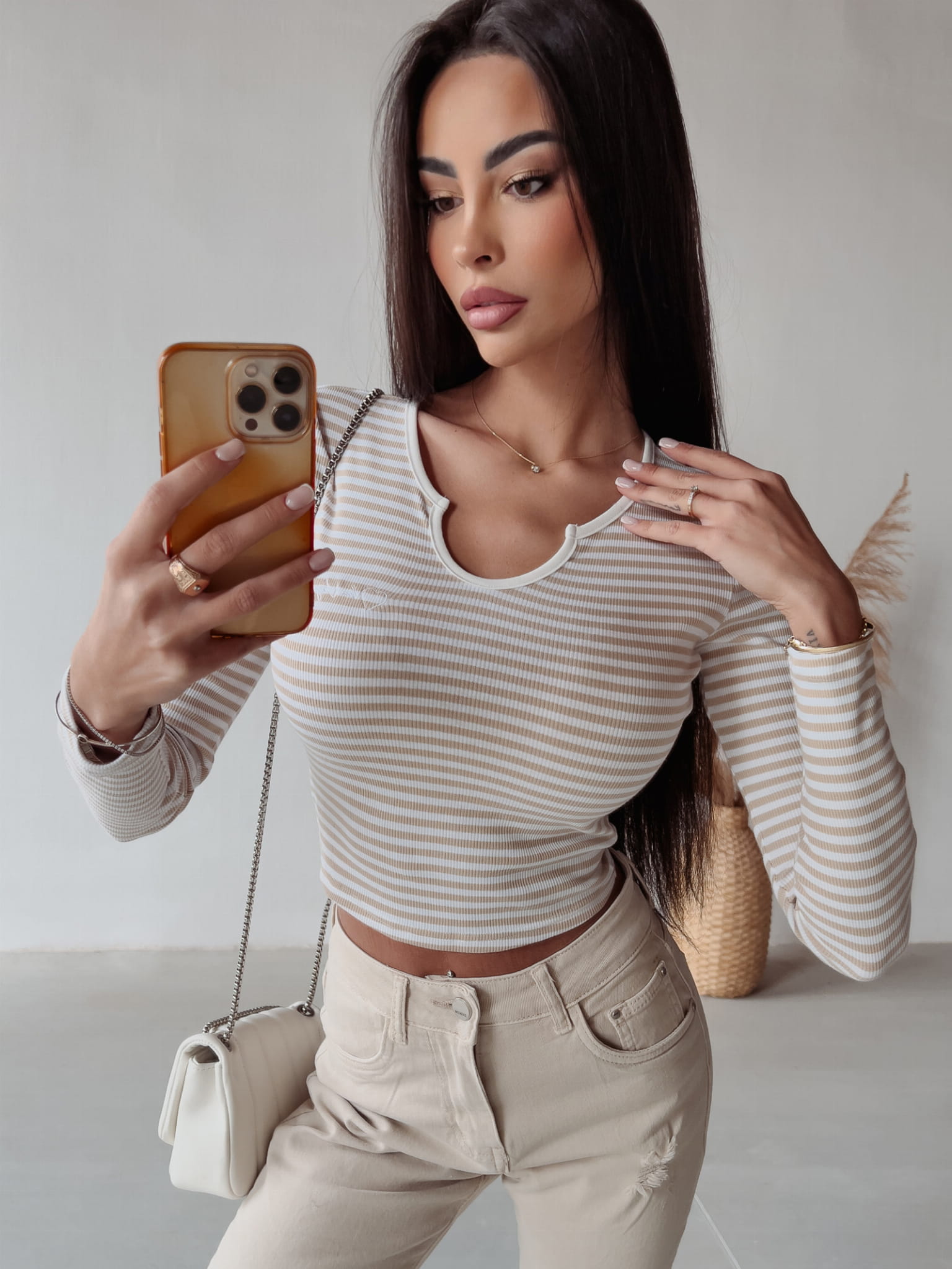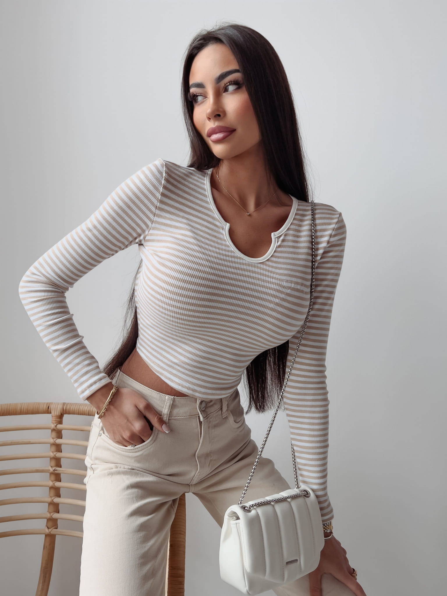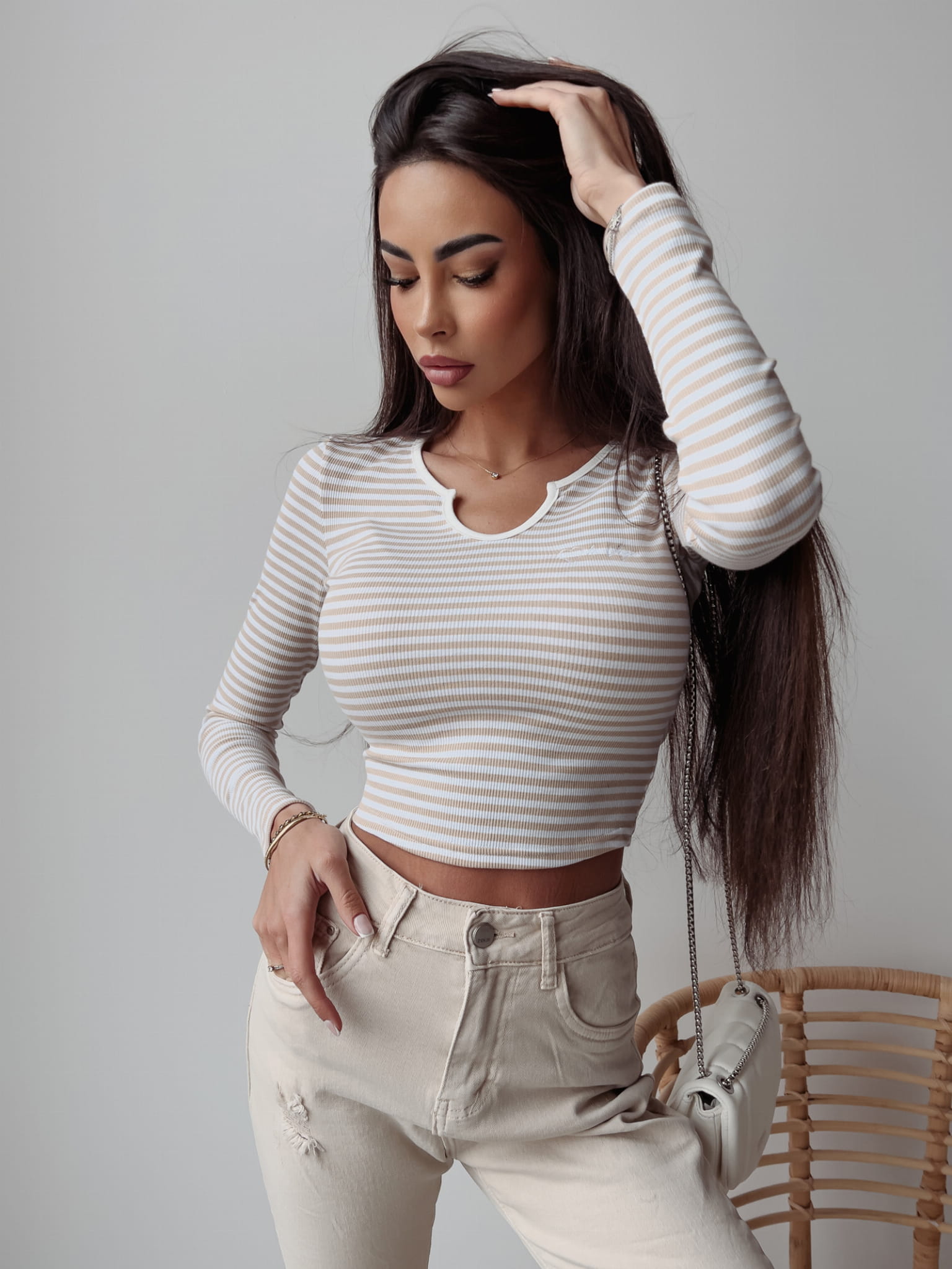 Dopasowany top z długim rękawem i głębokim, podkreślającym atuty sylwetki dekoltem. Materiał prążkowany, elastyczny, niezwykle przyjemny w dotyku. Wzór w paski pozwala na stworzenie wielu wiosennych stylizacji.