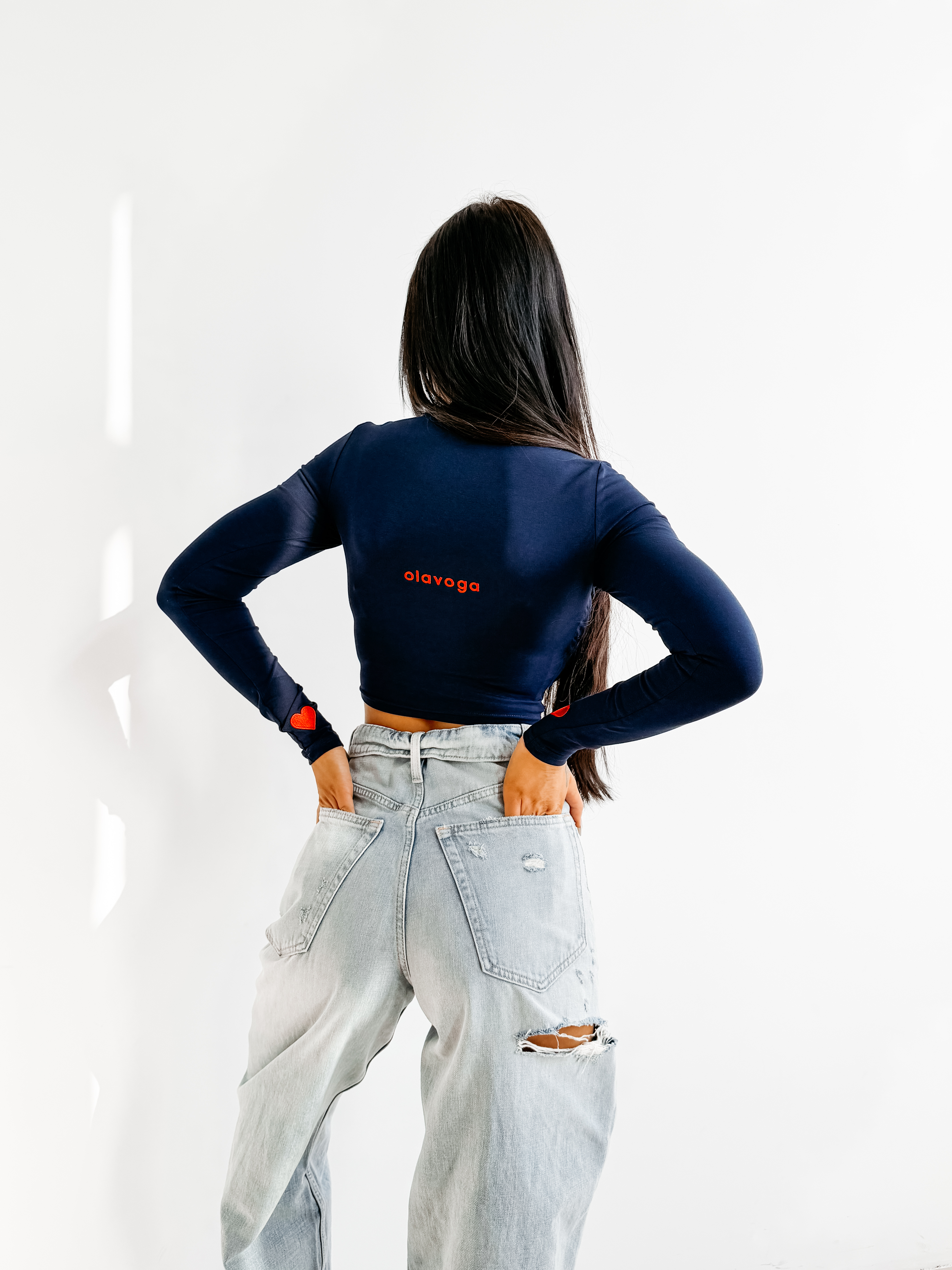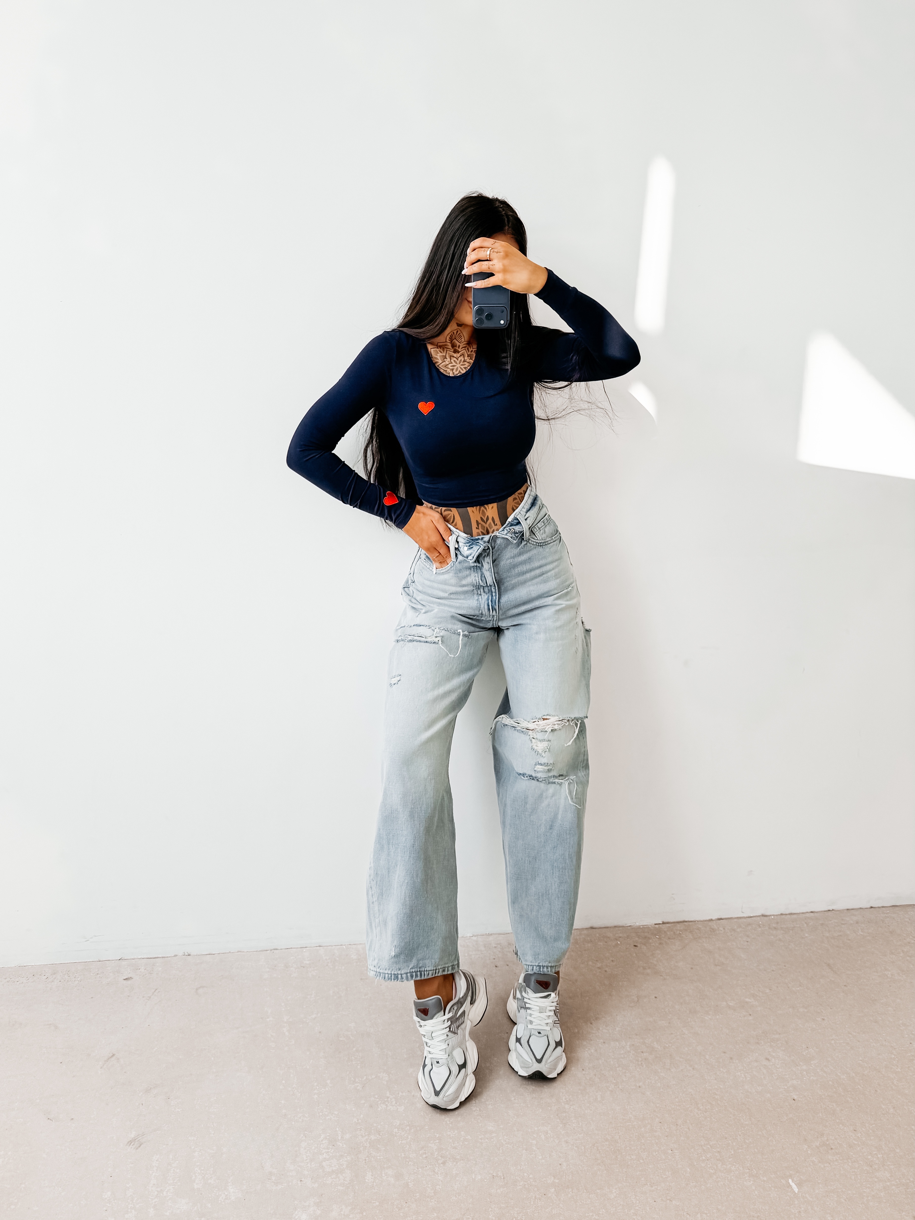 Dopasowany krój - elastyczna tkanina - fason slim fit/ cropped - okrągły dekolt - długi rękaw - na przodzie oraz rękawach kontrastowe aplikacje w kształcie serca - z tyłu subtelne logo