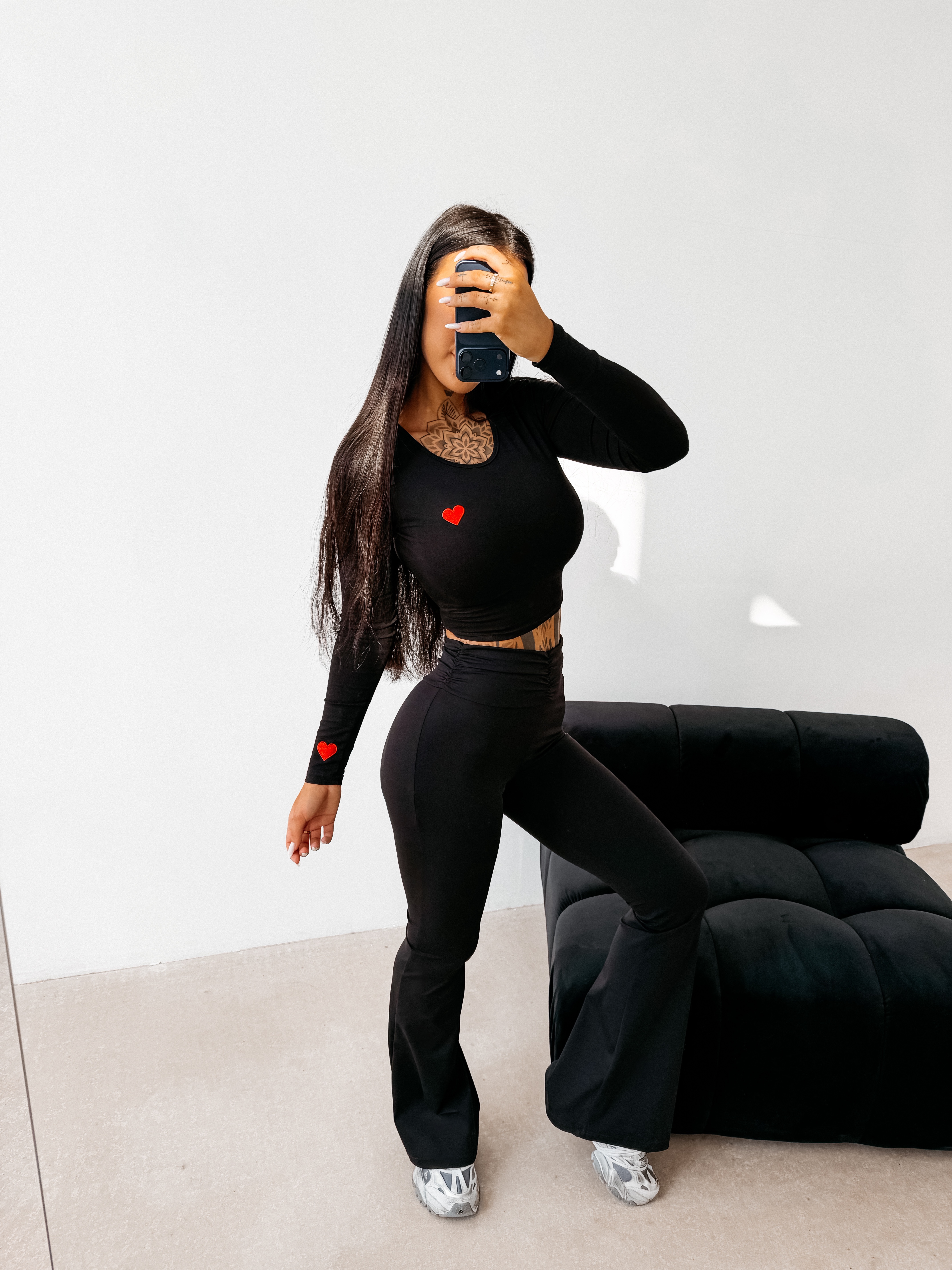 Dopasowany krój - elastyczna tkanina - fason slim fit/ cropped - okrągły dekolt - długi rękaw - na przodzie oraz rękawach kontrastowe aplikacje w kształcie serca - z tyłu subtelne logo