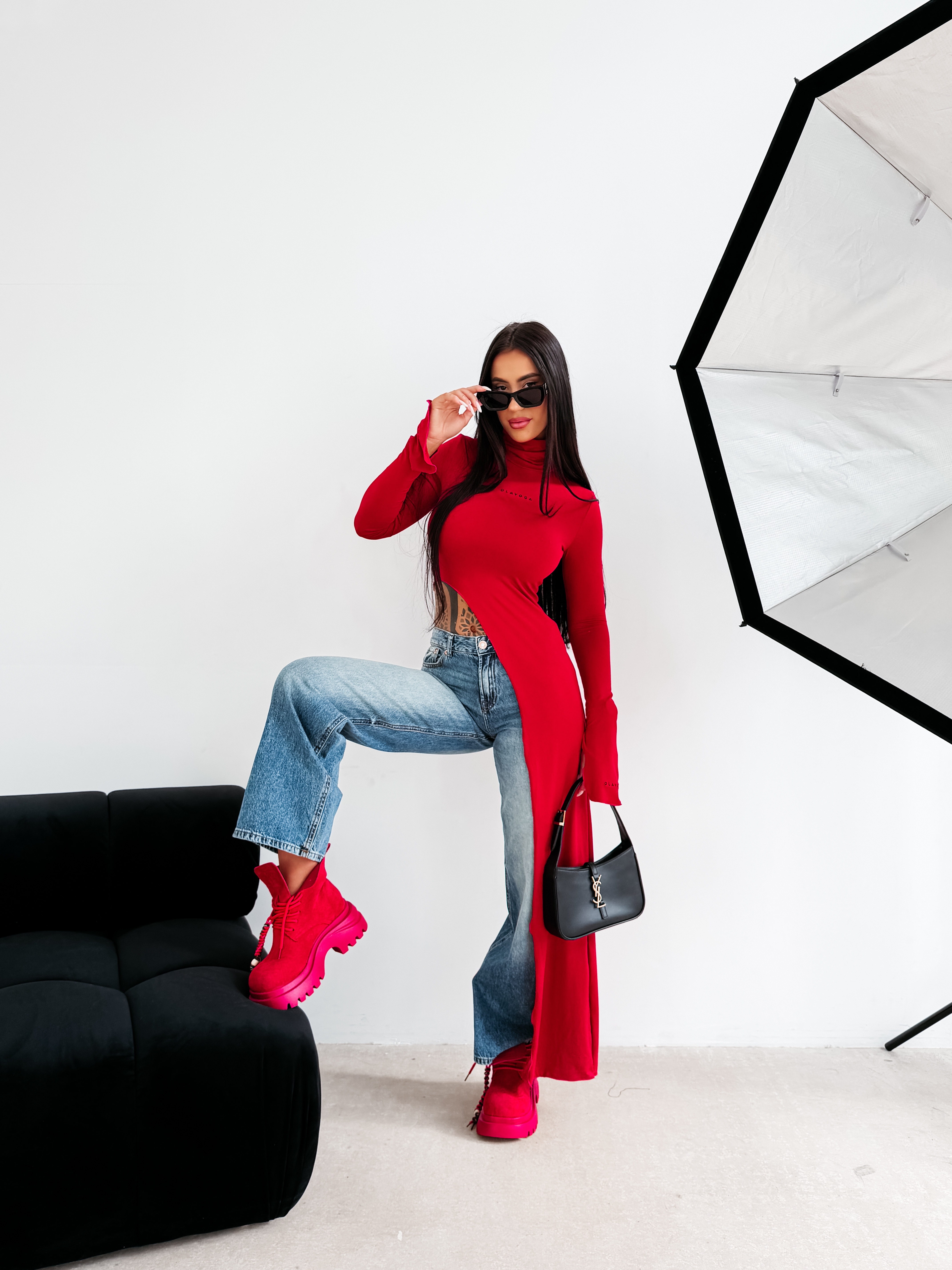 Dopasowany krój - elastyczna dzianina - długi rękaw zakończony rozcięciem - golf - asymetryczne wycięcie - brzegi wykończone mereżką - subtelne logowanie na przodzie i rękawach - efektowny kobiecy look