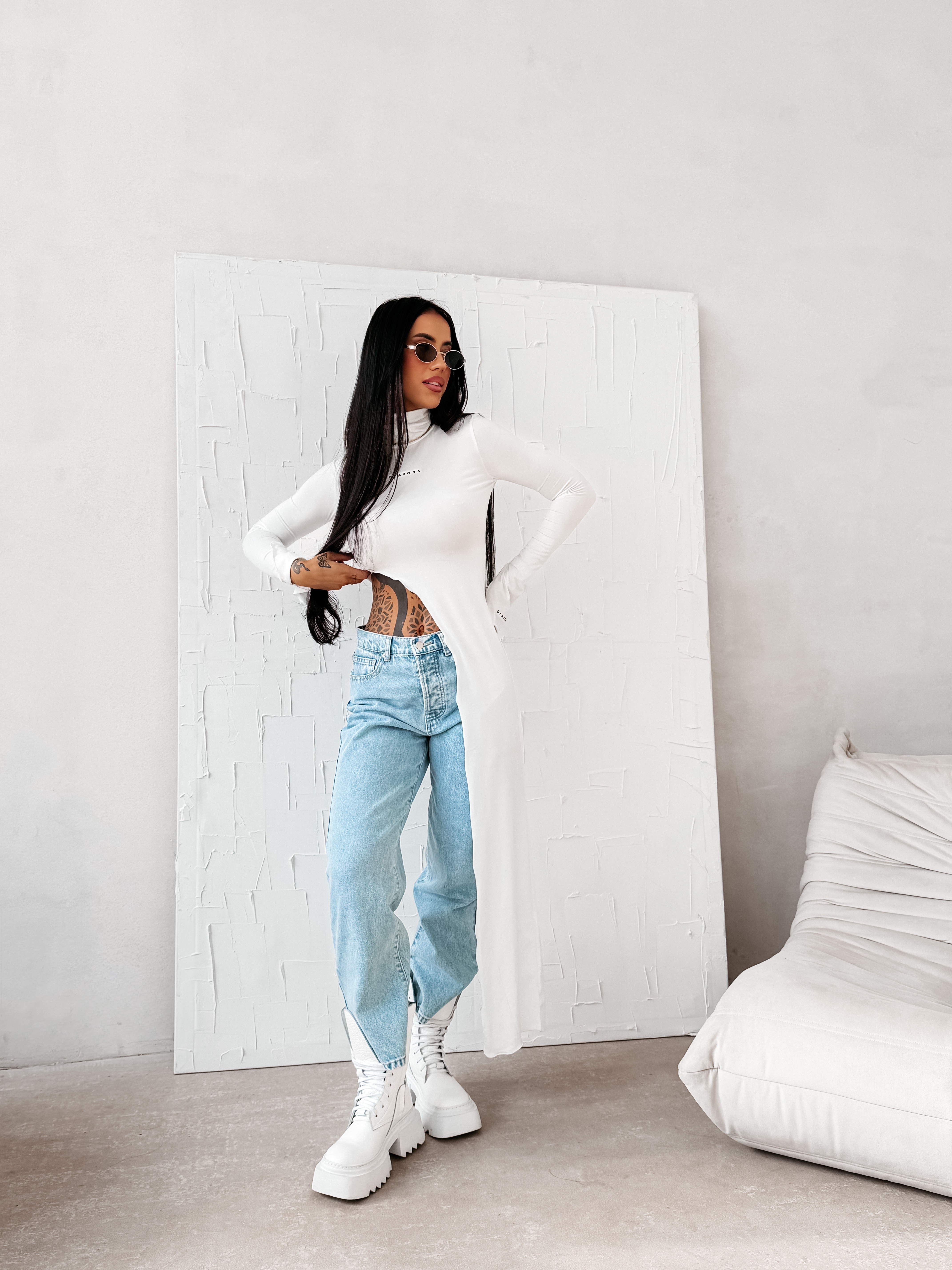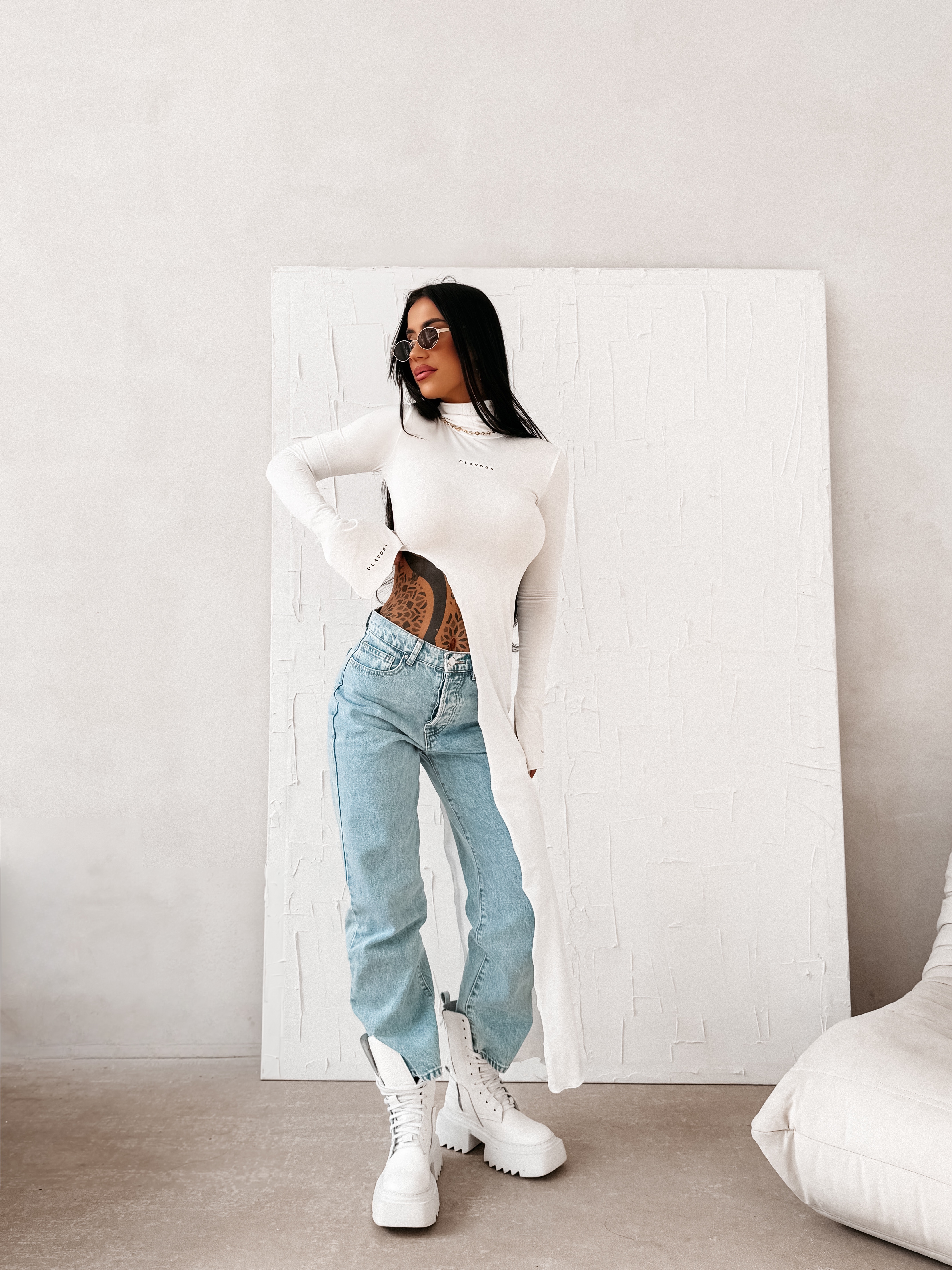 Dopasowany krój - elastyczna dzianina - długi rękaw zakończony rozcięciem - golf - asymetryczne wycięcie - brzegi wykończone mereżką - subtelne logowanie na przodzie i rękawach - efektowny kobiecy look