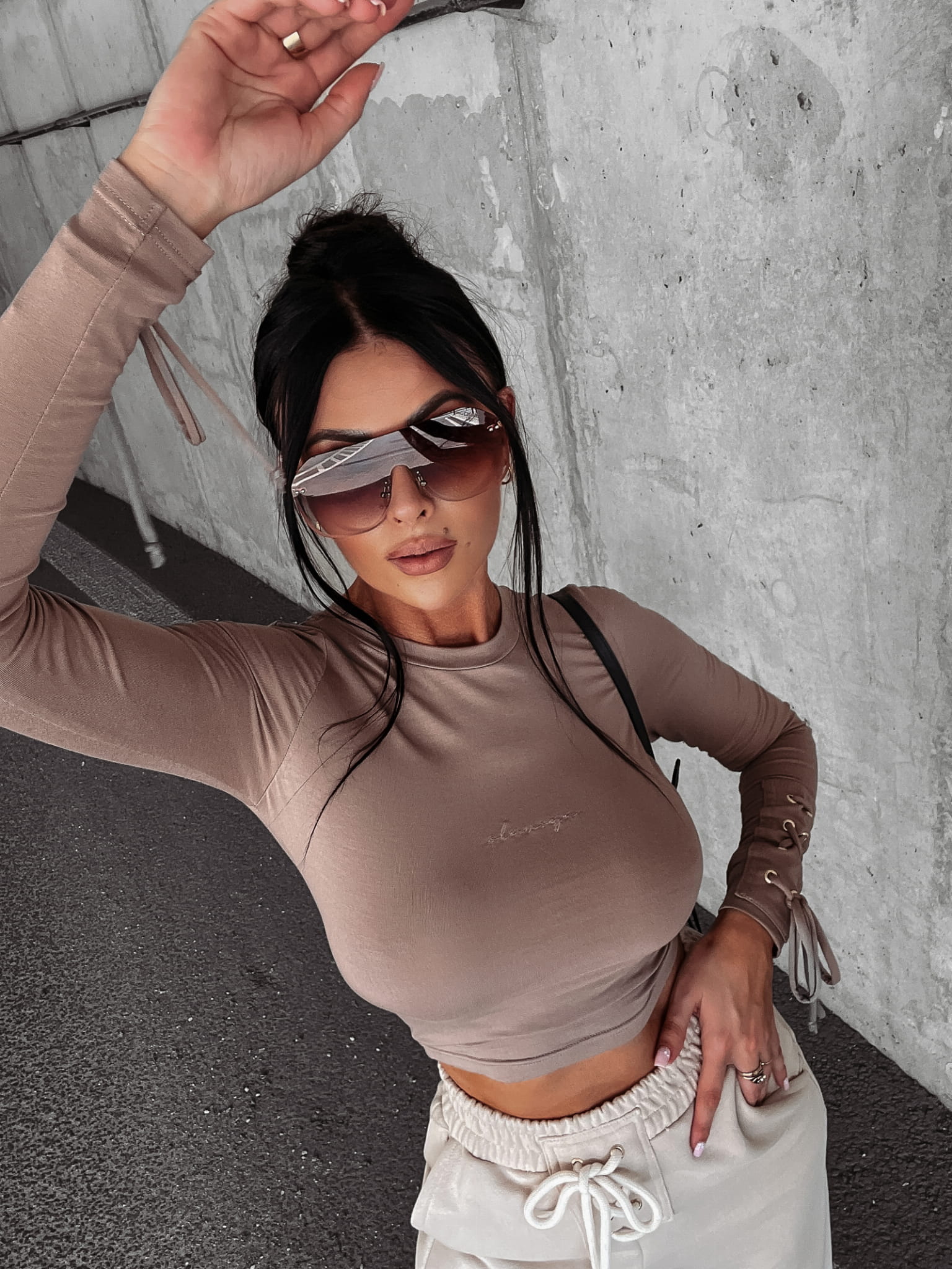 Dopasowana bluzka z długim rękawem, z wiązaniem przy rękawach. Na przodzie minimalistyczny haft.