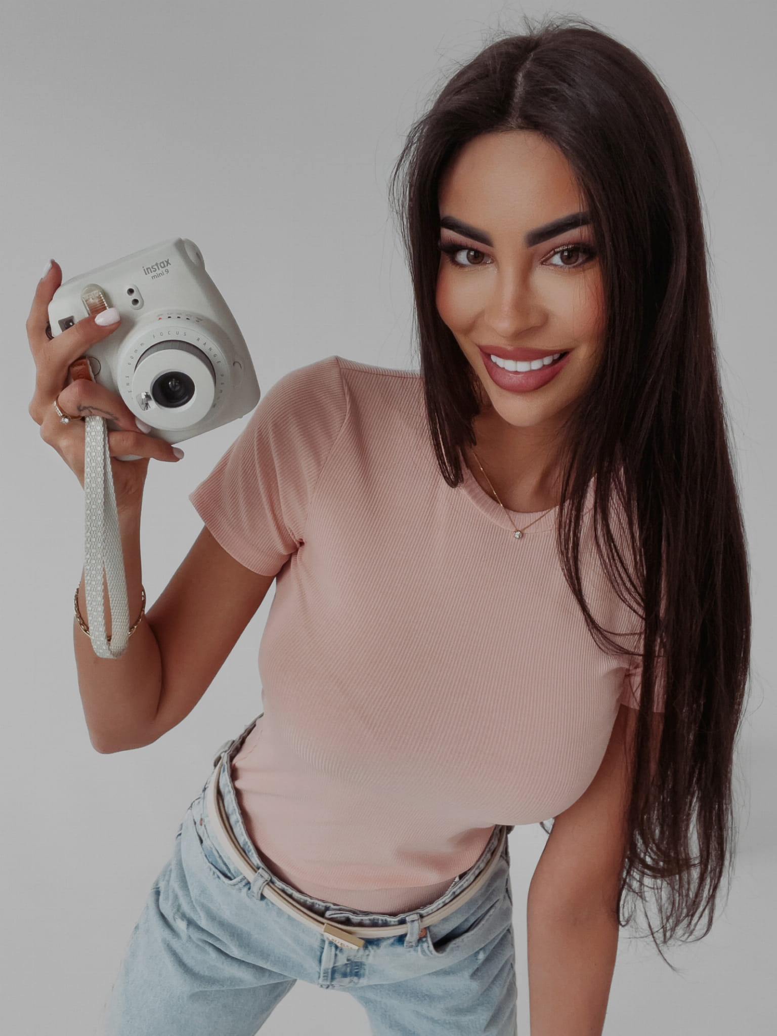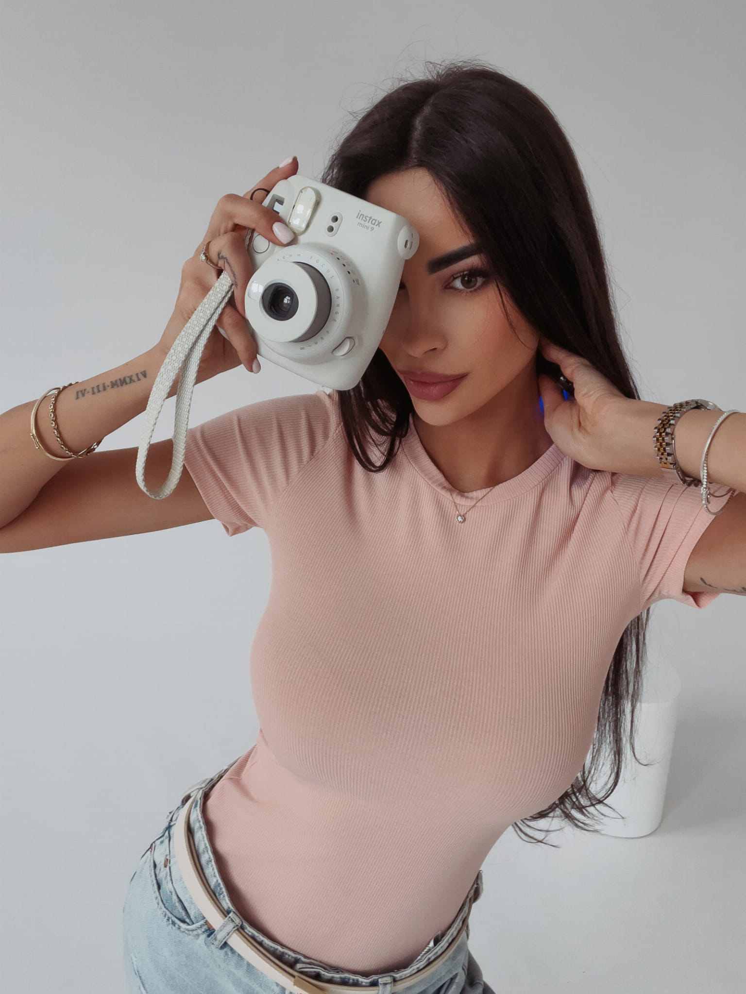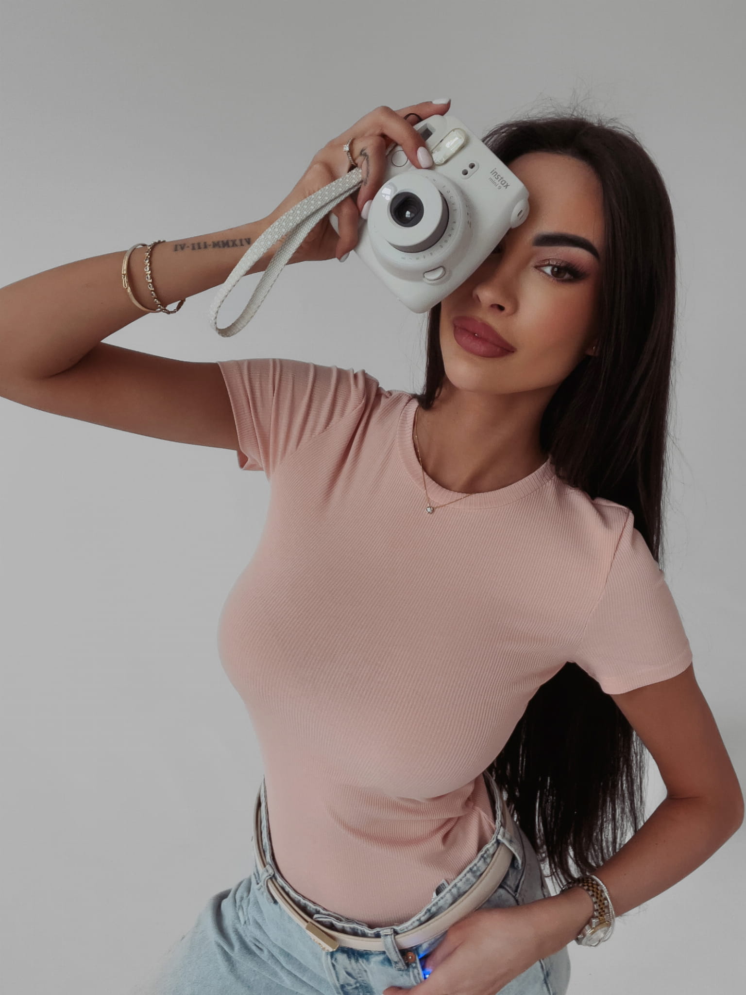 Klasyczna, prosta bluzka z krótkim rękawem i małym, okrągłym dekoltem. Basic do stworzenia wielu stylizacji. Idealna pod marynarkę, ramoneskę czy jeansową katanę.