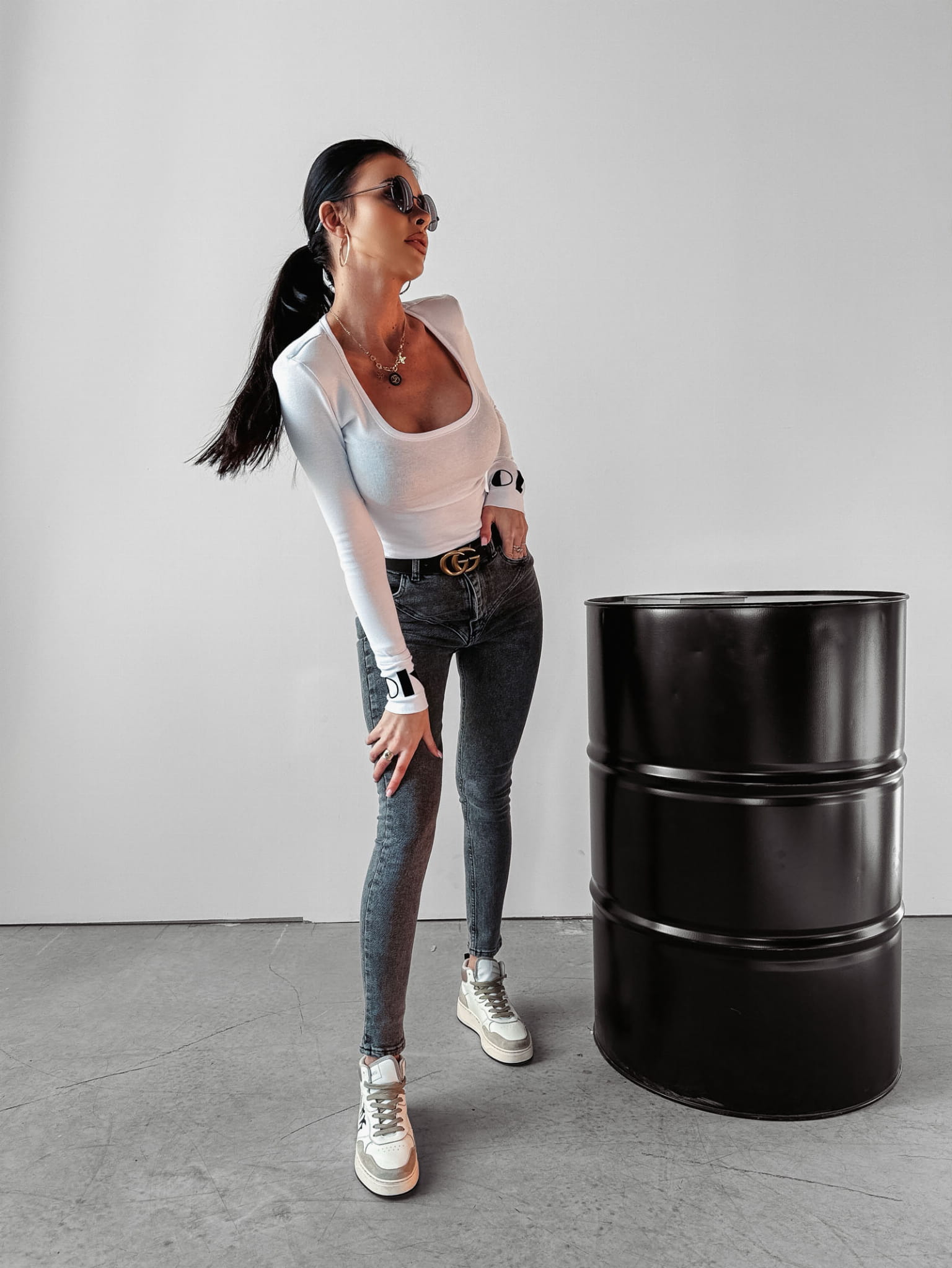 Dopasowana bluzka z długim rękawem i obszernym dekoltem. Delikatnie prążkowany materiał, na przodzie ozdobny złoty pin.