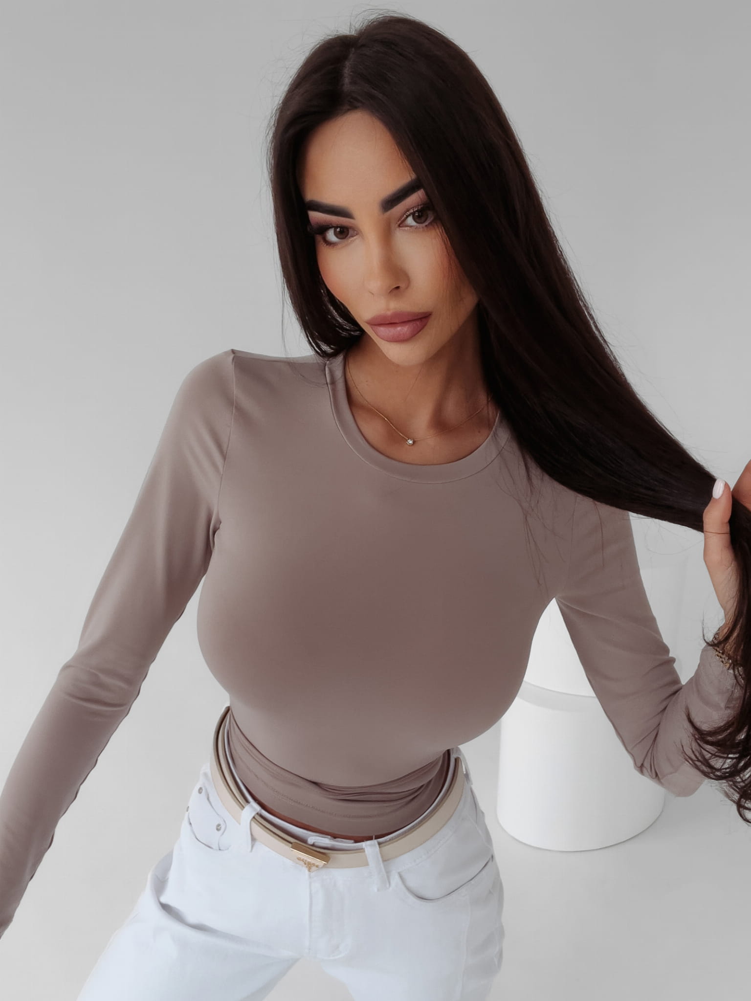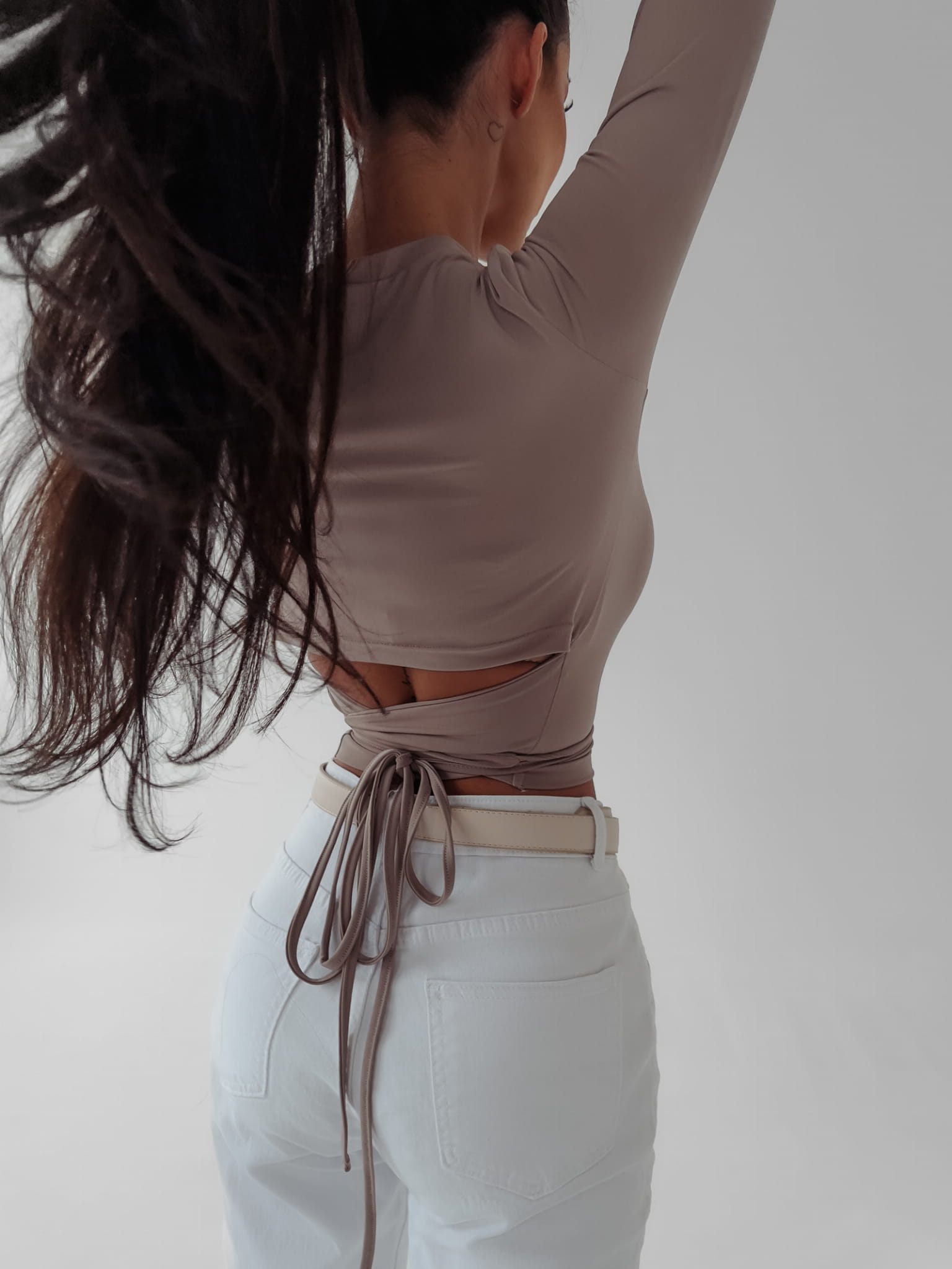 Elegancki, dopasowany top z długim rękawem i fantazyjnym wiązaniem z tyłu. Idealny do jeansów, szortów czy dopasowanych legginsów. Wysokiej jakości, gładki materiał, bluzka uszyta z dbałością o każdy detal.