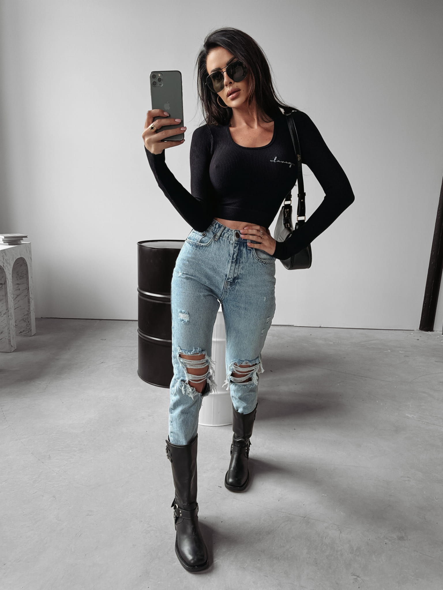 Krótki top z długim rękawem. Na przodzie niewielki haft z logiem marki. Materiał miły w dotyku, prążkowany.