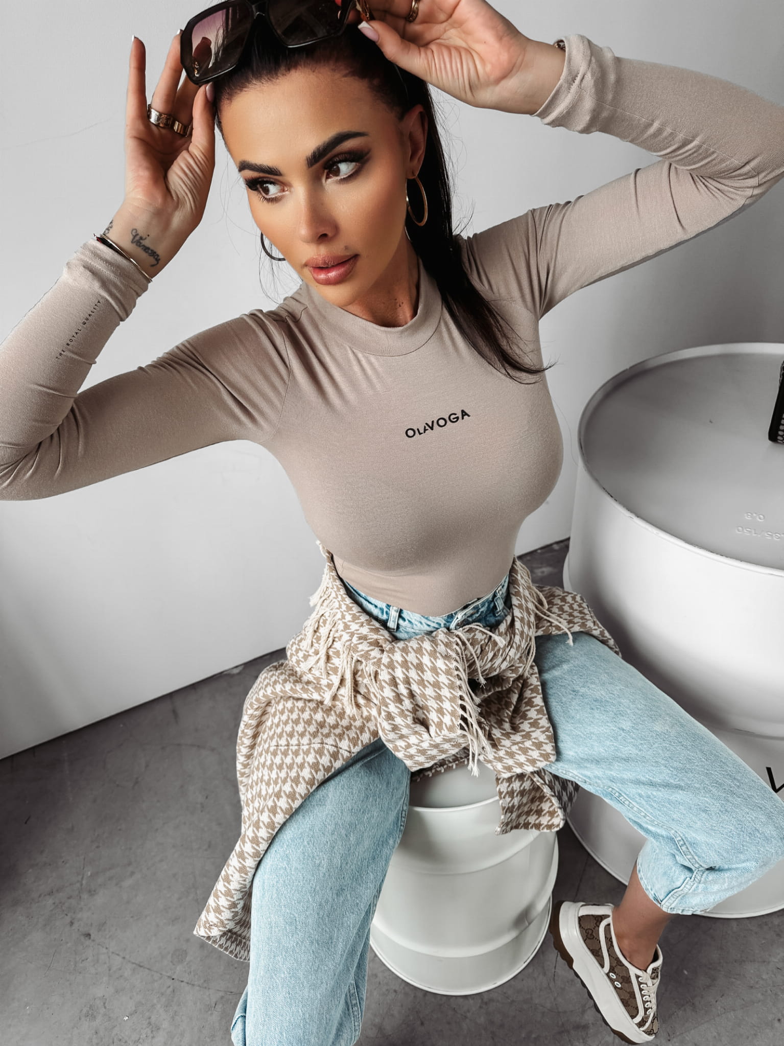 Obcisła bluzka z długim rękawem. Przy dekolcie ściągacz. Idealnie podkreśla naszą sylwetkę, dzięki elastycznemu materiałowi, z którego została wykonana. Na przodzie logo marki.
