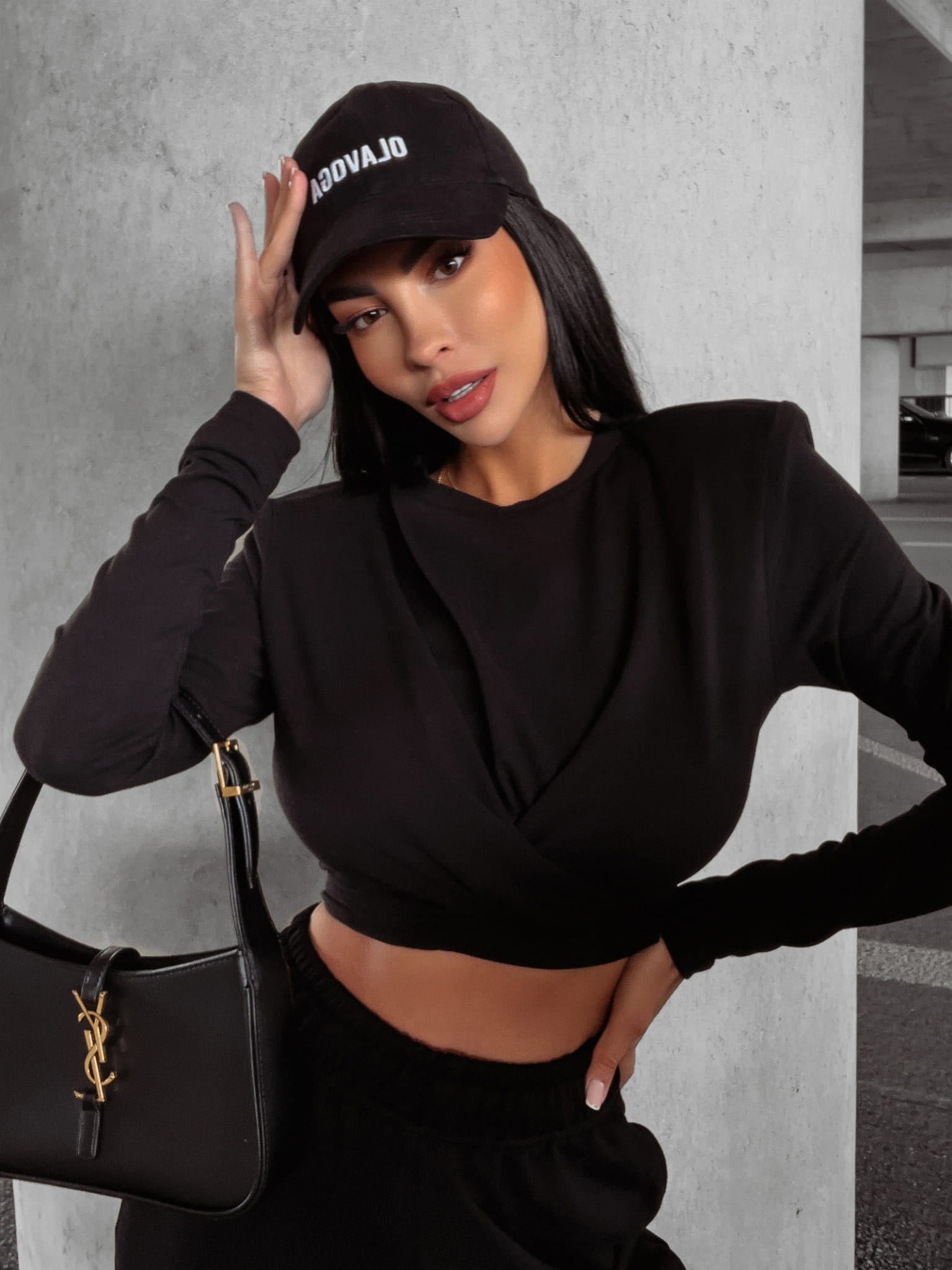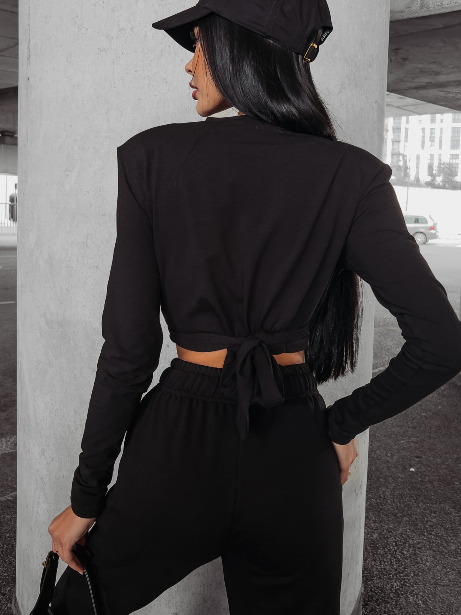 Obcisła elastyczna bluzka z długim rękawem oraz zabudowanym dekoltem, dzięki wiązaniu tworzy marszczenia na przodzie dodające dynamiki wraz z poduszkami w ramionach.