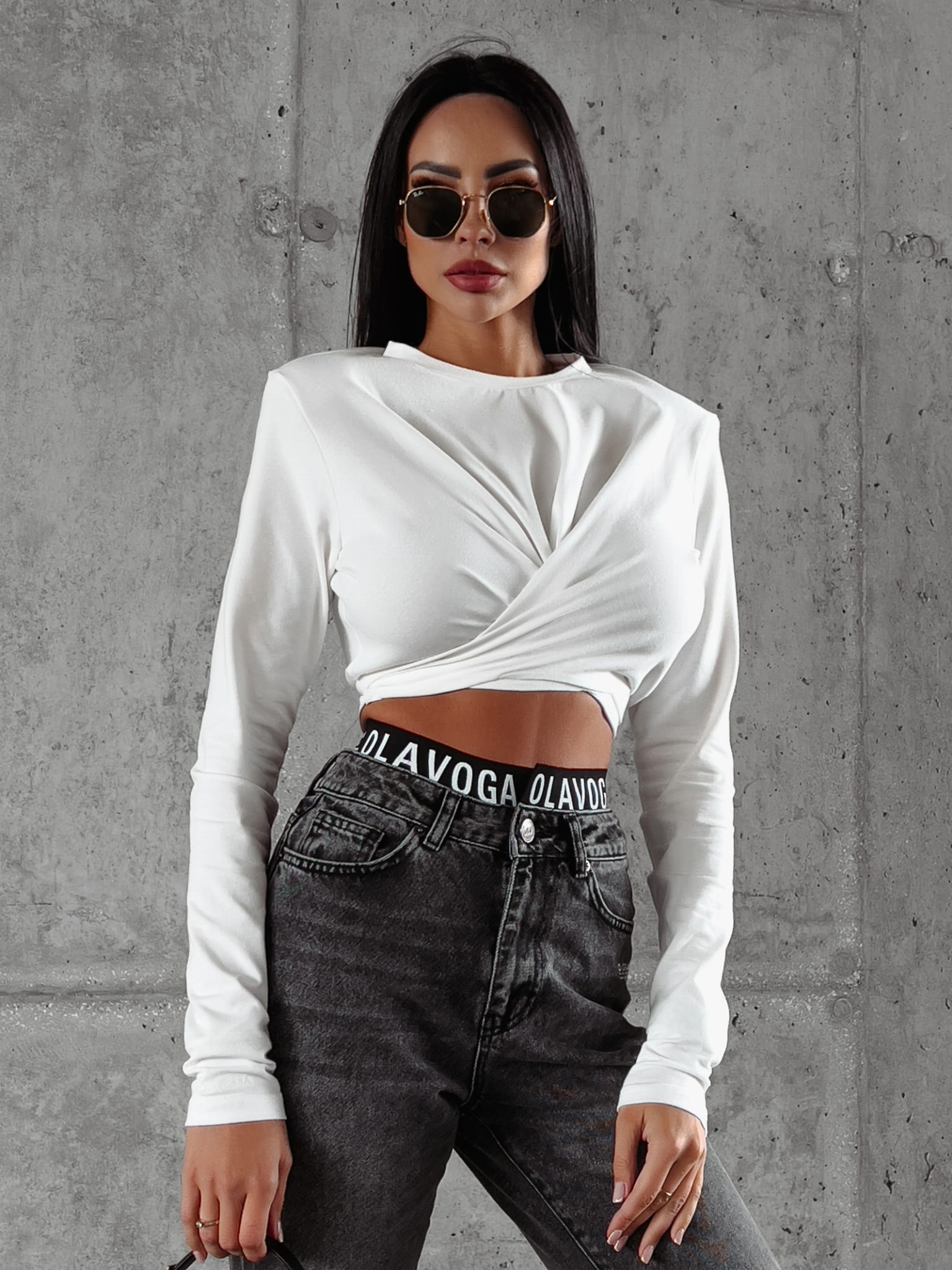 Obcisła elastyczna bluzka z długim rękawem oraz zabudowanym dekoltem, dzięki wiązaniu tworzy marszczenia na przodzie dodające dynamiki wraz z poduszkami w ramionach.