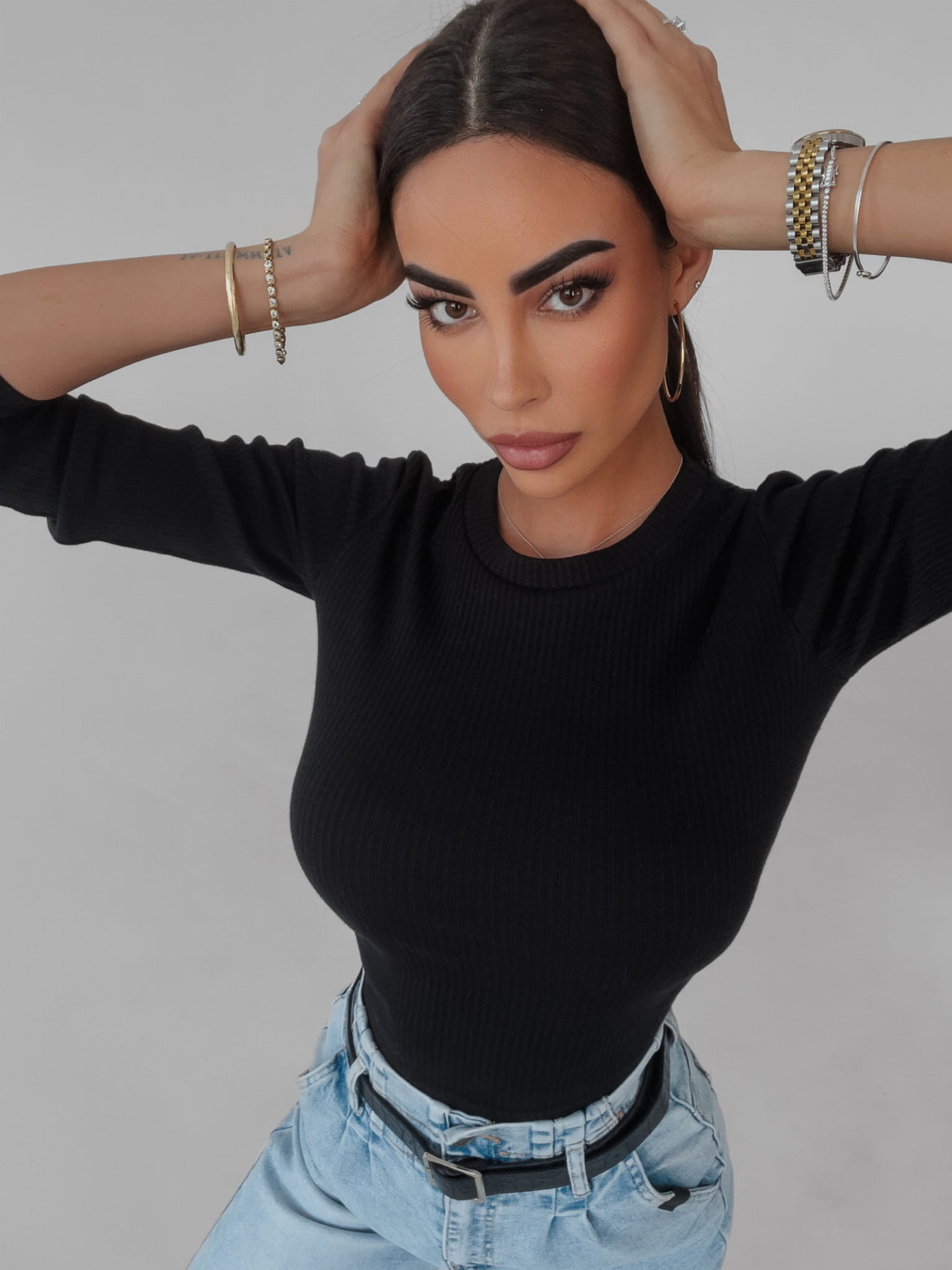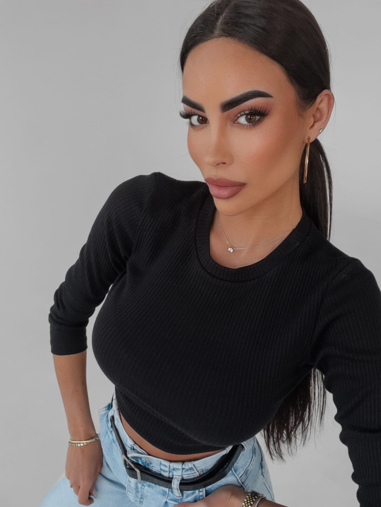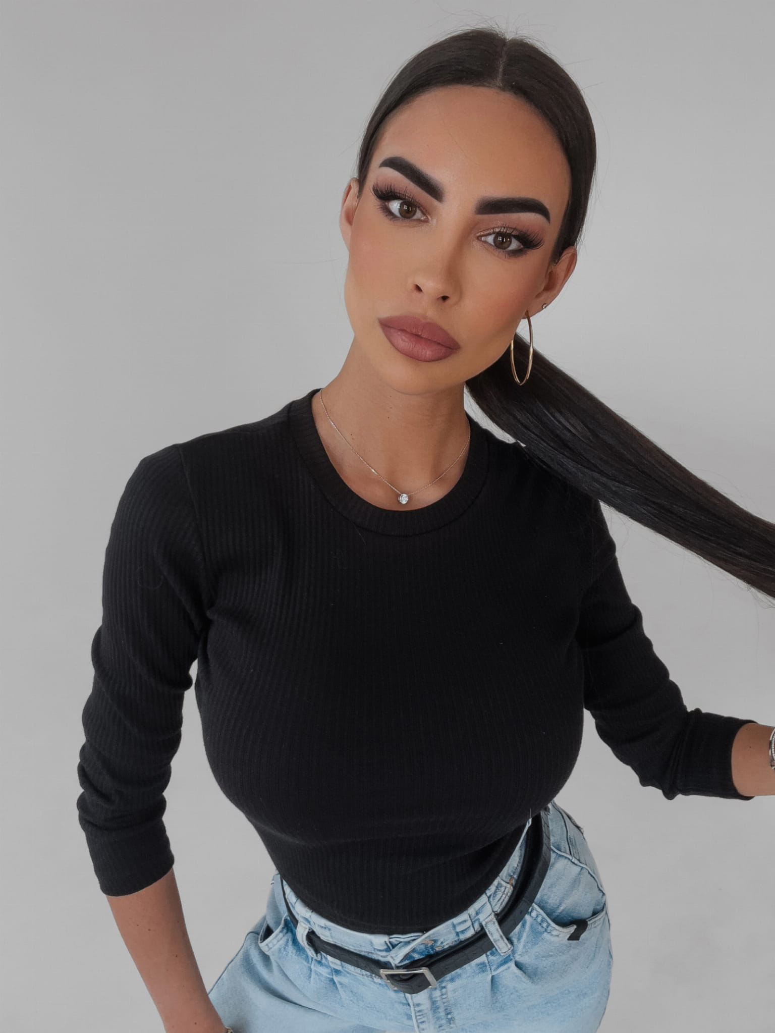 Klasyczna bluzka z długim rękawem, krótszy fason, okrągły, niewielki dekolt. Bluzka uszyta z wysokiej jakości, prążkowanego materiału. Klasyk, który warto mieć w szafie.