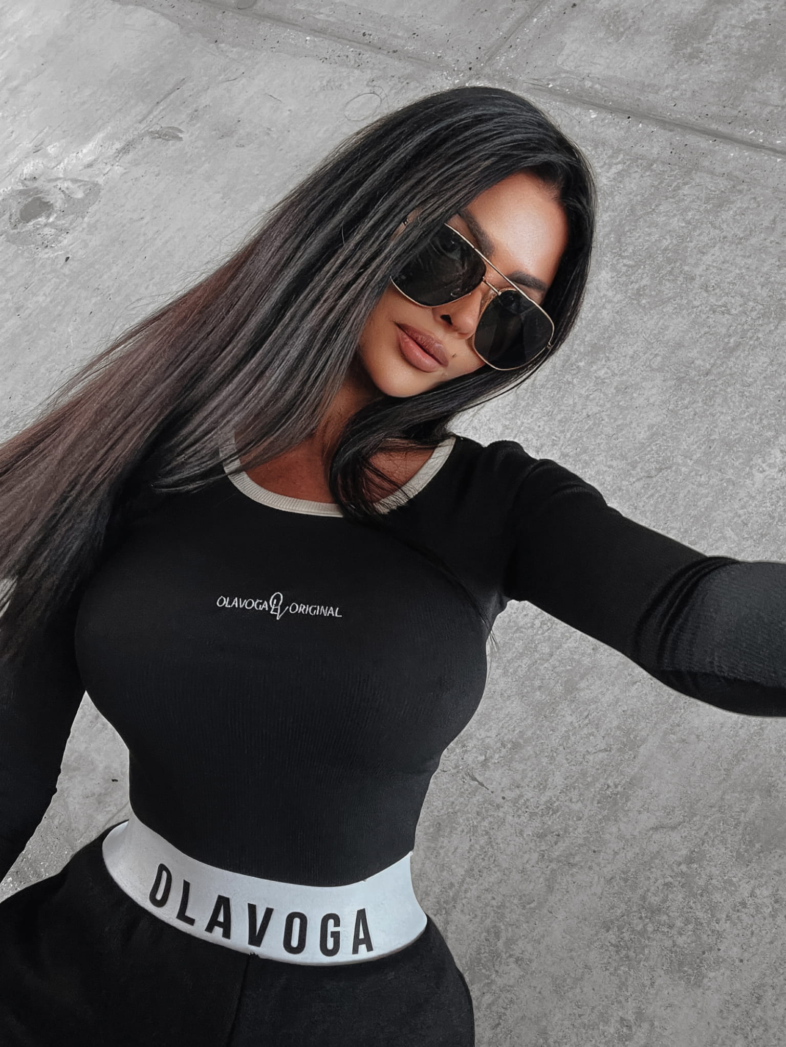 Dopasowana bluzka o krótszym kroju uszyta z delikatnie prążkowanej dzianiny. Na przodzie haft OLAVOGA ORIGINAL. Dekolt, dół i rękawy zakończone kontrastową lamówką.