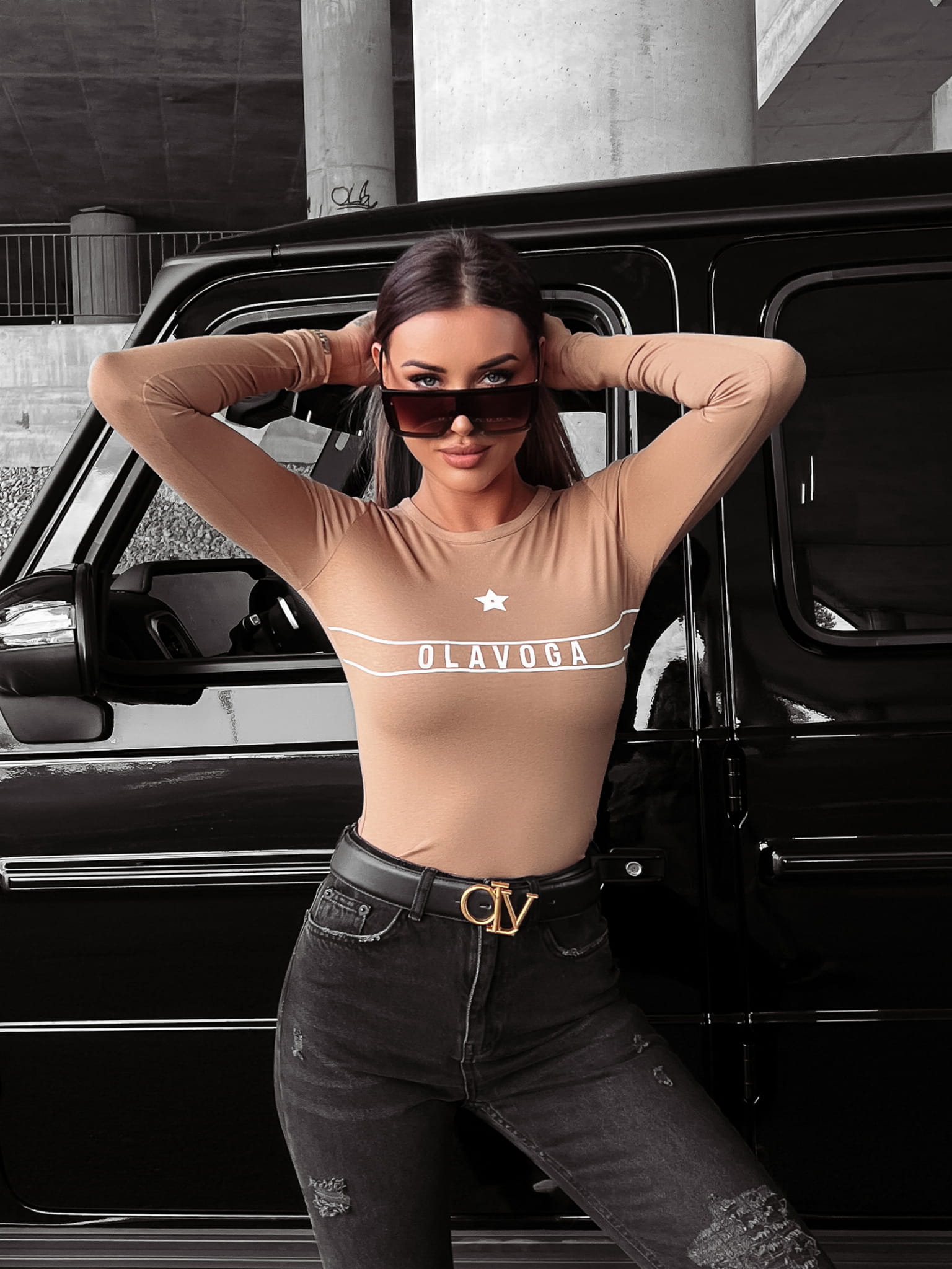 Podkreślający figurę top z długim rękawem. Na przodzie nadruk logo i minimalistyczna gwiazdka. Okrągły dekolt, prosty brzeg u dołu.