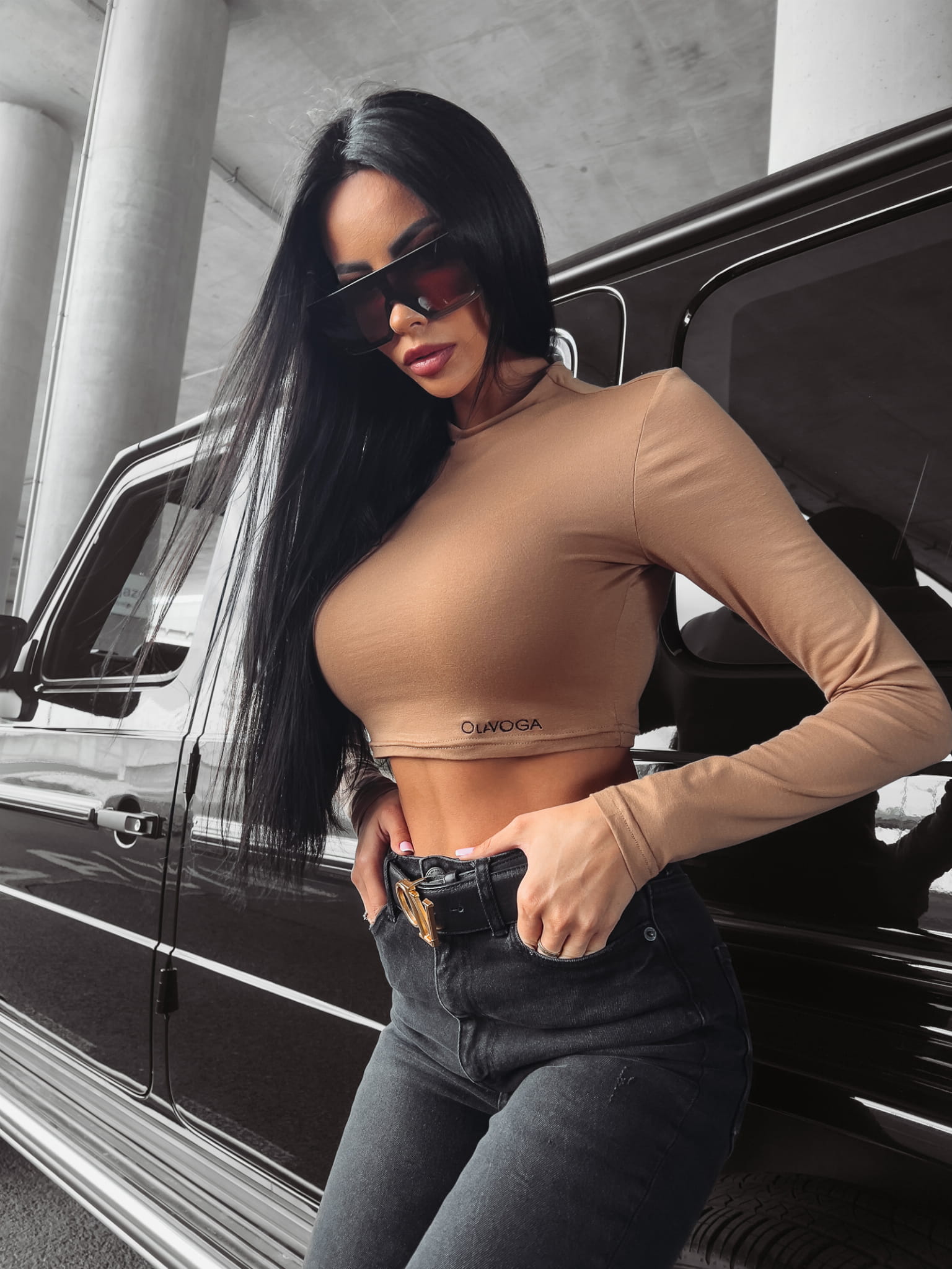 Dopasowana, gładka bluzka z długim rękawem i stójkowym kołnierzykiem. Na dole haft w postaci loga OLAVOGA.