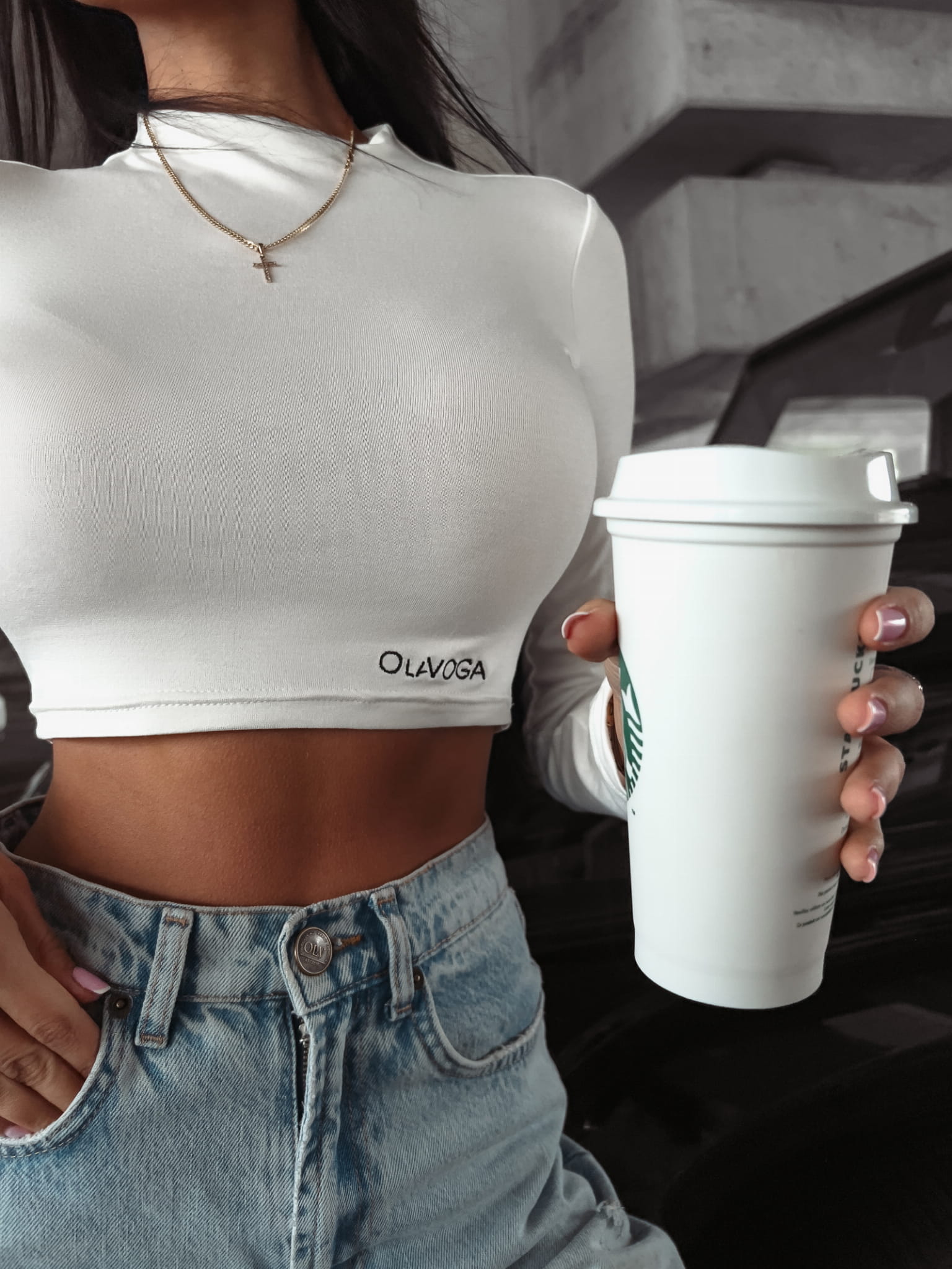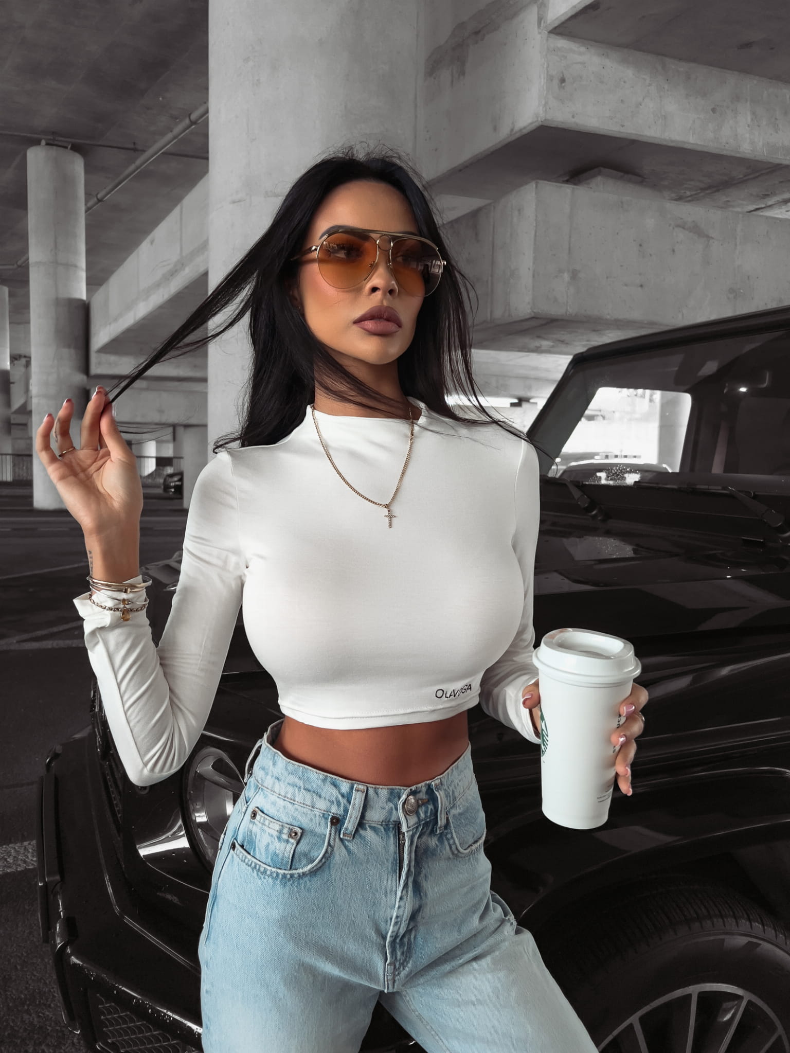 Dopasowana, gładka bluzka z długim rękawem i stójkowym kołnierzykiem. Na dole haft w postaci loga OLAVOGA.