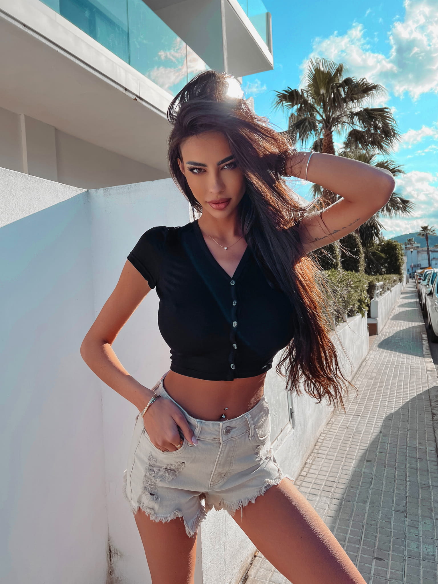 Prosta, króciutka bluzka z krótkim rękawem, zapinana na kilka drobnych guzików. Wakacyjny, minimalistyczny Basic, - baza do stworzenia wielu stylizacji.