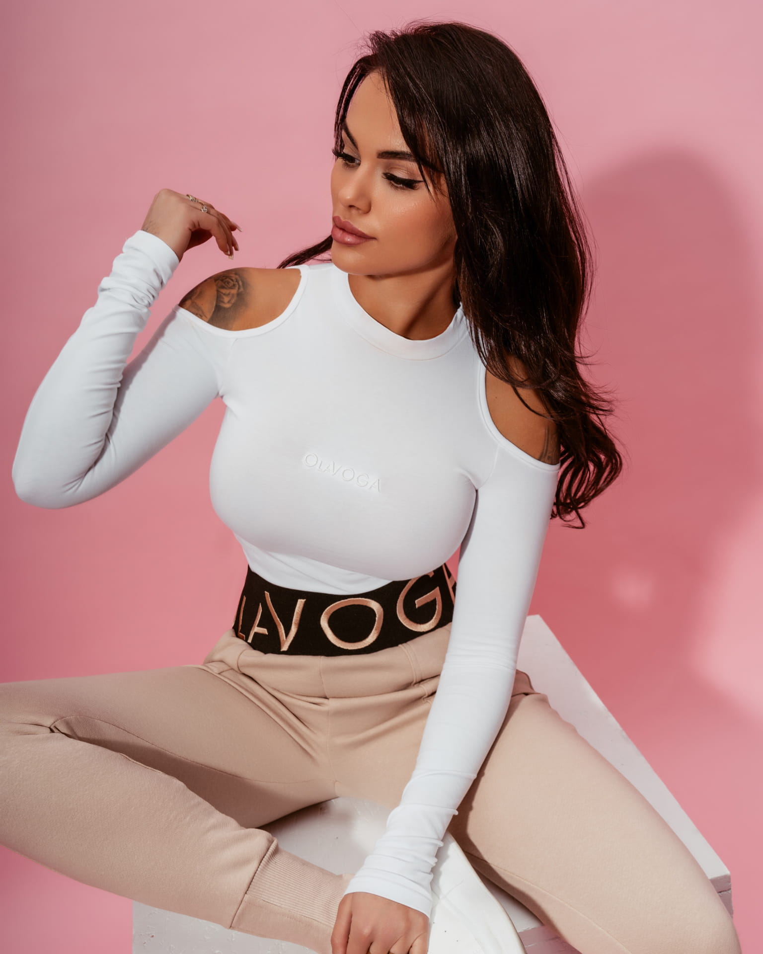 Bluzka „ NECK” z długim rękawem i odkrytymi ramionami dodaje zmysłowości. Dopasowana idealnie podkreśla figurę. Na biuście logo marki .