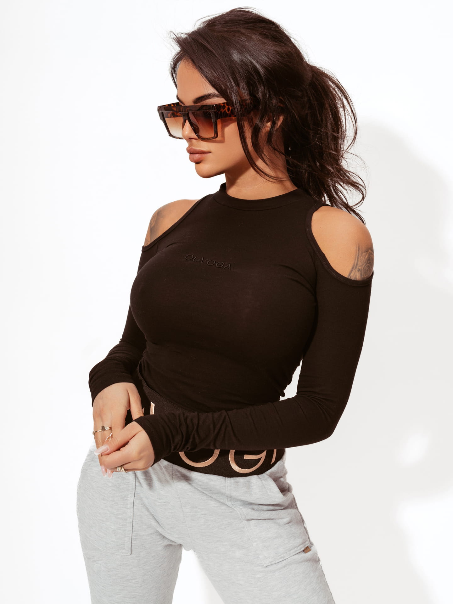 Bluzka „ NECK” z długim rękawem i odkrytymi ramionami dodaje zmysłowości. Dopasowana idealnie podkreśla figurę. Na biuście logo marki .