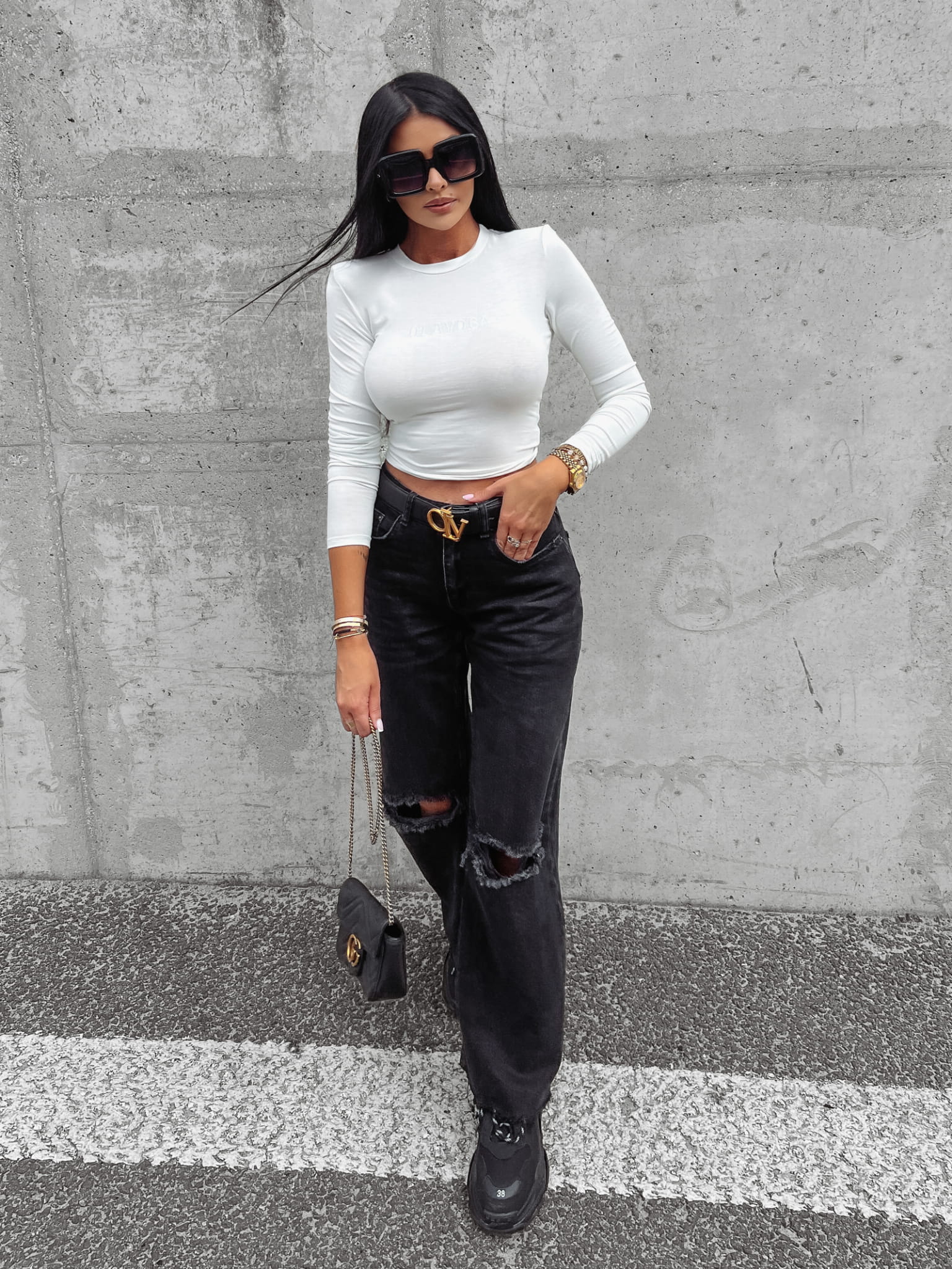 Dopasowana bluzka z długim rękawem, wykonana z przyjemnego w dotyku, elastycznego materiału. Na przodzie nadruk OLAVOGA. Okrągły dekolt, poduszki na ramionach podkreślają górne partie sylwetki.