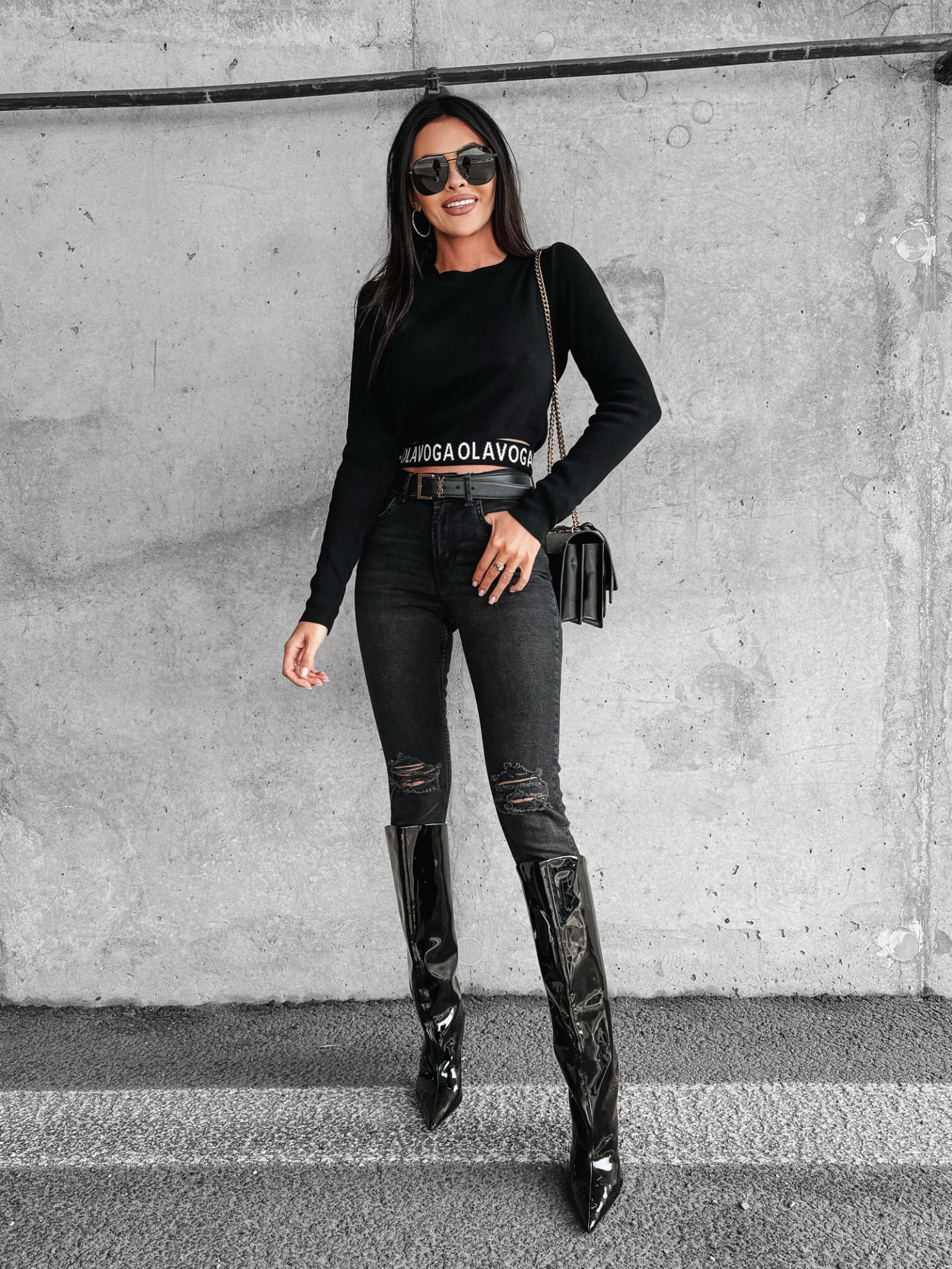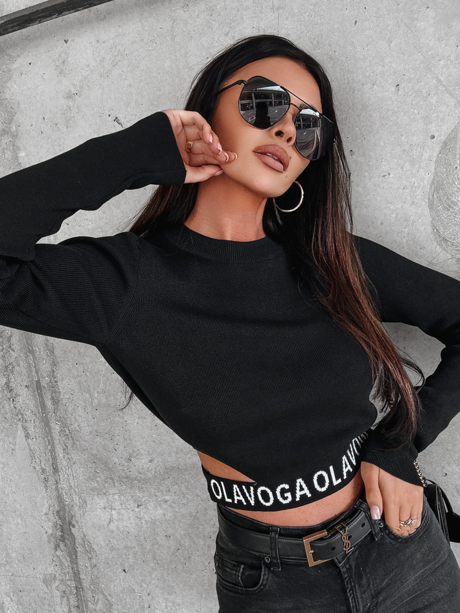 Krótka bluzka swetrowa z wycięciem po bokach, wykończona w pasie logowanym paskiem. Materiał prążkowany idealnie się układa i dopasowuje do sylwetki. Model gładki.