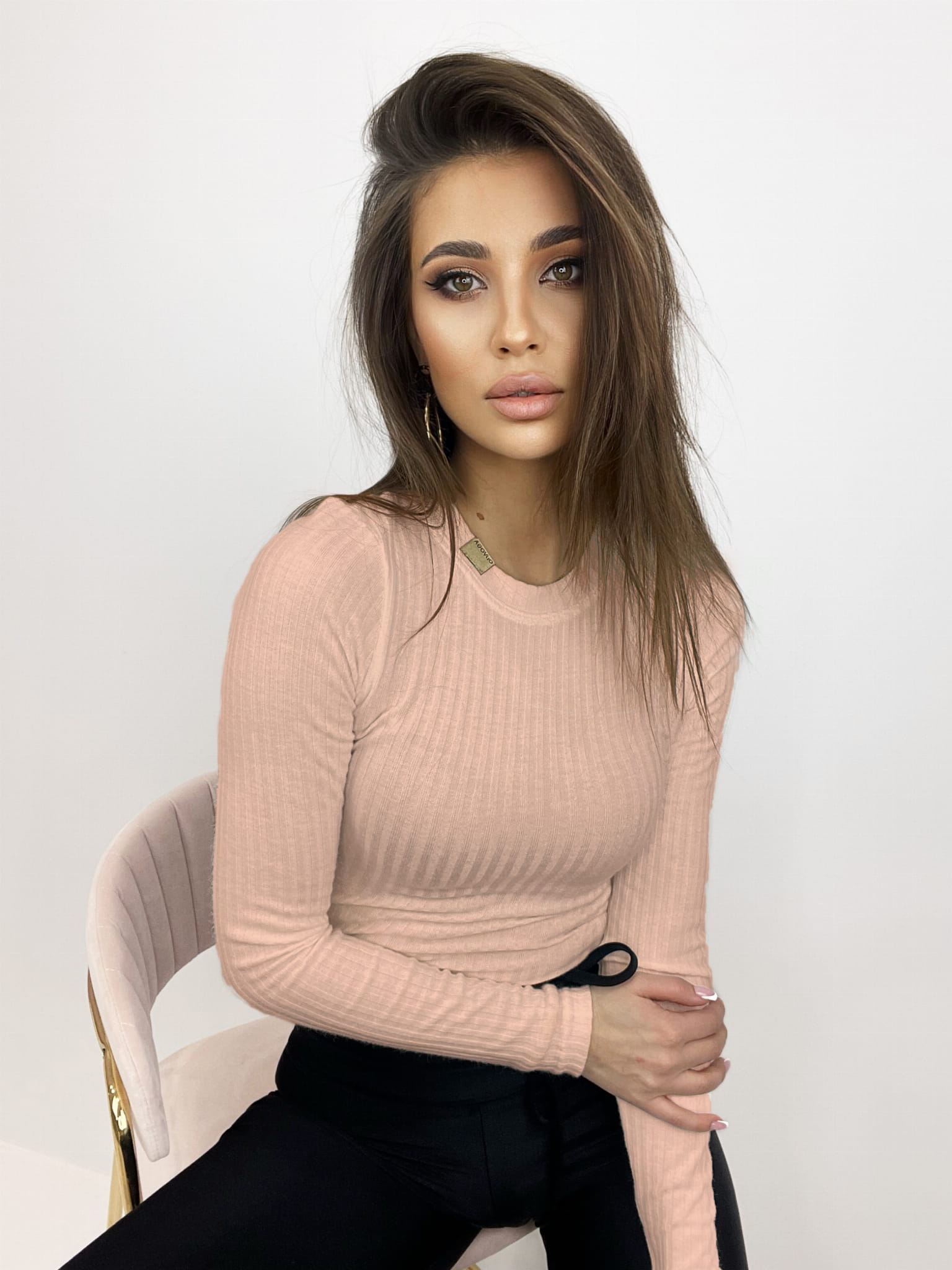 Bluzka „VIN” wykonana z sweterkowej tkaniny jest idealnym wyborem na chłodniejsze wiosenne dni. Dopasowana przylegająca do ciała podkreśla figurę , poduszki modelują ramiona. Ozdobna naszywka wykańcza dekolt.