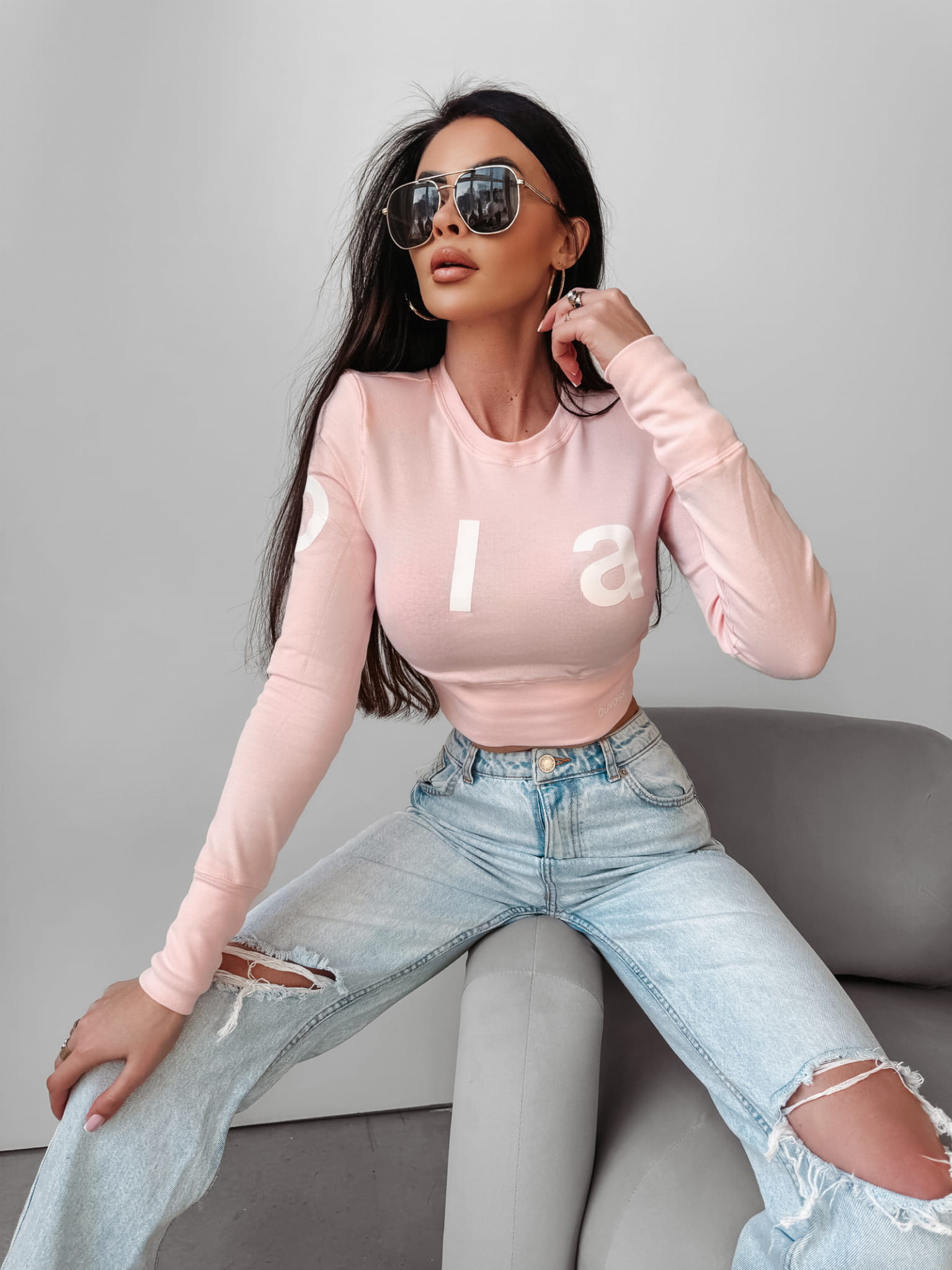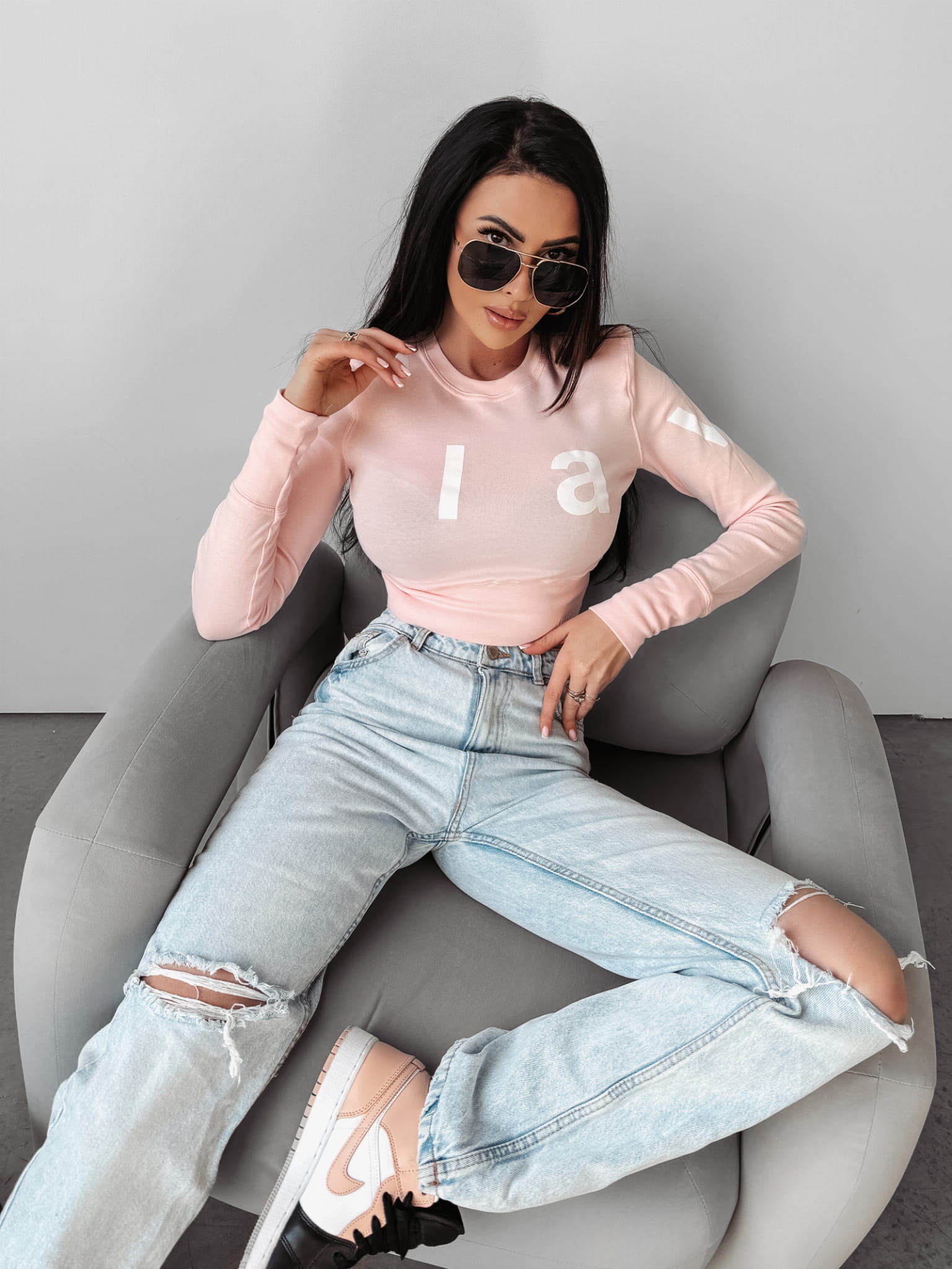 Przylegająca bluzka, idealnie podkreślająca sylwetkę. Zakończona ściągaczami. Wzór stanowi kontrastowy print brandu, po boku niewielkie logo marki.