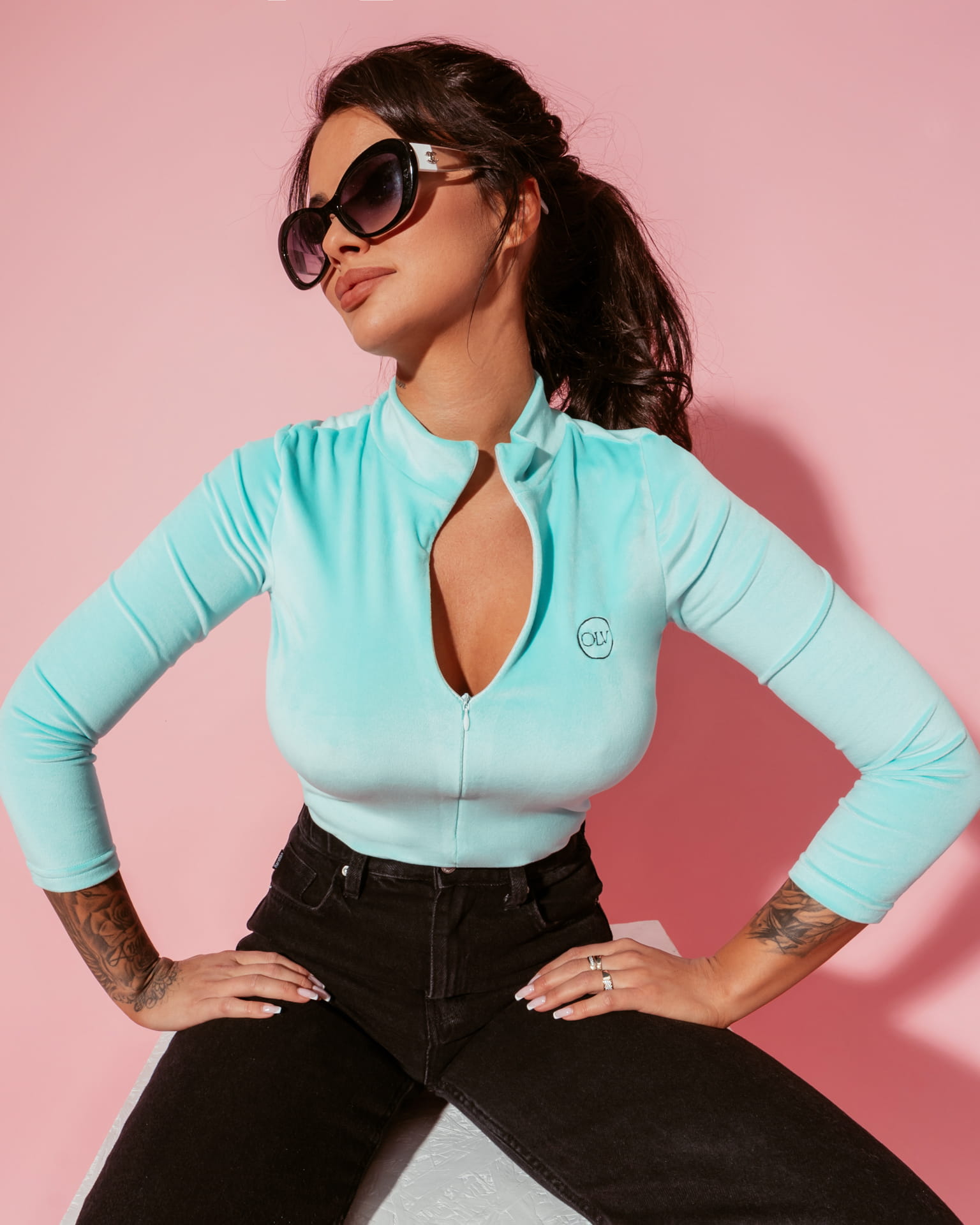 Welurowe body “ALANIA” z delikatnym logo marki i ukrytym suwakiem. Przyjemny materiał otula ciało idealne na chłodniejsze wiosenne dni.