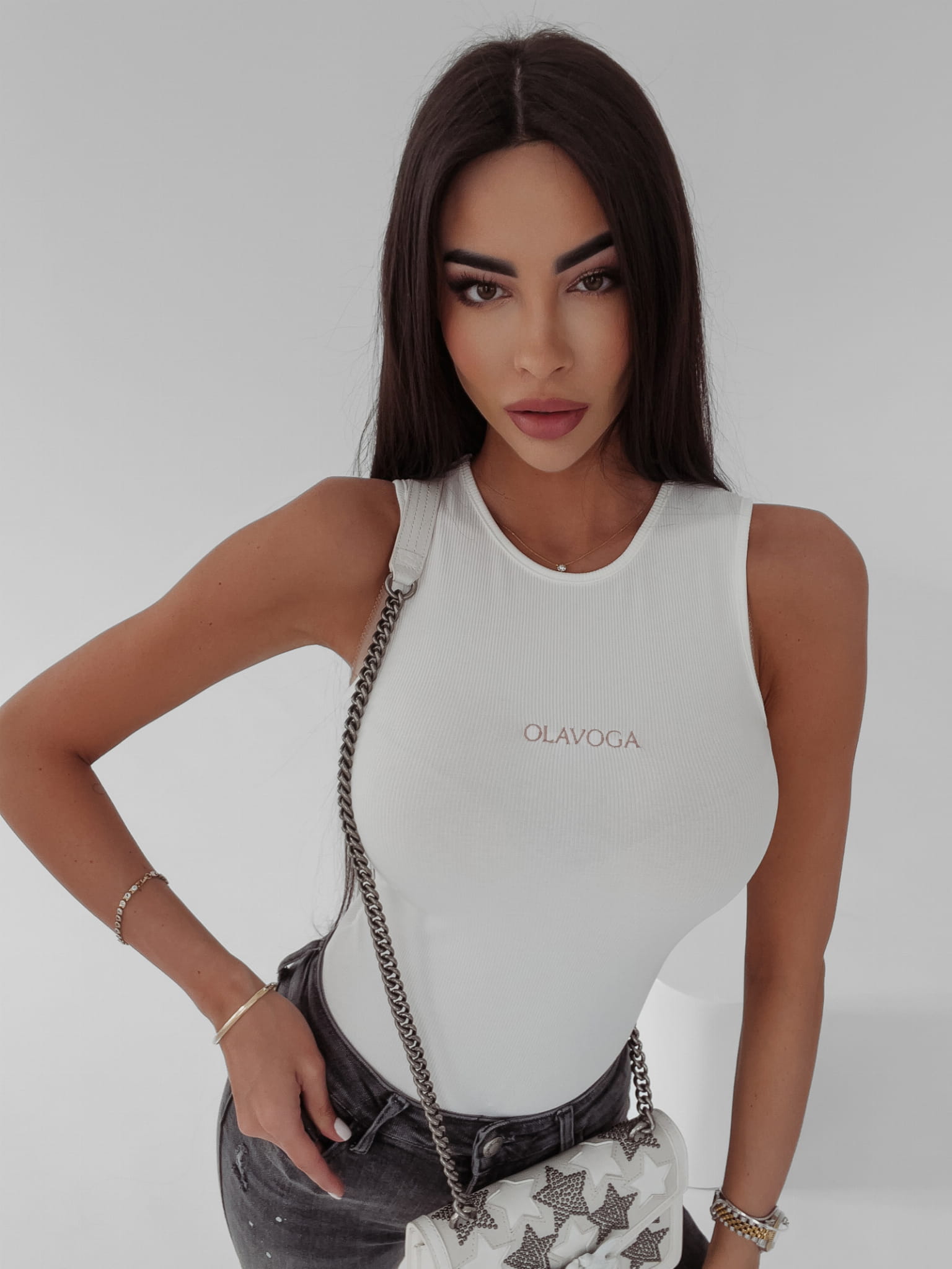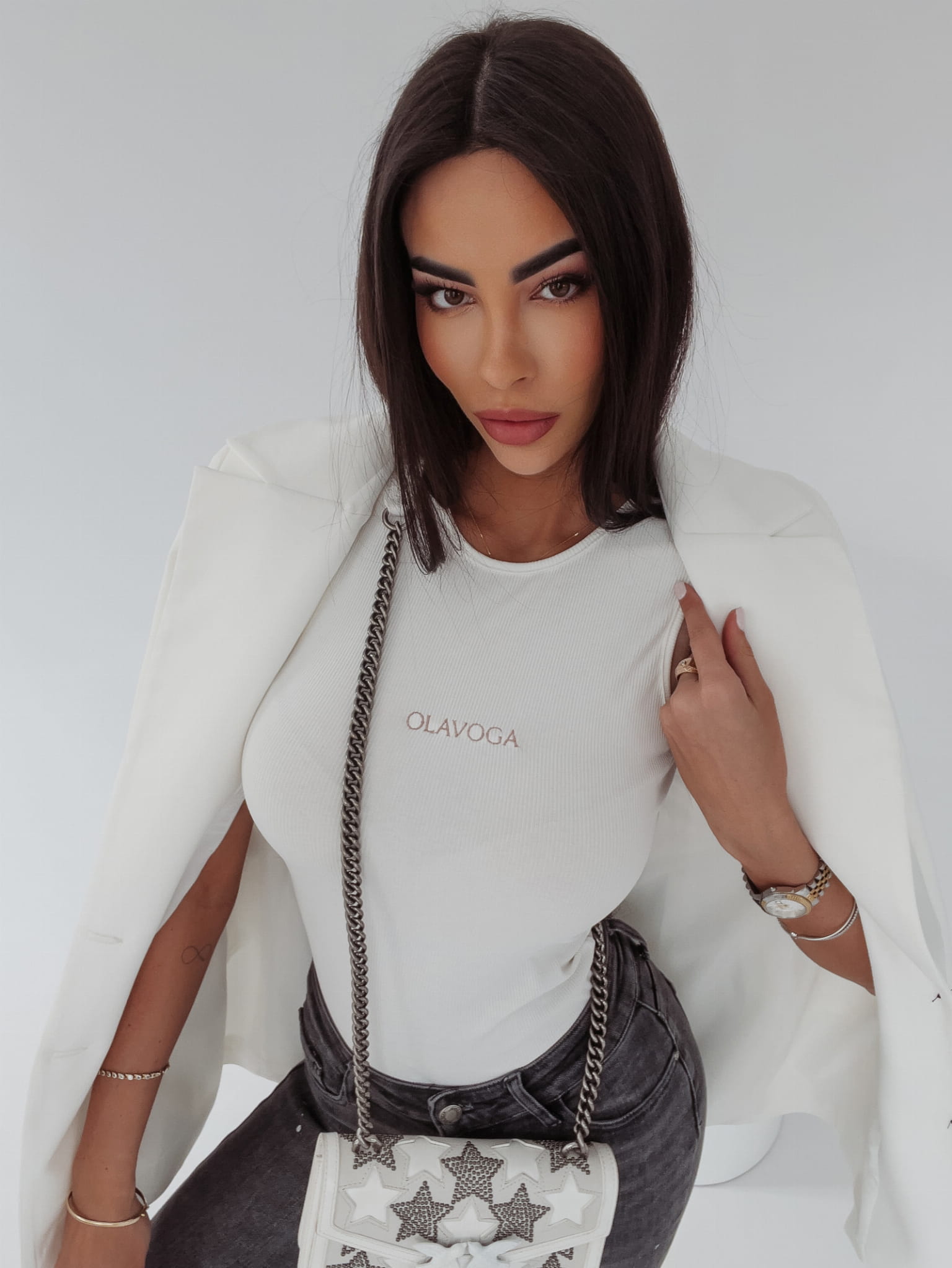 Klasyczny fason body, na przodzie niewielki haft z logo OLAVOGA, rękawy typowe dla modelu bokserka, optycznie wysmuklające sylwetkę. Krój dopasowany do ciała, podkreśli Twoje kształty. Delikatnie prążkowany, wysokiej jakości materiał.
