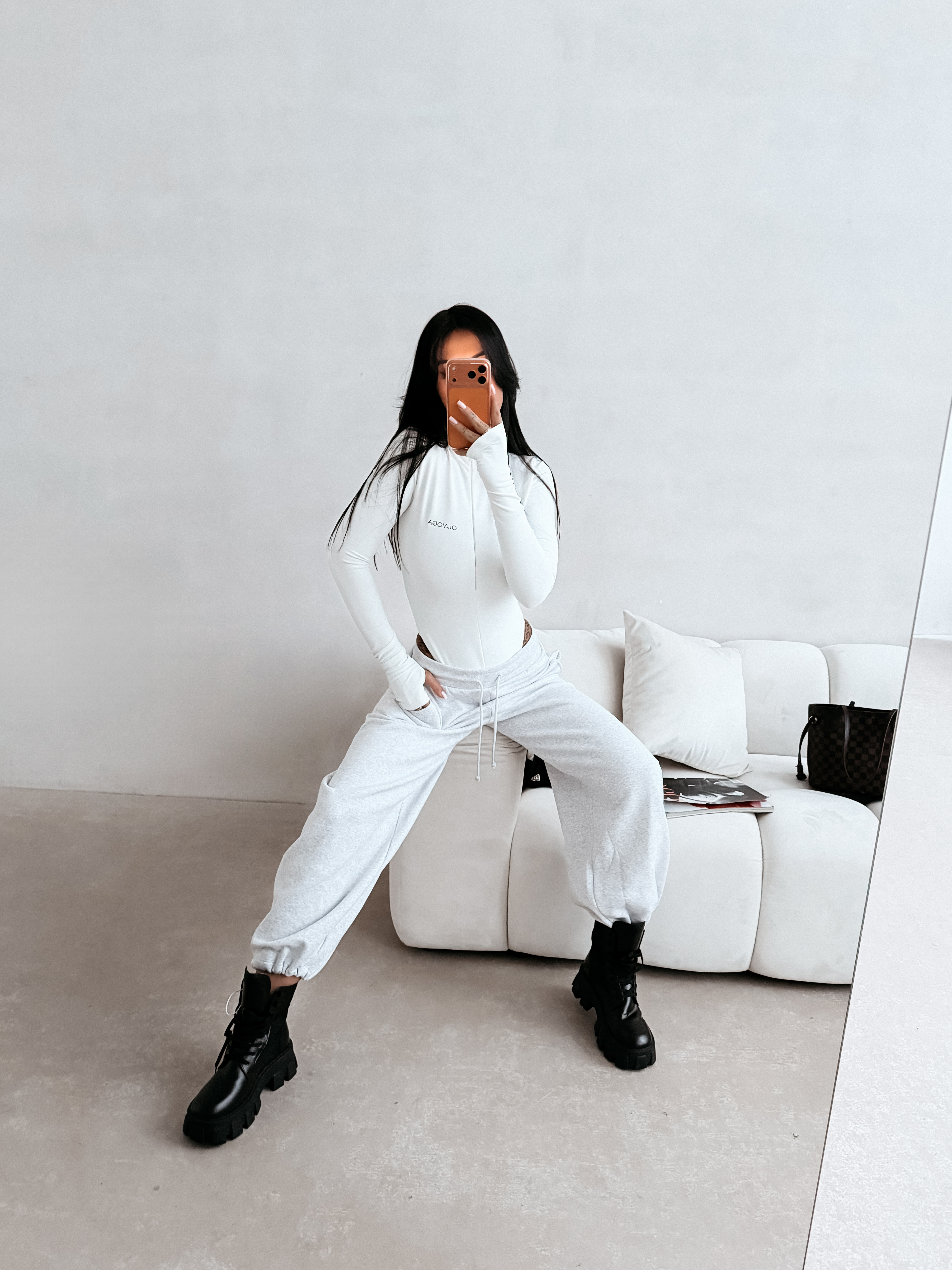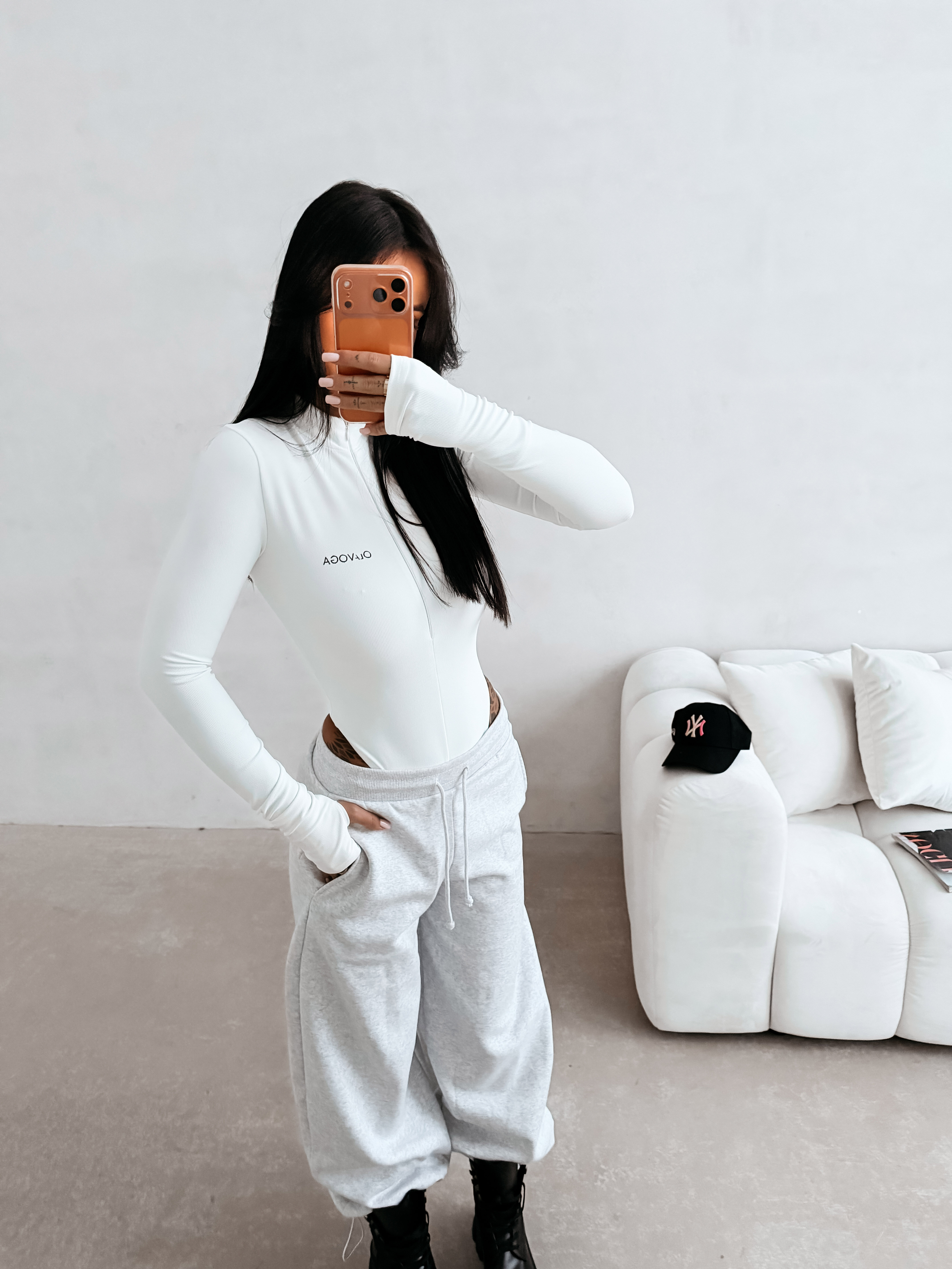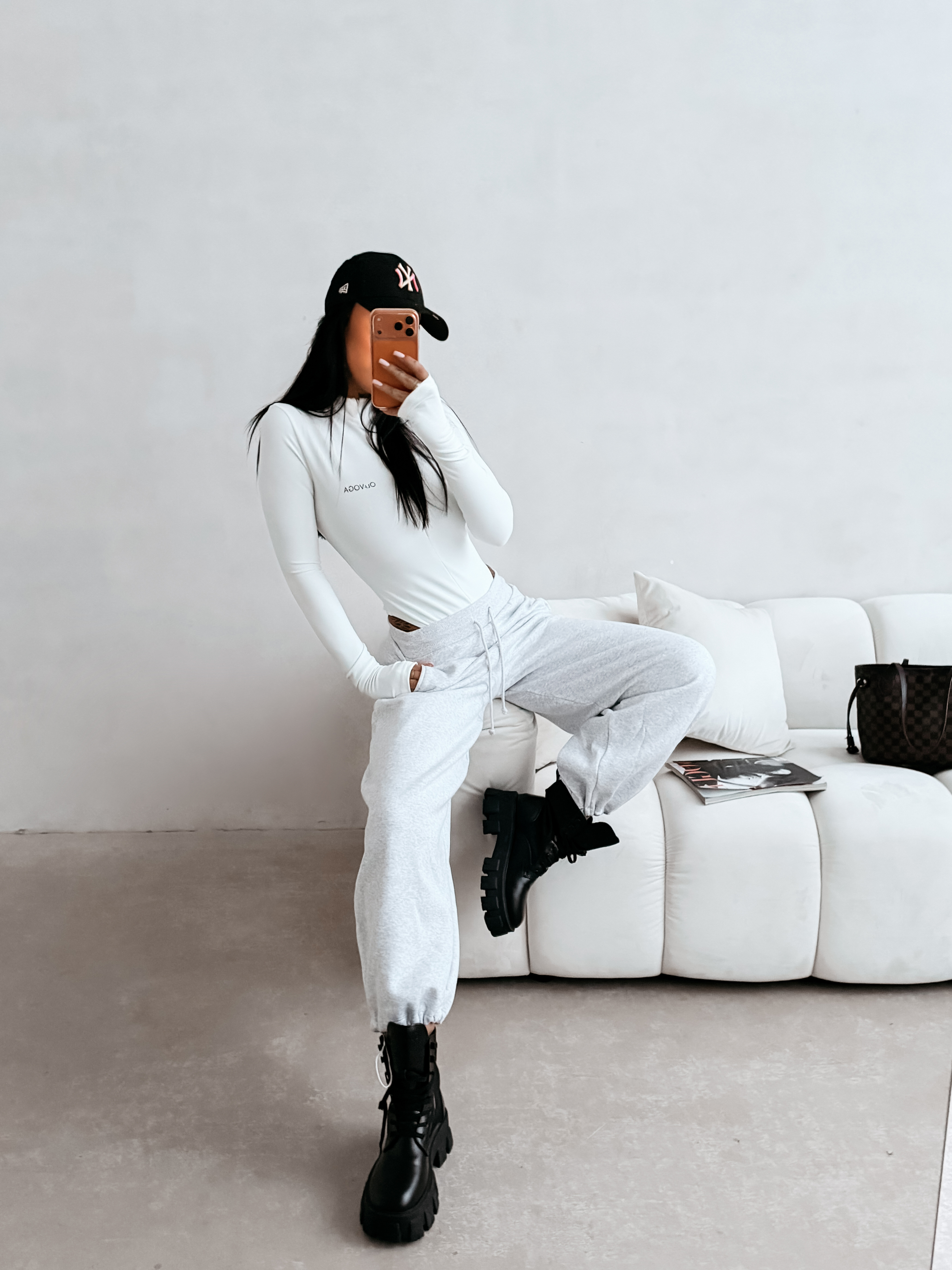 Idealnie dopasowane body z długim rękawem i elegancką stójką. Wykonane z wysokiej jakości, elastycznego materiału o prążkowanej strukturze. Regulowany dekolt na suwak. Rękawy zakończone praktycznym wycięciem na kciuk. Na przodzie minimalistyczny haft z logo OLAVOGA.