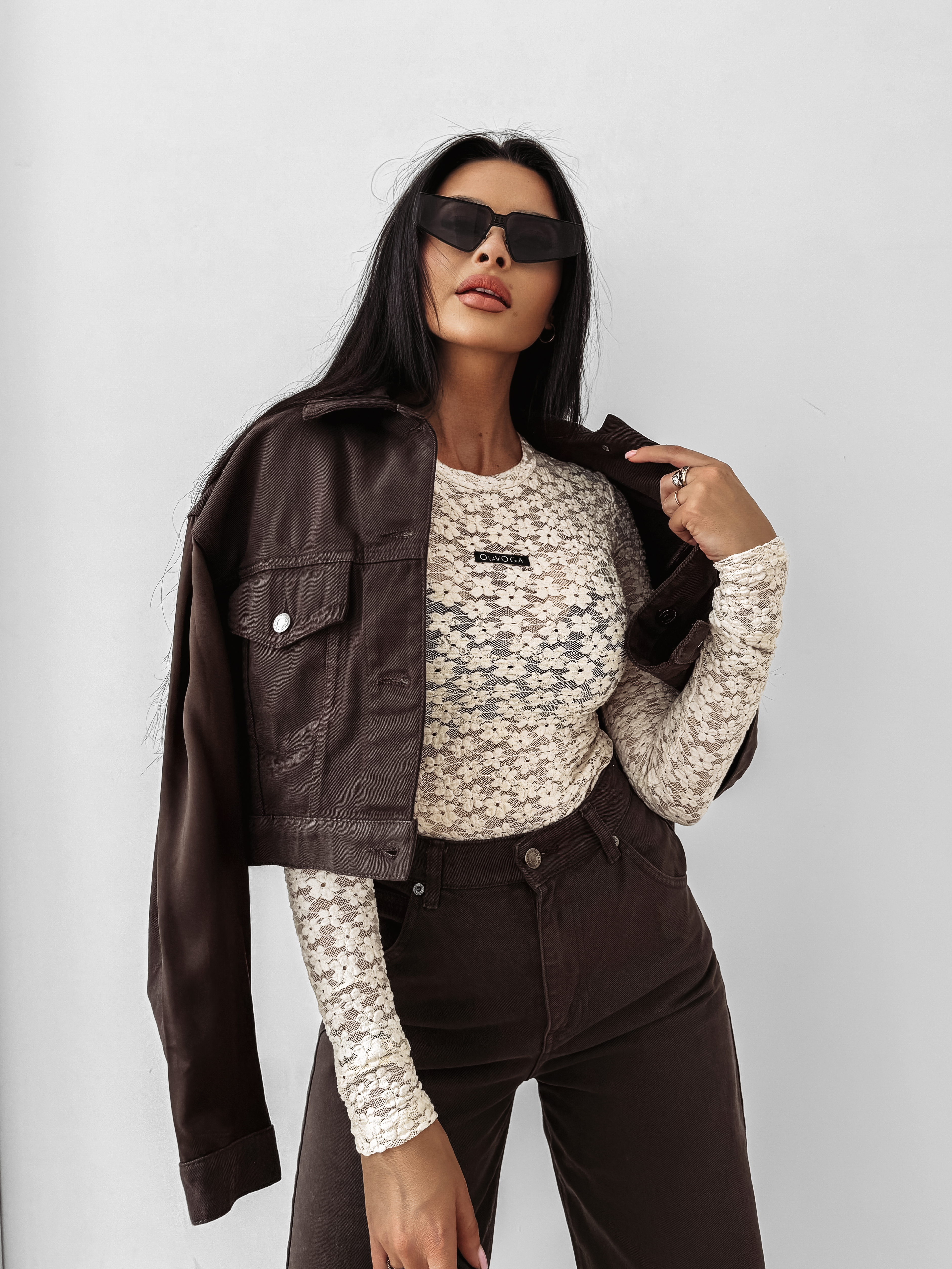 Idealnie przylegające body z długim rękawem. Wykonane z wysokiej jakości elastycznej koronki w kwiatowy wzór. Na przodzie subtelna metka z logo marki OLAVOGA.