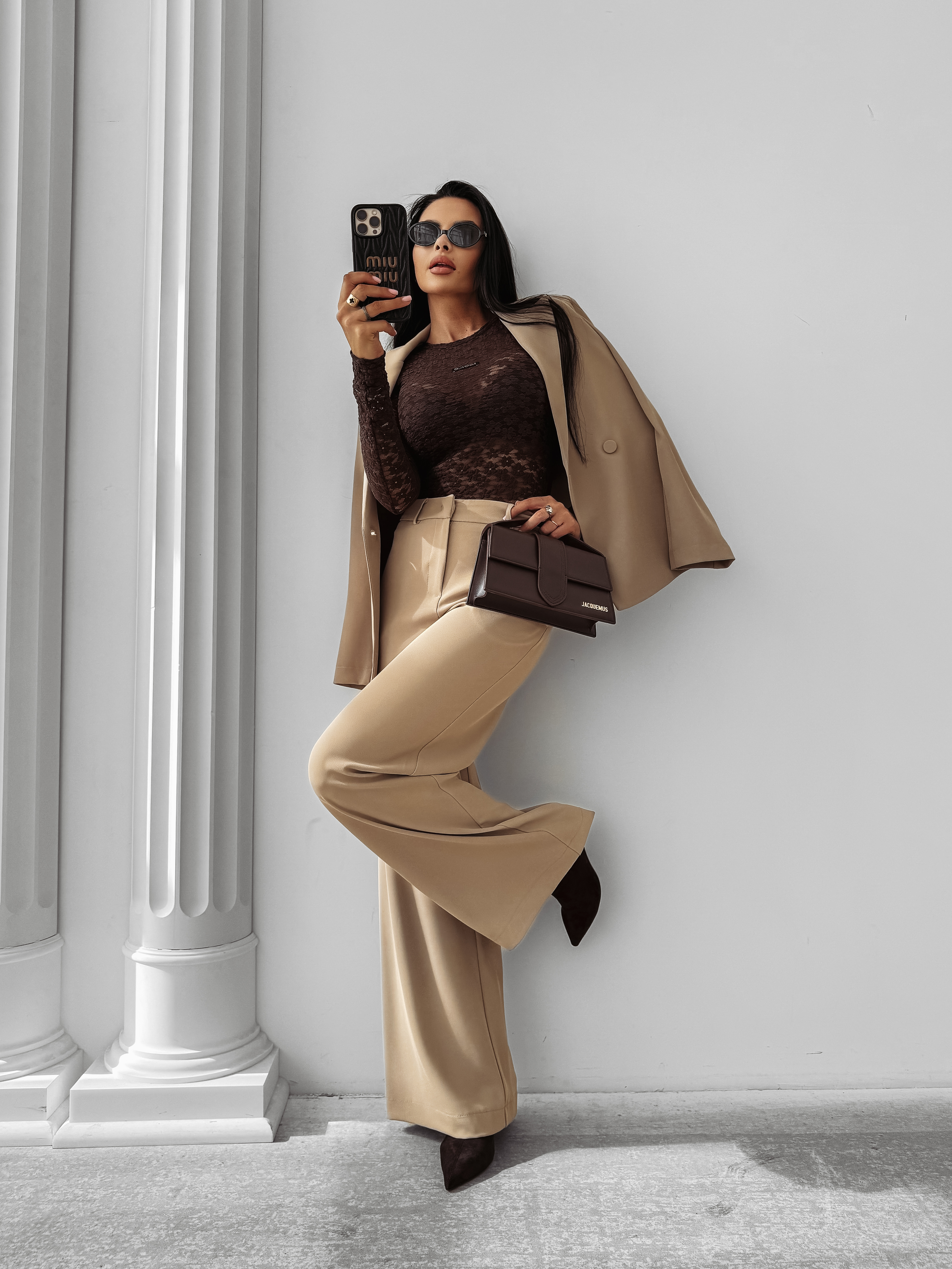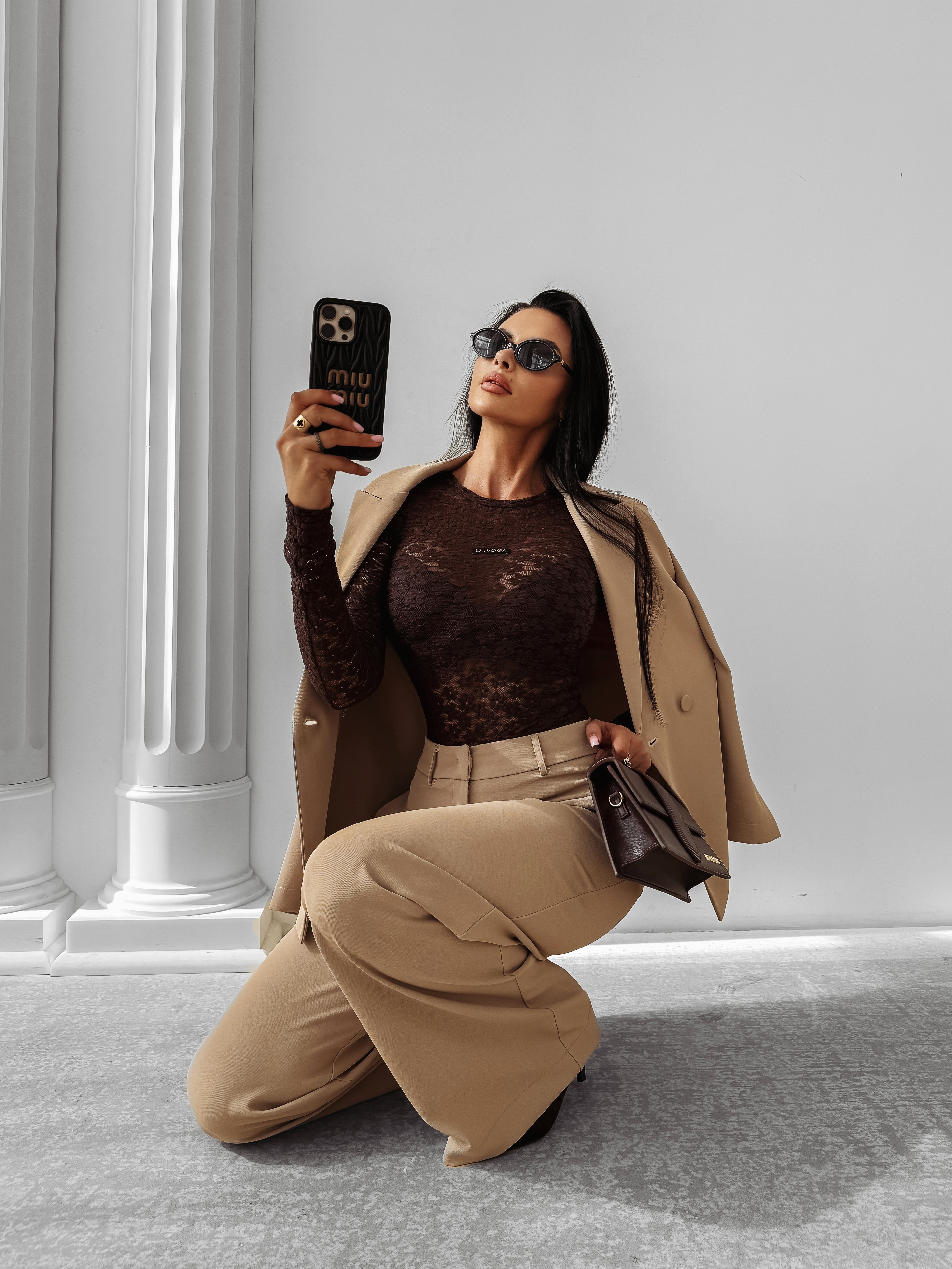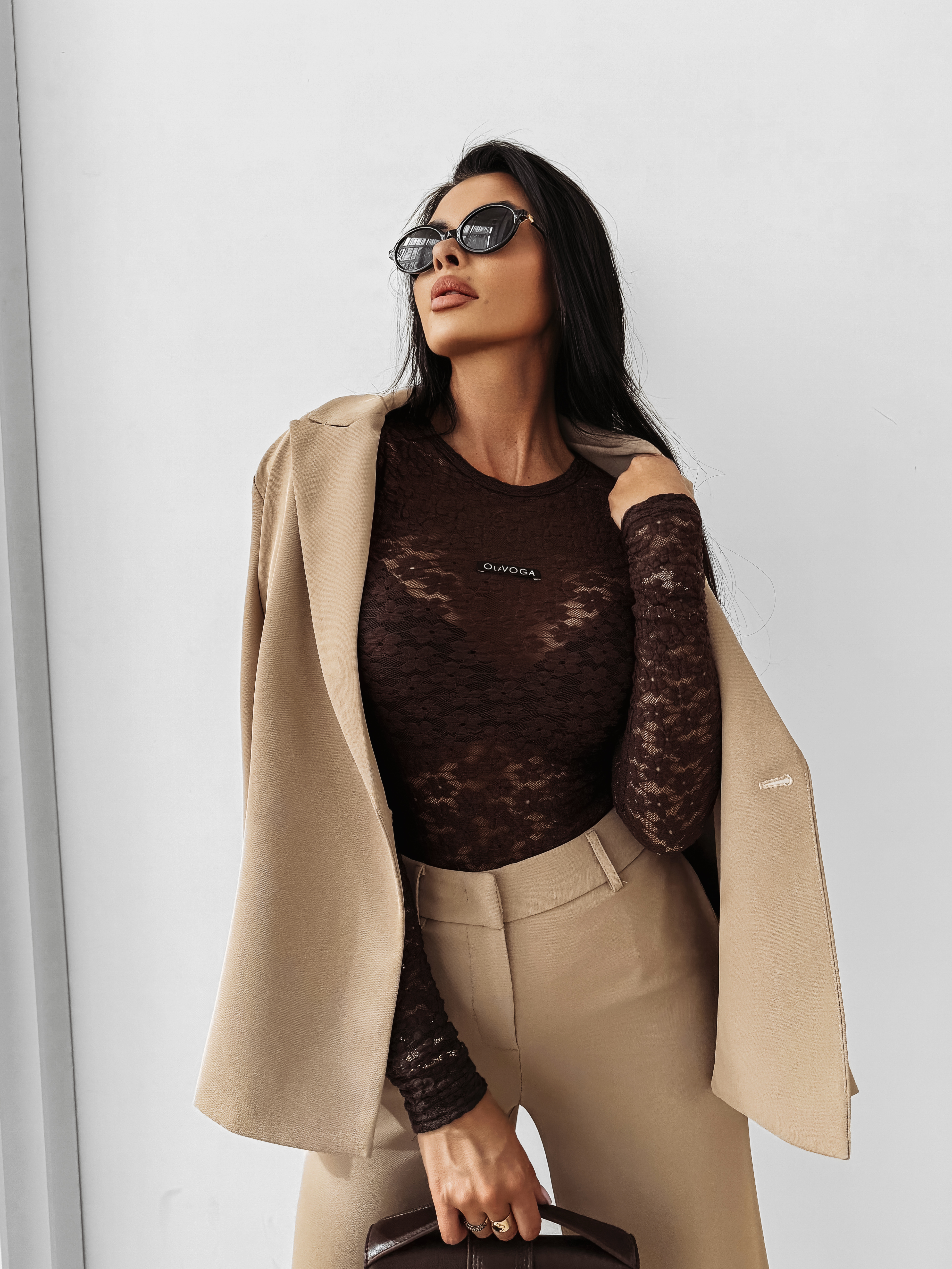 Idealnie przylegające body z długim rękawem. Wykonane z wysokiej jakości elastycznej koronki w kwiatowy wzór. Na przodzie subtelna metka z logo marki OLAVOGA.