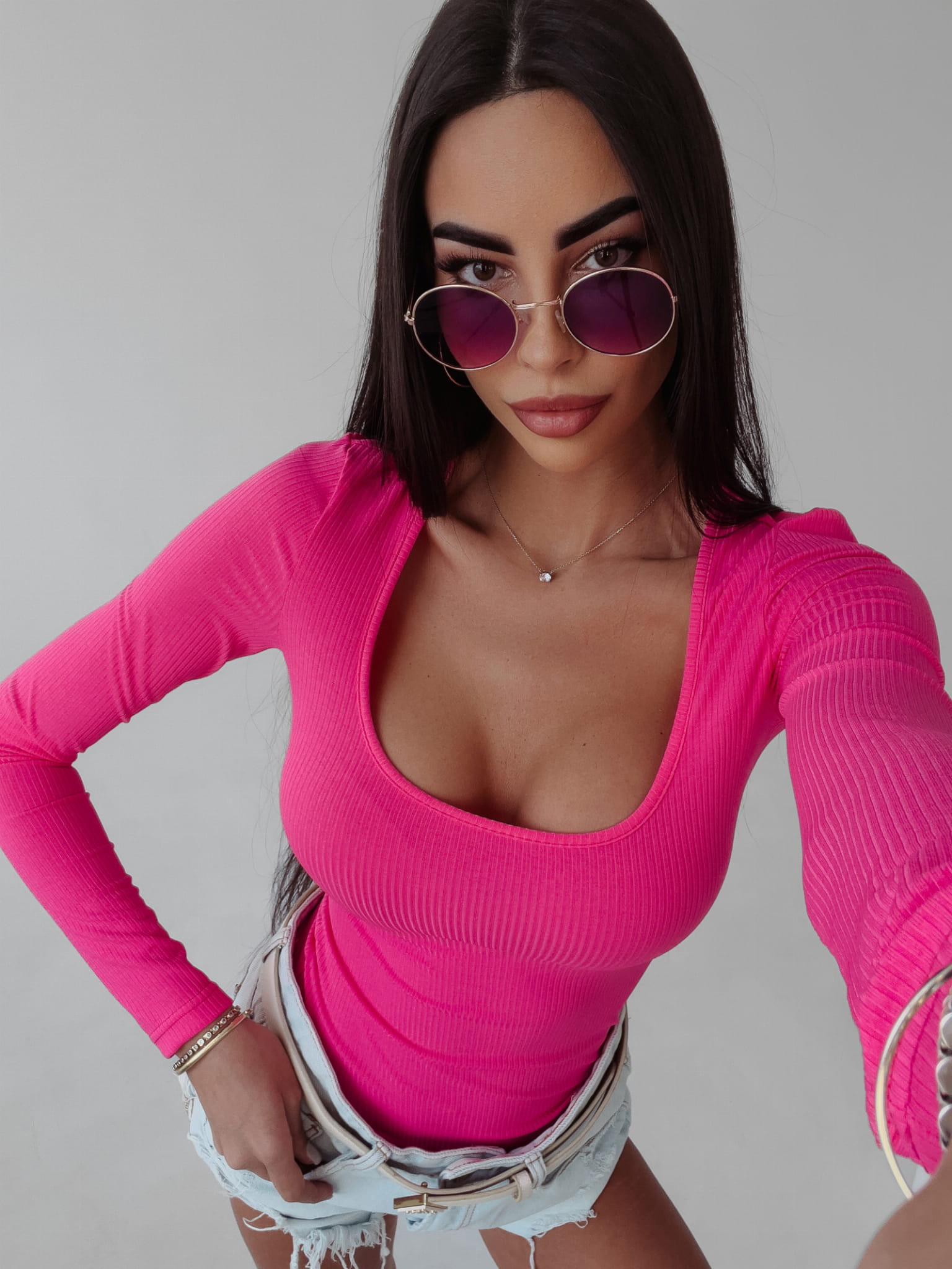 Klasyczne body z długim rękawem i głęboką, prostą linią dekoltu. Uszyte z prążkowanego materiału. Na tyle dyskretny haft z logo marki. Baza do stworzenia wielu stylizacji.
