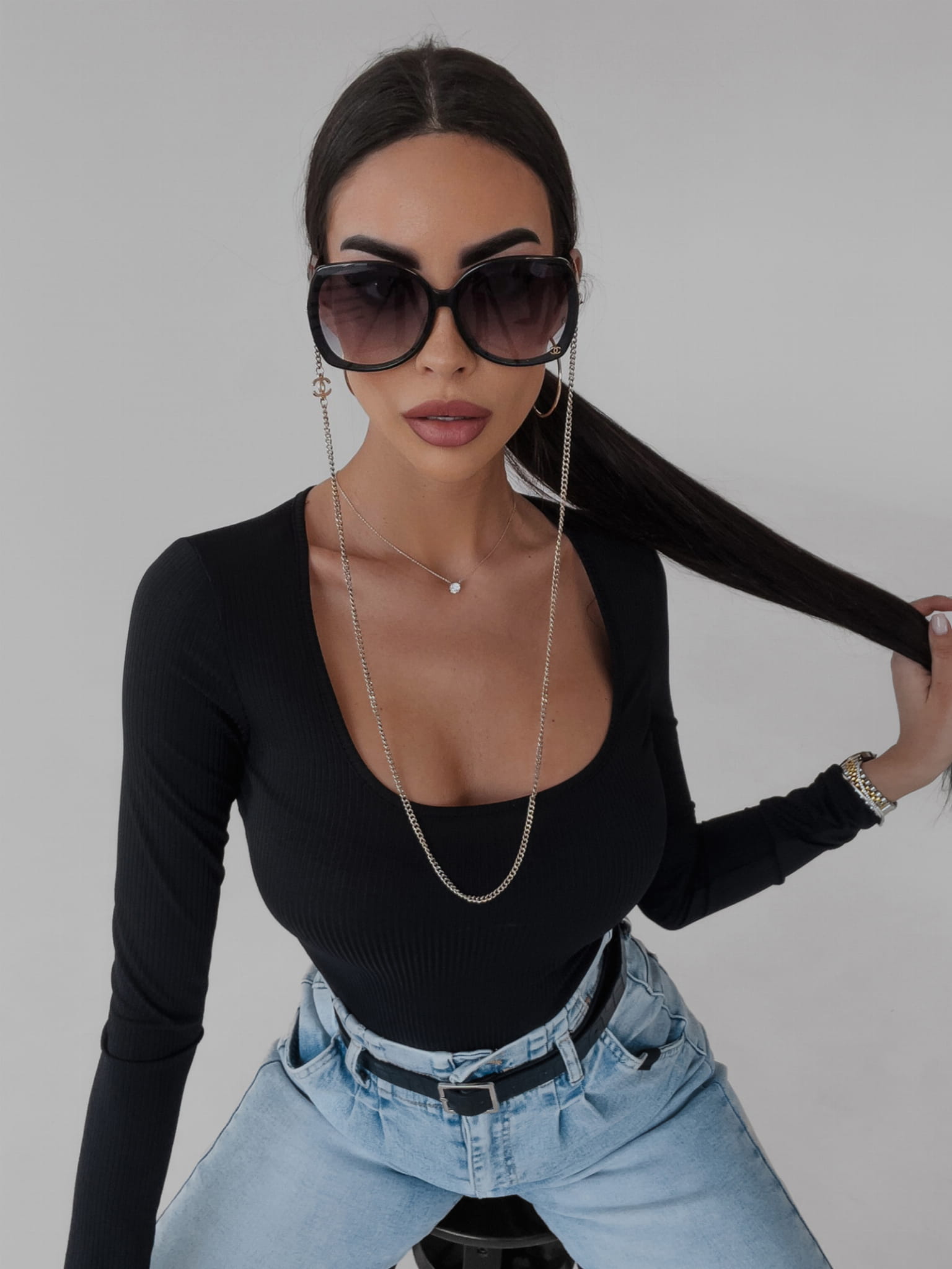 Klasyczne body z długim rękawem i głęboką, prostą linią dekoltu. Uszyte z prążkowanego materiału. Na tyle dyskretny haft z logo marki. Baza do stworzenia wielu stylizacji.