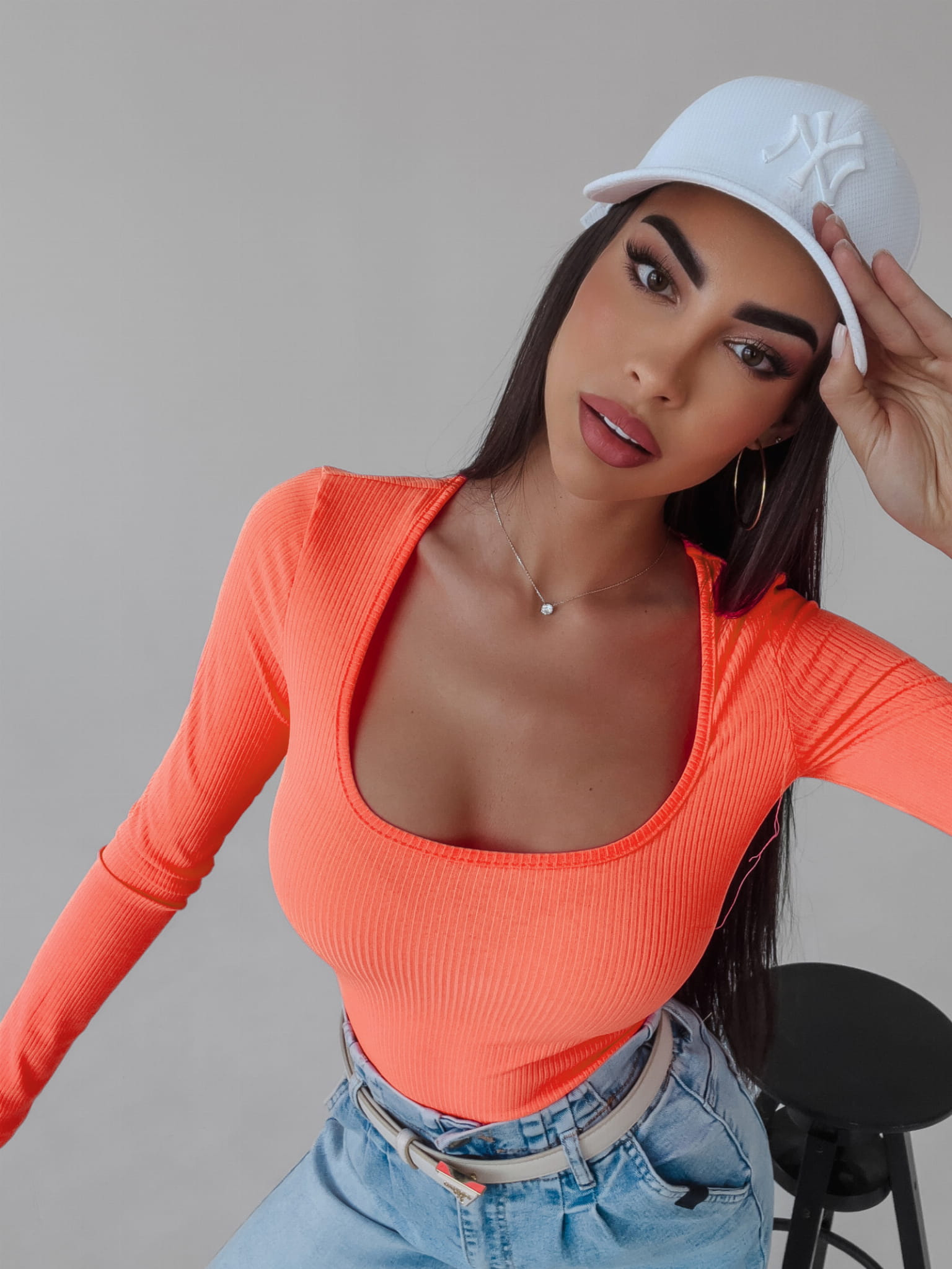 Klasyczne body z długim rękawem i głęboką, prostą linią dekoltu. Uszyte z prążkowanego materiału. Na tyle dyskretny haft z logo marki. Baza do stworzenia wielu stylizacji.