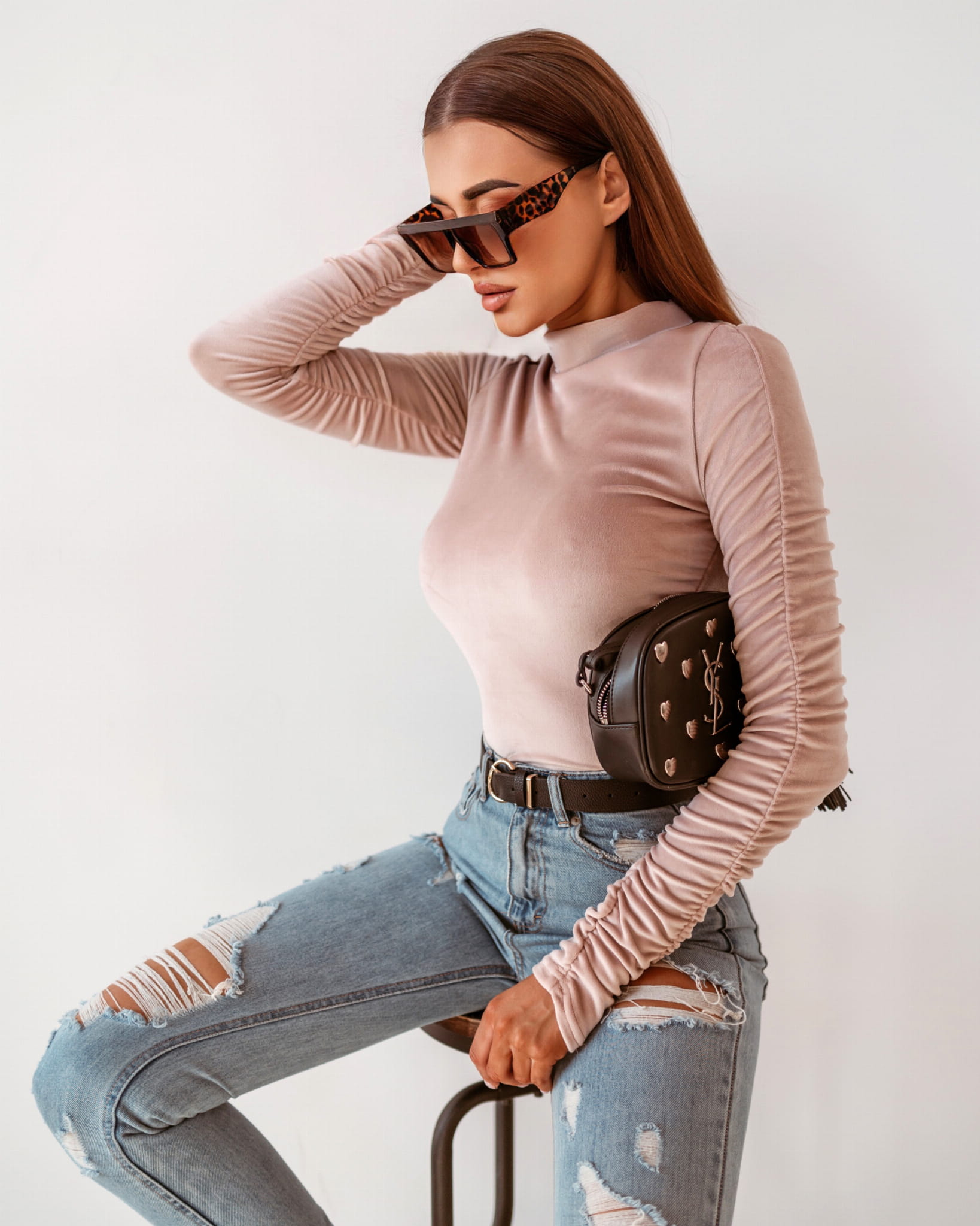 Welurowe body GATHERED SLEEVES z półgolfem oraz niesamowicie ciekawymi długimi i marszczonymi rękawami, które dodadzą wyjątkowości Twojemu outfitowi. Możesz je łączyć ze spodniami, legginsami jak i spódniczką.