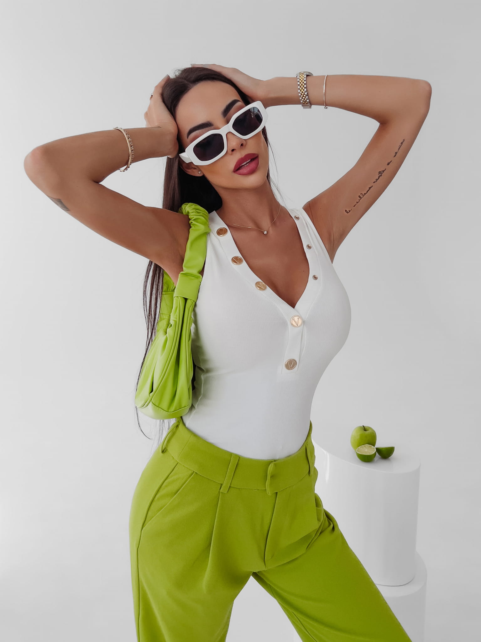 Rozpinane, podkreślające atuty sylwetki body uszyte z najwyższej jakości prążkowanej dzianiny bawełnianej. Na przodzie ozdobione złotymi, logowanymi napami. Must have wiosennej garderoby.