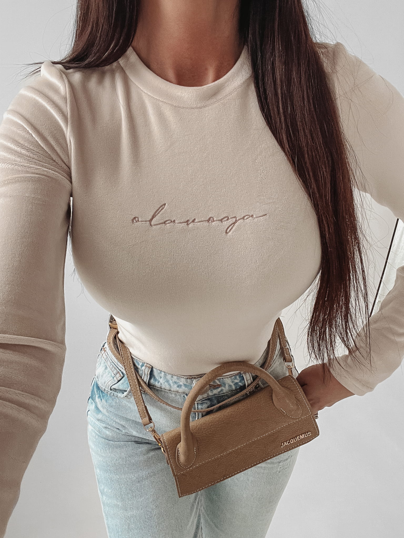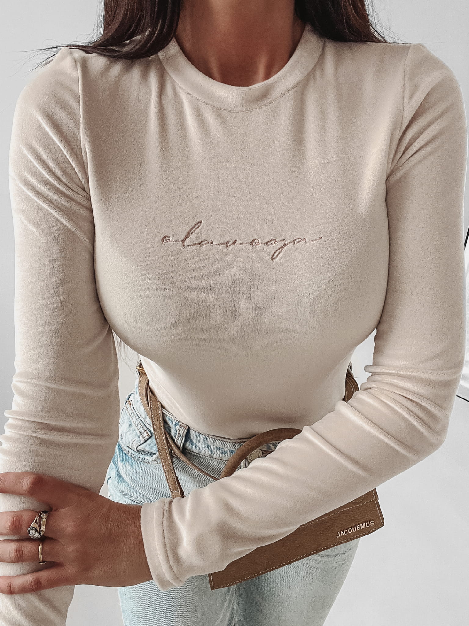 Dopasowane, idealnie przylegające body z wysokiej jakości weluru z pisanym, haftowanym logo w kolorze różowego złota. Sprawdzi się zarówno w tworzeniu sportowych, jak i wieczorowych stylizacji.