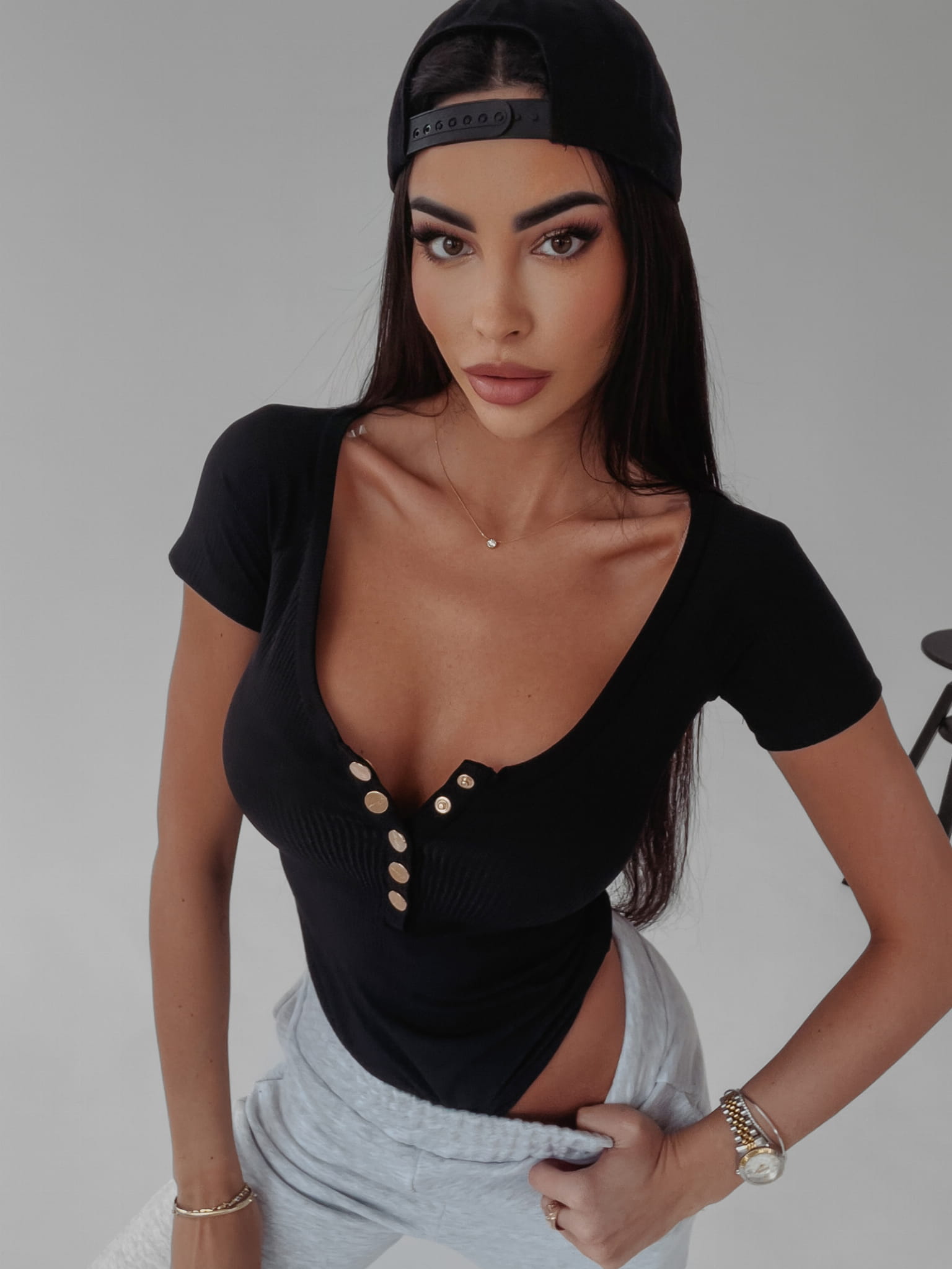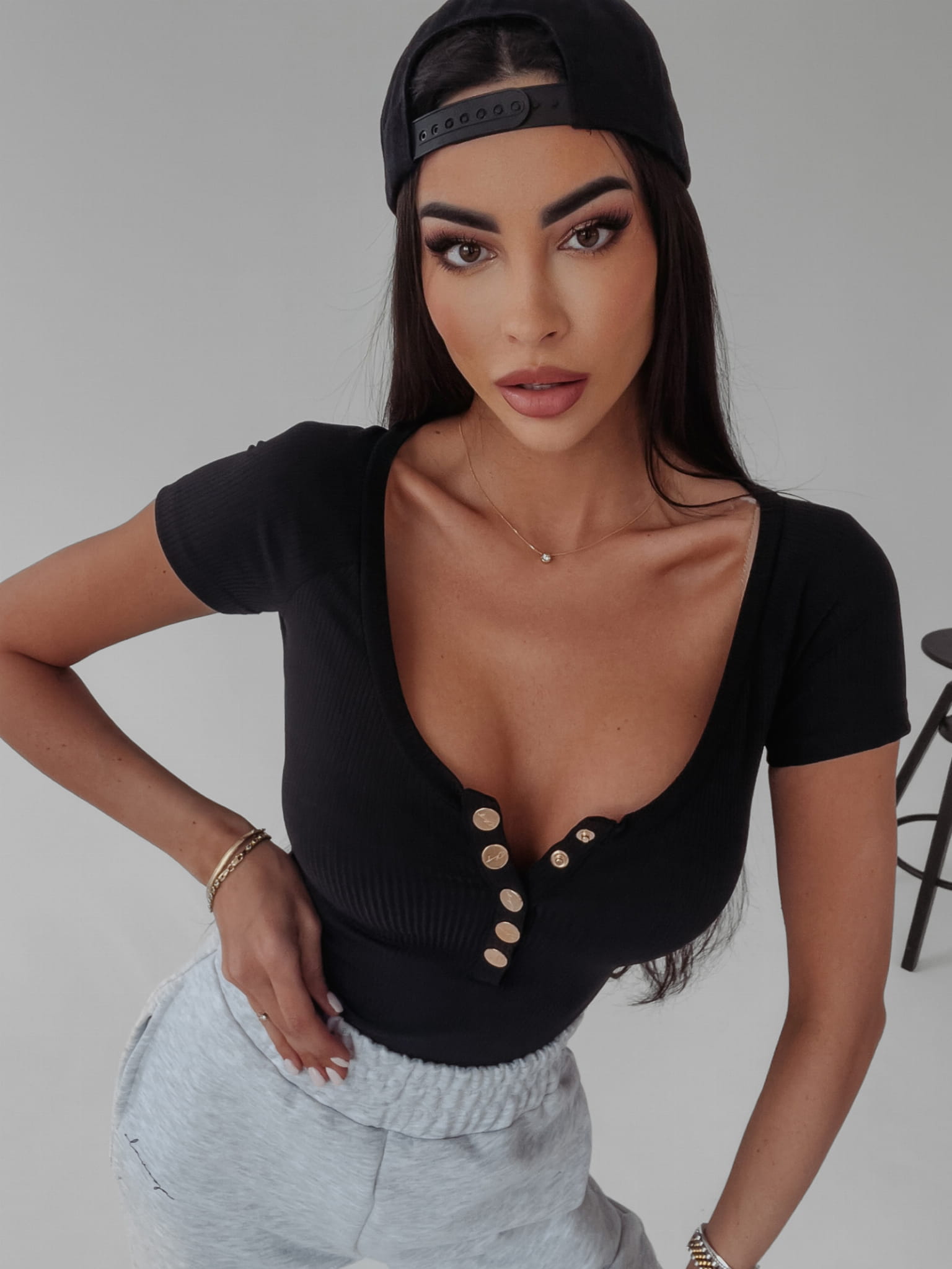 Dopasowane, podkreślające atuty sylwetki body uszyte z najwyższej jakości prążkowanej dzianiny bawełnianej. Krótki rękaw, model zapinany na złote, logowane guziki. Stanowi ciekawe dopełnienie dla wielu stylizacji.
