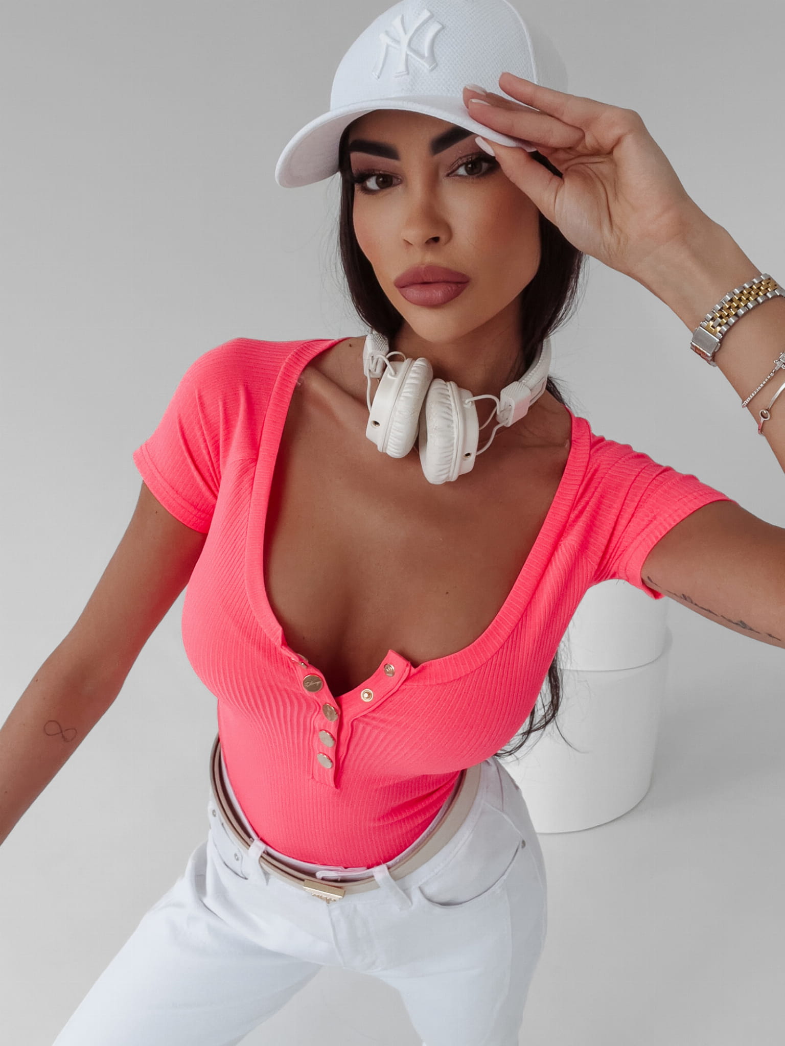 Dopasowane, podkreślające atuty sylwetki body uszyte z najwyższej jakości prążkowanej dzianiny bawełnianej. Krótki rękaw, model zapinany na złote, logowane guziki. Stanowi ciekawe dopełnienie dla wielu stylizacji.