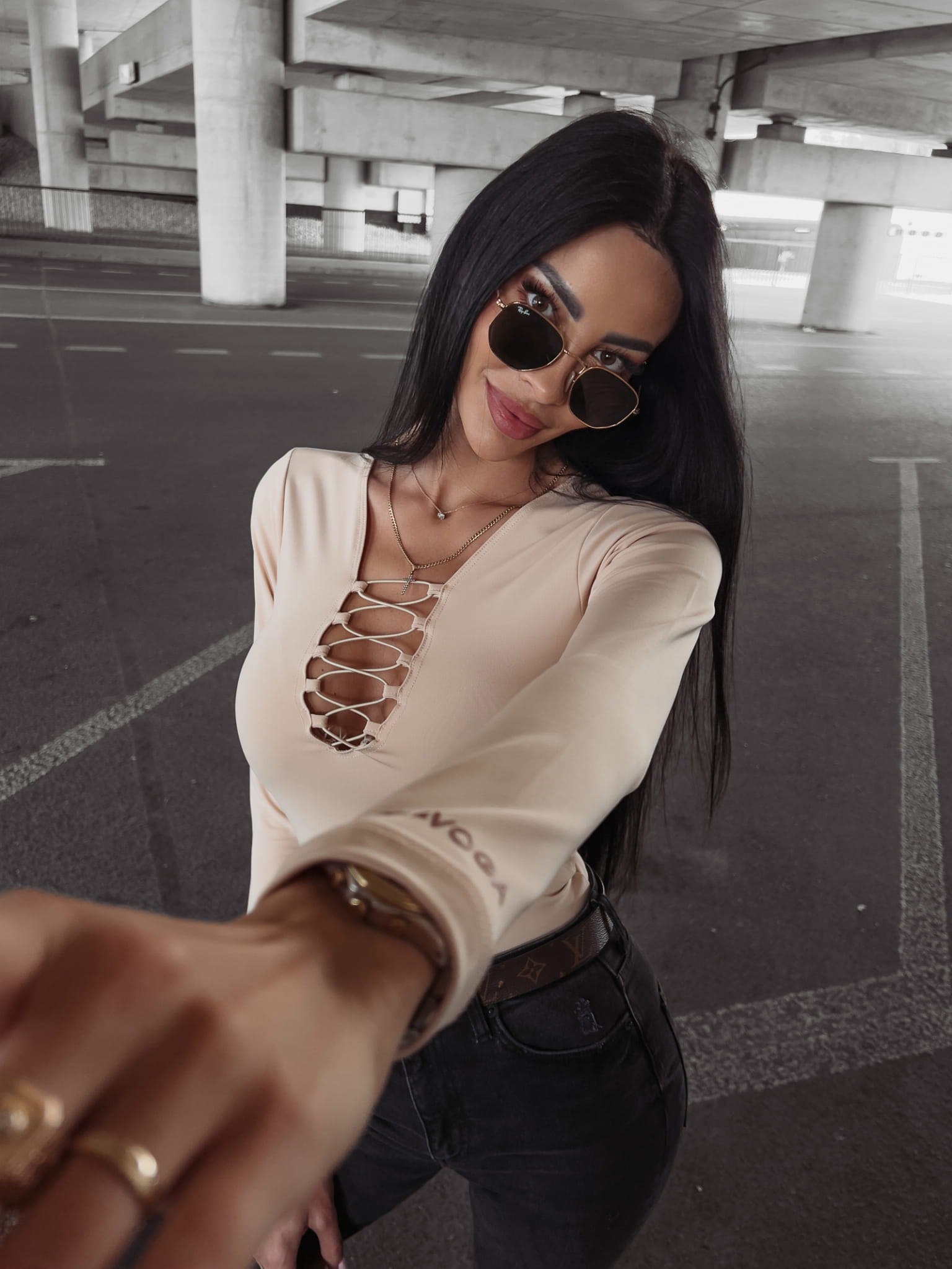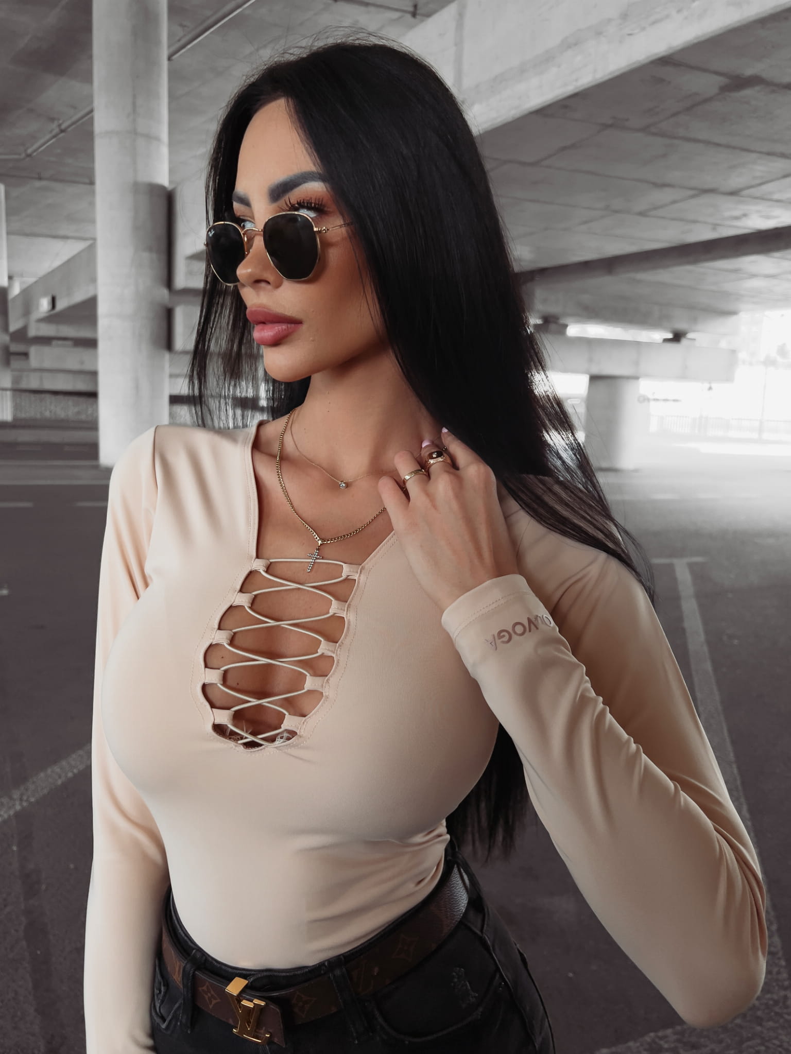 Gładkie, dopasowane body z wiązaniem z przodu, dodającym pazura stylizacji. Na rękawie aplikacja z napisem OLAVOGA. Elastyczny materiał podkreślający atuty sylwetki.