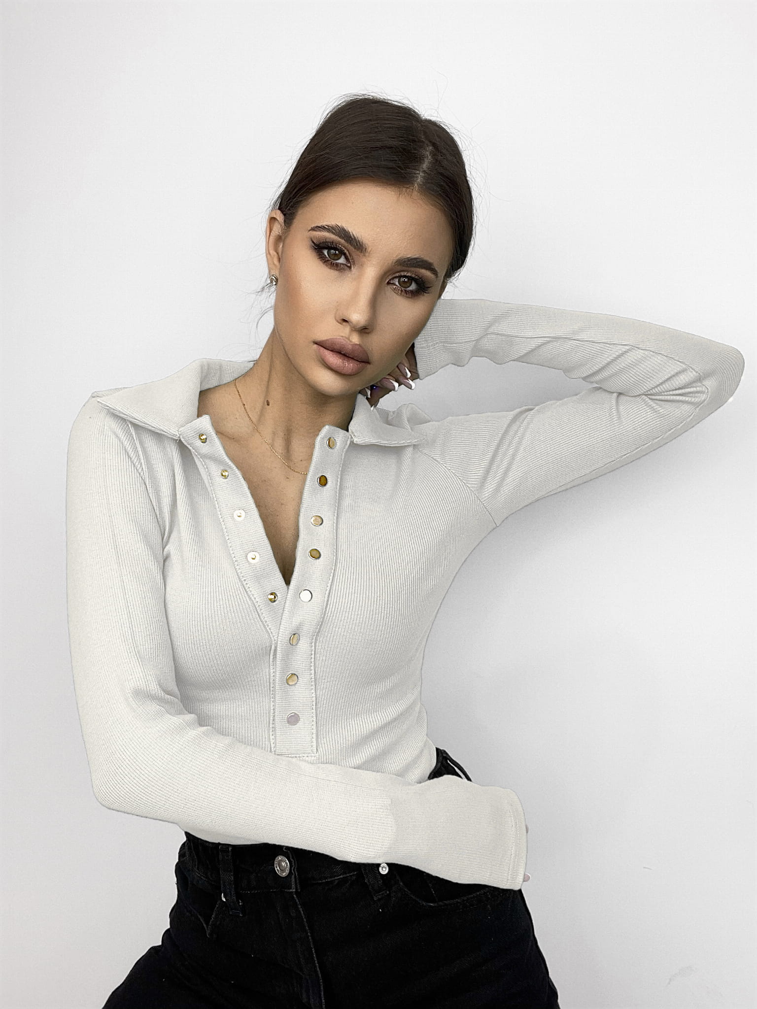 Eleganckie body „LUNA” to model który przyda się każdej kobiecie. Dopasowany do ciała z długim rękawem i kołnierzykiem będzie idealnym wyborem do biznesowych stylizacji. Ozdobne zapięcia z przodu dodają mu blasku.