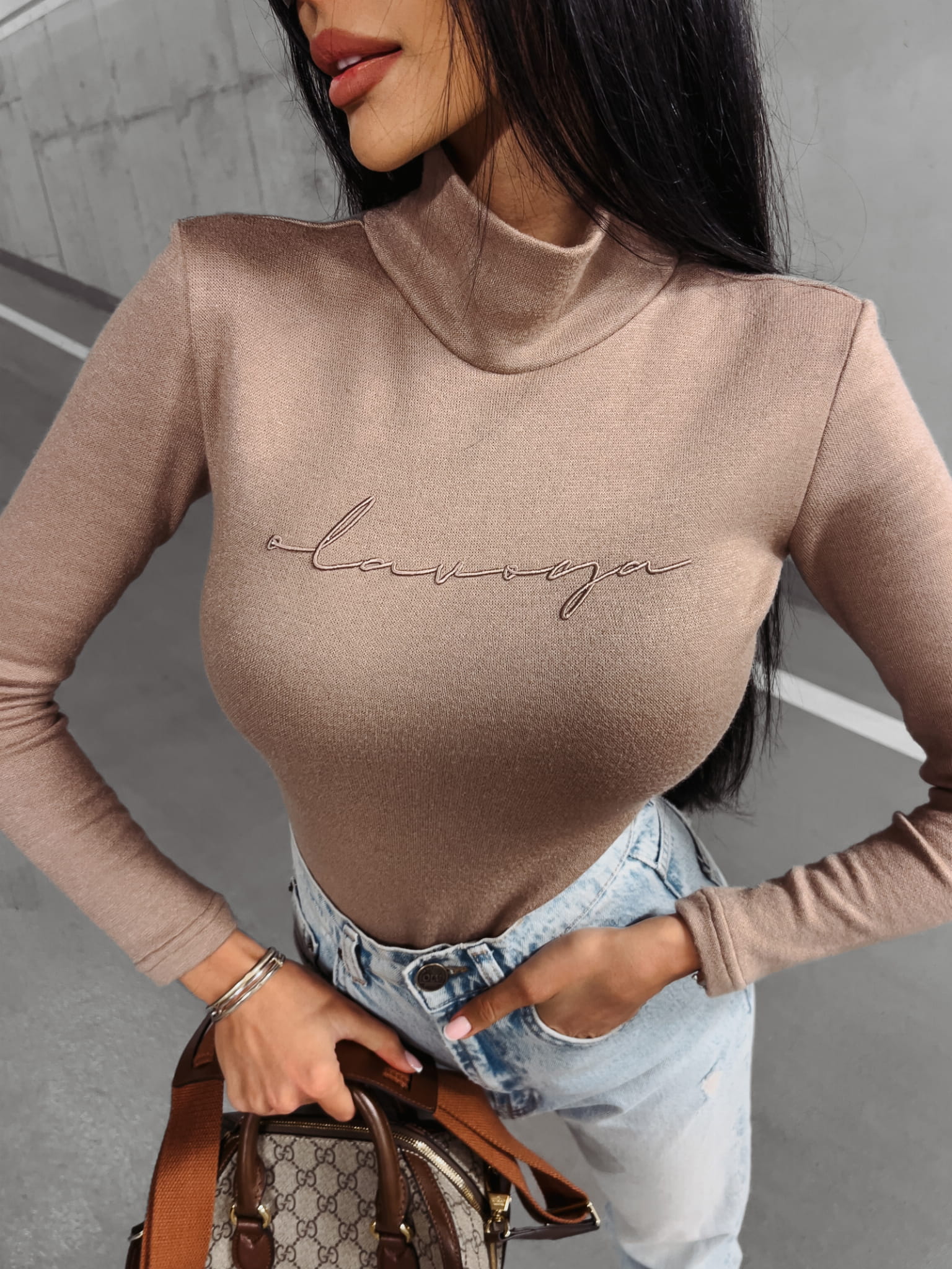 Dopasowane body z golfem, uszyte z przyjemnej w dotyku dzianiny swetrowej. Na przodzie delikatny haft 3d z pisanym logo marki OLAVOGA.