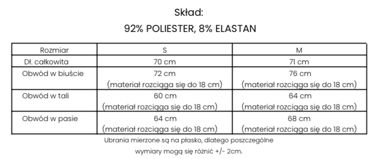 Body uszyte z prążkowanego materiału, z głębokim, kwadratowym dekoltem. Szerokie ramiączka wysmuklają ramiona. W zależności od dobranych dodatków, model ten sprawdzi się zarówno do sportowych, jak i casualowych stylizacji.